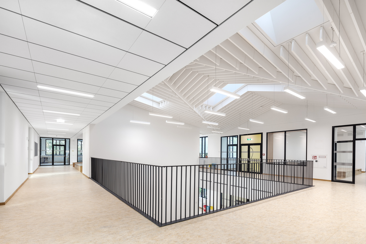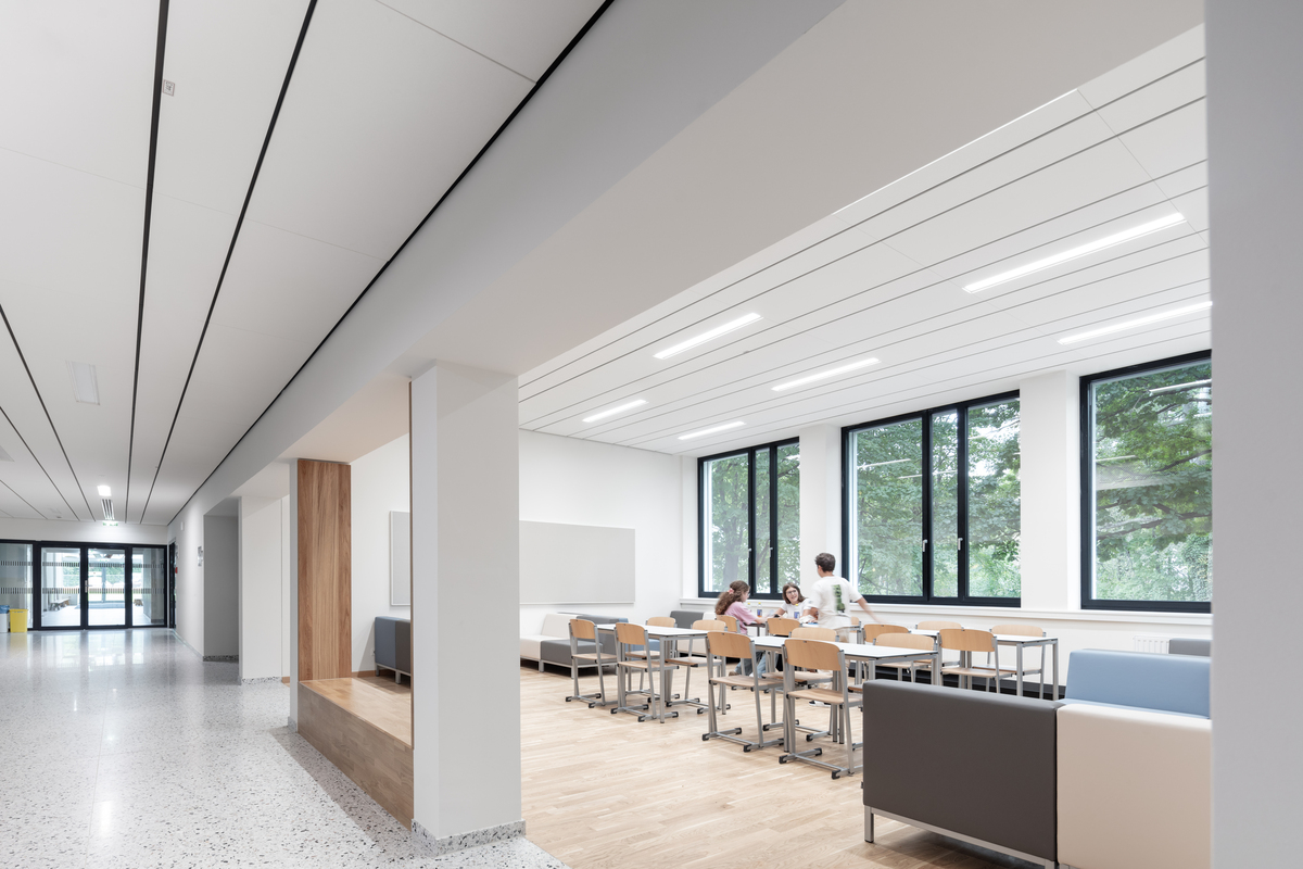 Die akustischen Lösungen wurden zudem in die architektonische Gestaltung integriert. Lineare Deckenlayouts und dezent platzierte Baffeln unterstützen sowohl die Funktion als auch das gestalterische Konzept. In Kombination mit der verbesserten Gebäudeperformance und einer neu organisierten Raumstruktur zeigt das Projekt, wie durchdachte Modernisierung und gezielt geplante Akustik eine robuste, zukunftsorientierte Lernumgebung schaffen können.