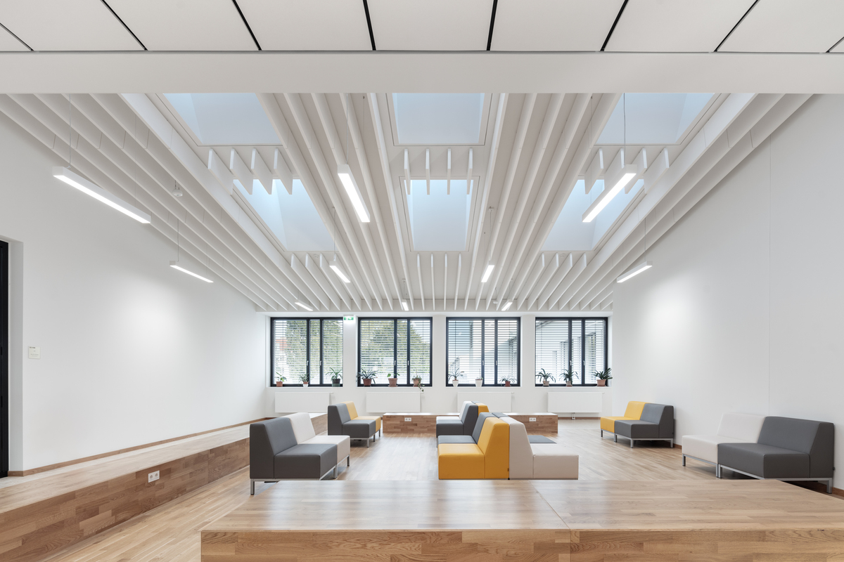 Eine zentrale Rolle spielte die Akustik als Grundlage für Konzentration und Komfort. In Klassenräumen, Fluren und Gemeinschaftsbereichen wurden Ecophon Focus Lp Decken, Ecophon Solo Baffle sowie Ecophon Akusto Wall A montiert, um Nachhall zu reduzieren und Geräusche gezielt zu kontrollieren. Architekt Christoph Hinterreitner beschreibt den Effekt so: