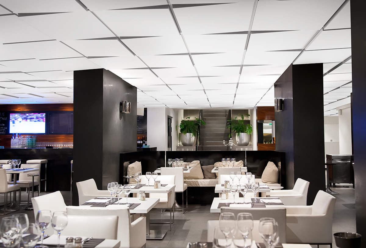 Mit Ecophon Focus™ Ez kombinieren Sie raumakustischen Komfort und atemberaubendes Design. Es entstand ein neues Produkt mit schräg verlaufendem Kantendesign, die eine "Zick-Zack-Verlegung" der Akustikdecke ermöglicht und damit einen einzigartigen Raumeindruck kreiert.