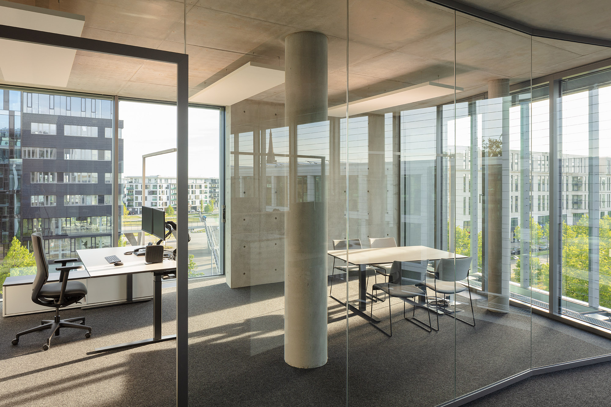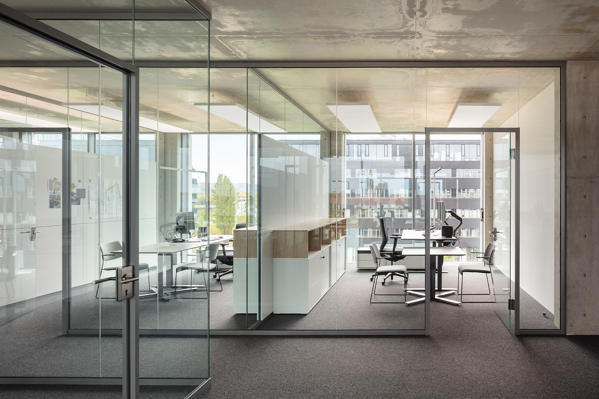 Zwischen den Arbeitsplätzen an den Fenstern und der Mittelzone befindet sich manchmal eine Glaswand, die wenigsten Zwischenwände sind geschlossen.