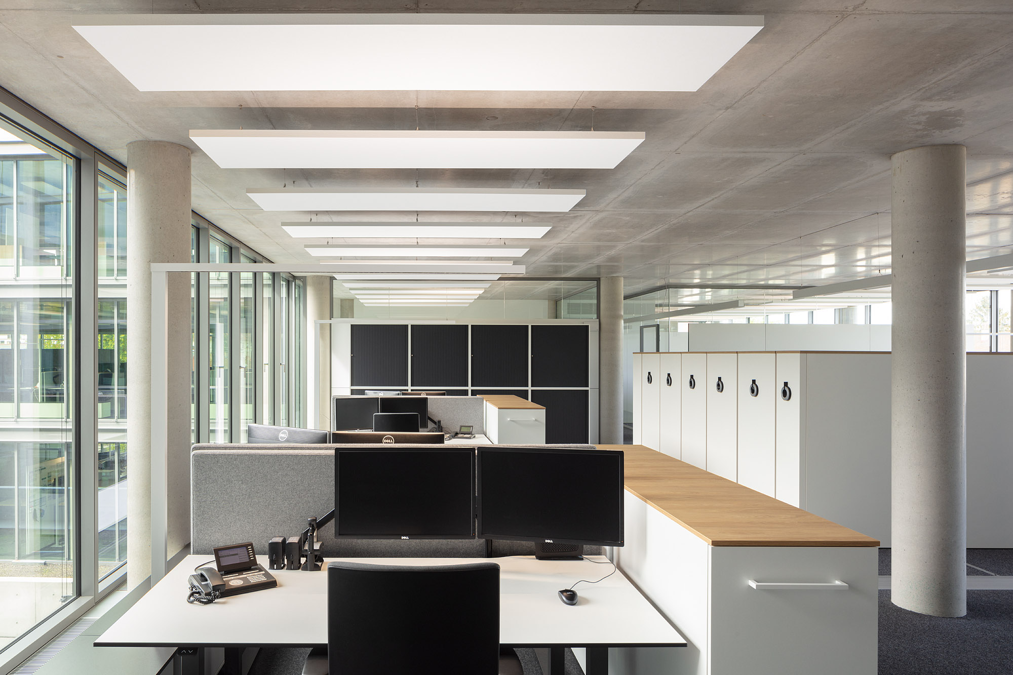 Frühzeitig wurden auch Bedenken seitens der Mitarbeiter:innen wegen einer möglichen Lärmbelastung wahrgenommen – gerade wegen der schallharten Oberflächen. Besagte Raumteiler beispielsweise sind entsprechend gepolstert und wie die Trennwände zwischen Mitarbeiter:innen mit Stoff bespannt. Auch ein grauschwarzer Nadelfilz als Bodenbelag sorgt für ein wenig Schallreduzierung. Weil aber eine Betonkernaktivierung in den Decken der Grundtemperierung dient, konnten diese nicht zur Reduktion von Schallpegel und Nachhallzeit herangezogen werden. (Eine individuelle Temperaturregelung erfolgt durch Bodenkanal konvektoren sowie 10 cm breite Lüftungsflügel in den Fenstern). Die Hauptlast der Schallabsorption übernehmen deshalb die rechteckigen Deckensegel der Firma Ecophon.