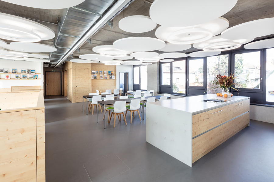 Der naturbelassene Beton, die Farben Grau, Weiß und Anthrazit an den Materialien und Oberflächen geben den Räumen eine sachliche Atmosphäre, dem die individuell entworfenen Einbauten in Astfichte als sehr wohnliche Komponente gegenüberstehen.