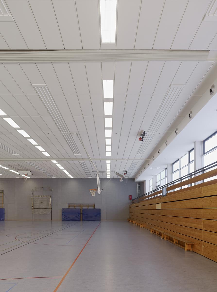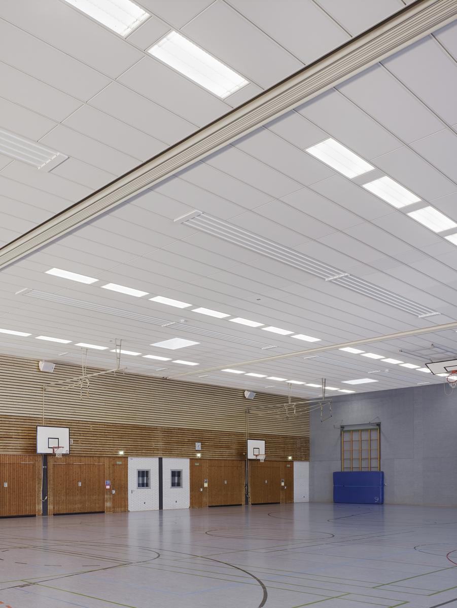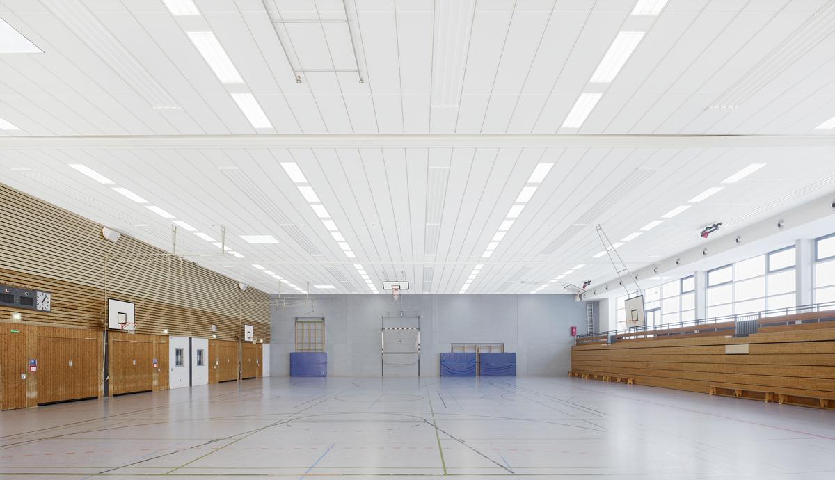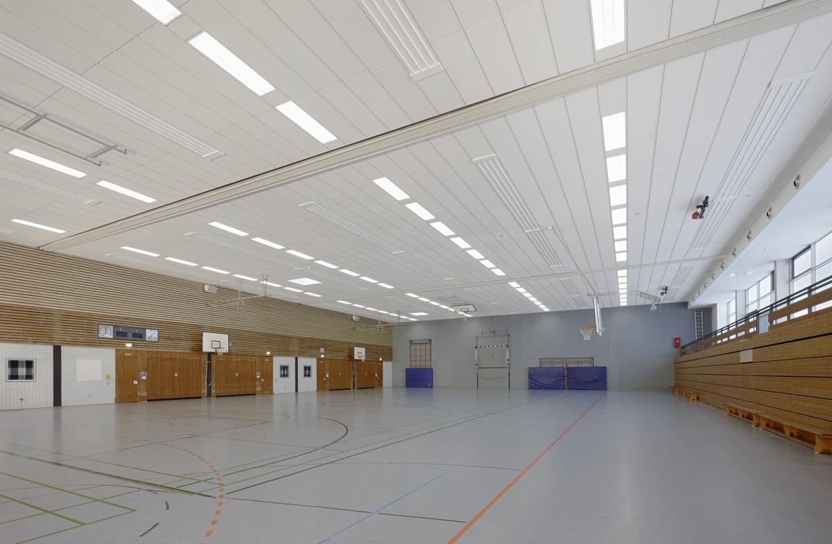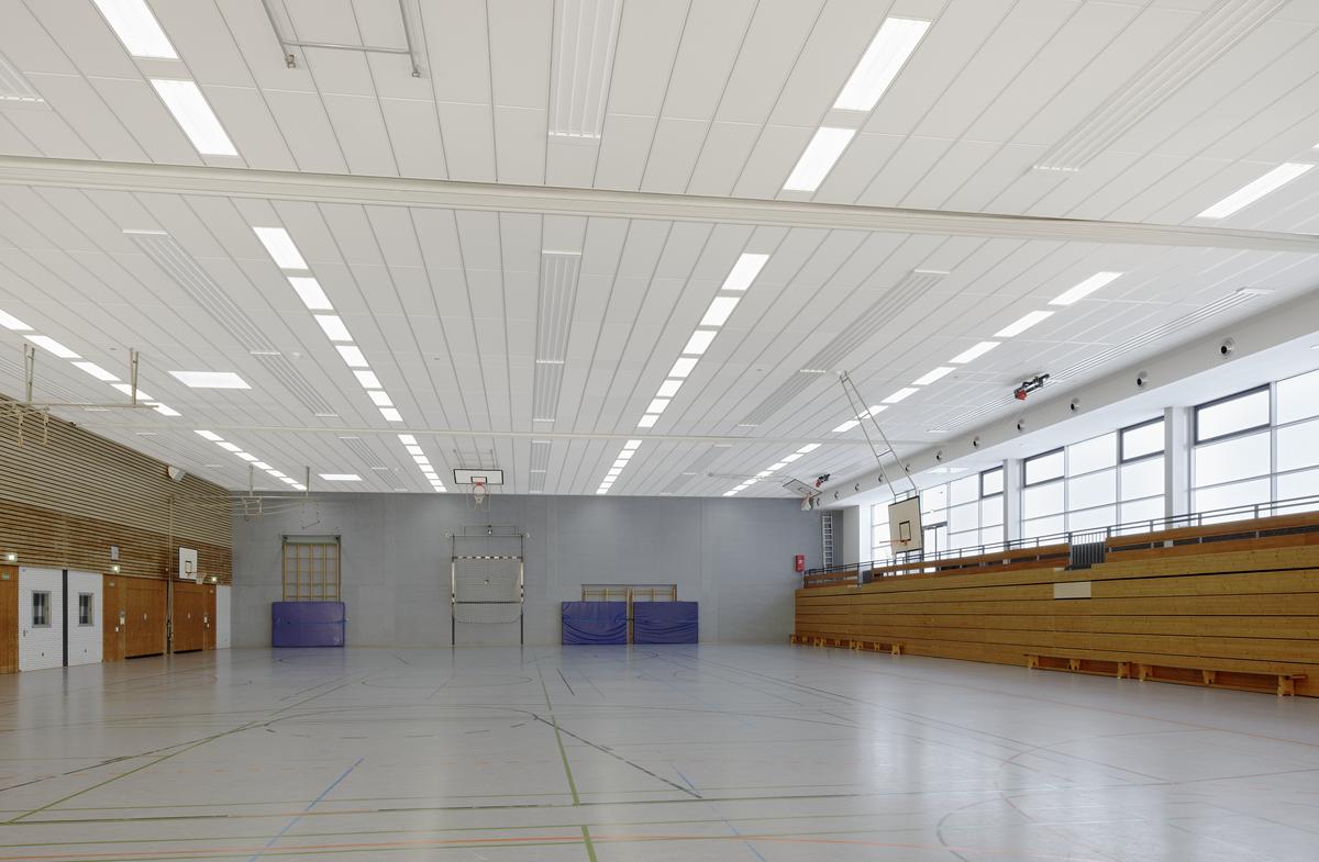 Mit einer höchstwirksamen Akustikdecke wollten die Architekten bei der Sanierung der Sporthalle zugunsten sehr guter Sprachverständlichkeit, hoher Schallabsorption und räumlicher Pegelminderung nicht nur auf Nummer Sicher gehen, sondern auch für Raumakustischen Komfort sorgen, der den Menschen und seine Aktivität im Raum in den Mittelpunkt stellt.