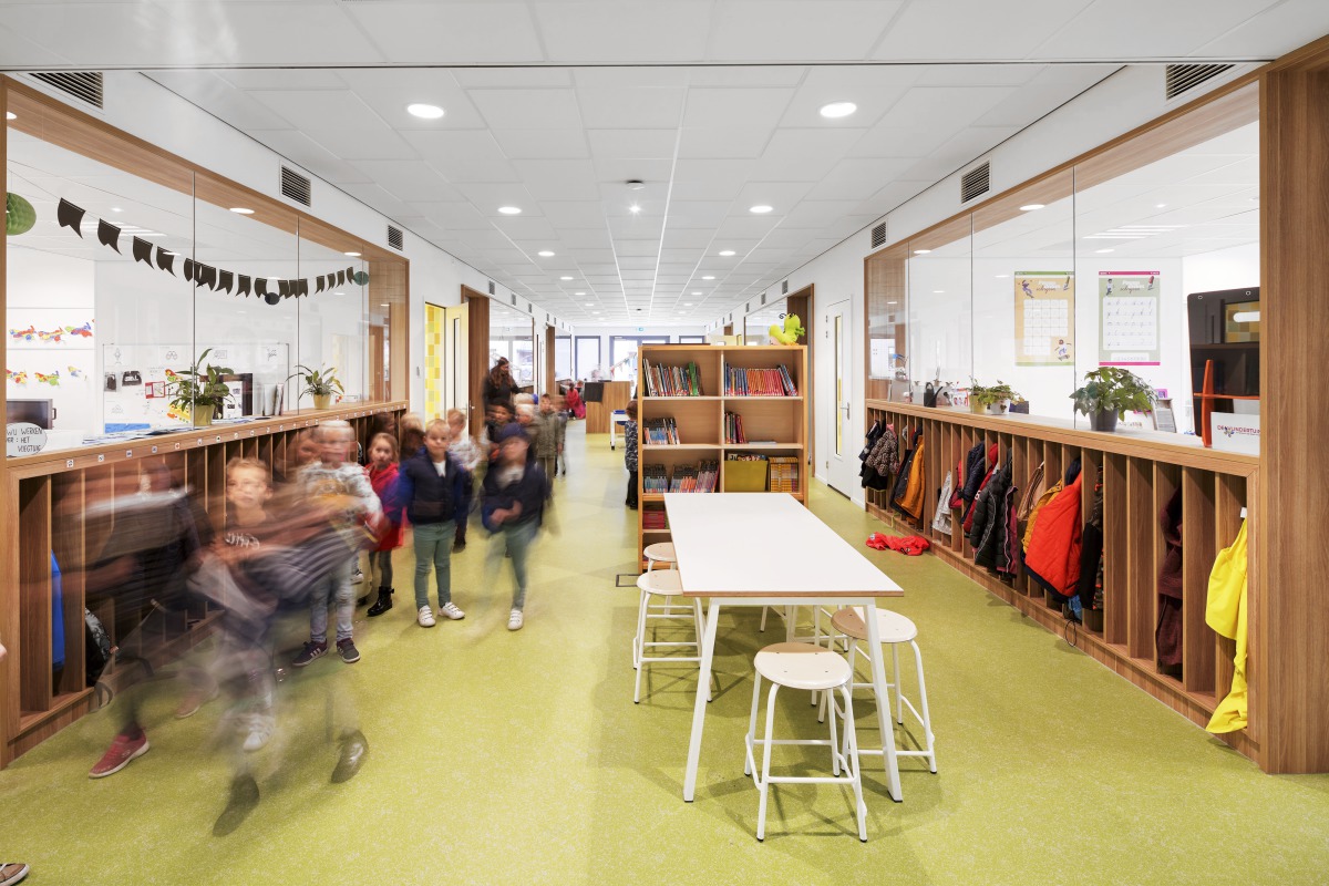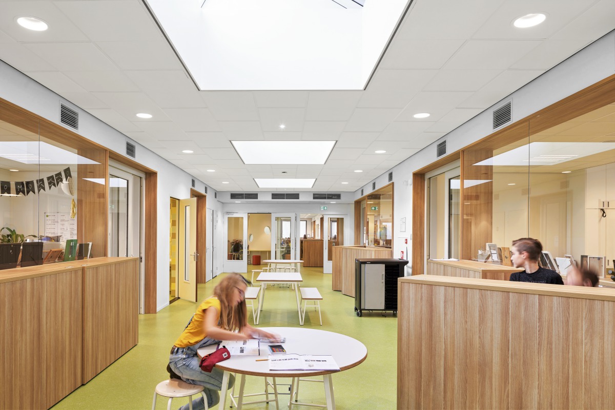 Es wurde viel über die Schaffung einer guten akustischen Umgebung nachgedacht. Da das Gebäude so vielen verschiedenen Gruppen dient, ist es wichtig, dass ihre Aktivitäten sich nicht gegenseitig stören. Die für die Klassenräume gewählte abgehängte Decke besteht aus Ecophon Gedina A-Platten mit einem Ecophon Extra Bass Tieftonabsorber oben, der besonders effektiv Lärm im 125-Hz-Frequenzbereich absorbiert. Diese Lösung wurde von Ecophon speziell für Klassenräume entwickelt und entspricht den Standards der Klasse B des niederländischen Frisse Scholen ("Frische Schulen") Programms. In der Praxis bedeutet dies, dass die Akustik gut ist (Klasse C ist der vom Baurecht geforderte Mindeststandard; Klasse A ist das Optimum). In den breiten Korridoren, die auch als Lernräume dienen, wurden Ecophon Focus E Deckenpaneele in einem versetzten Muster installiert, was nicht nur eine gute Akustik gewährleistet, sondern auch eine spielerische Atmosphäre schafft.