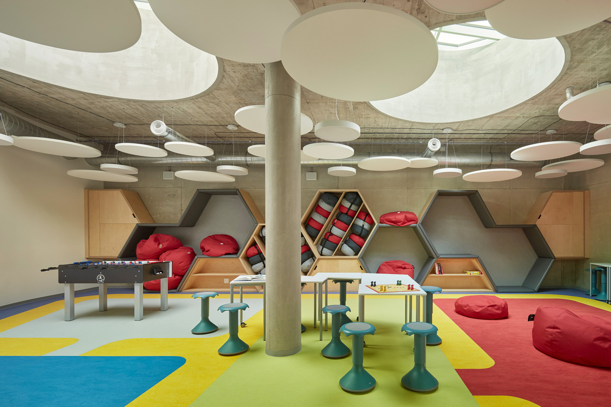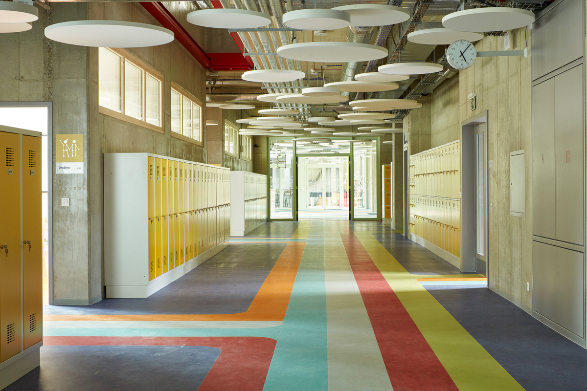 Im Inneren entfaltet sich die Schule wie ein aufgeschlagenes Lehrbuch. Sichtbare Konstruktionen und Installationen zeigen die technischen Abläufe des Gebäudes, während neutrale Möbel für Ausgleich sorgen. Die farbenfrohen Linoleumböden aus Naturmaterialien – gestaltet in Zusammenarbeit mit der Künstlerin Pavla Gregorová Šípová – bringen Lebendigkeit, Bewegung und Kreativität in die Räume.