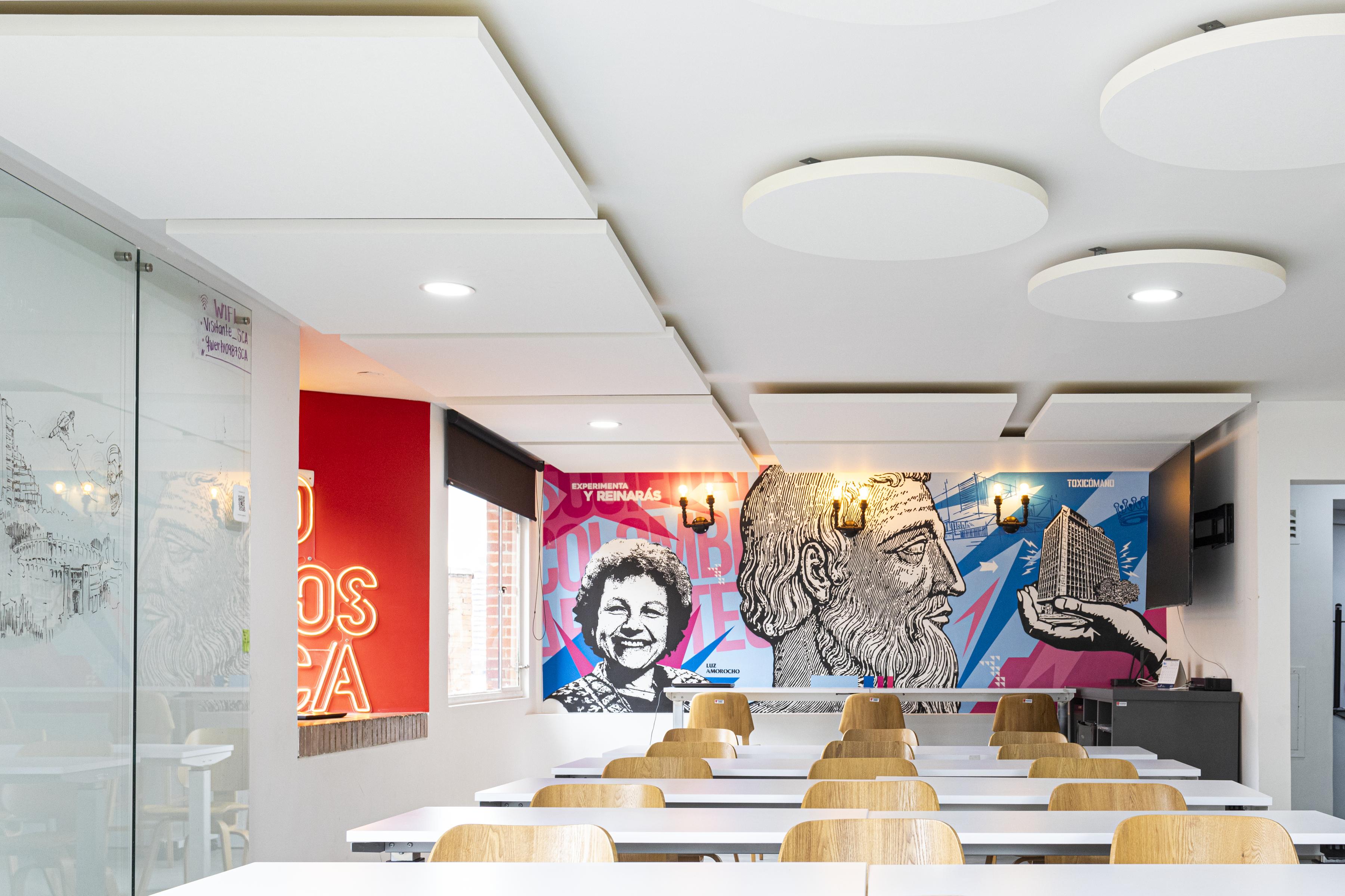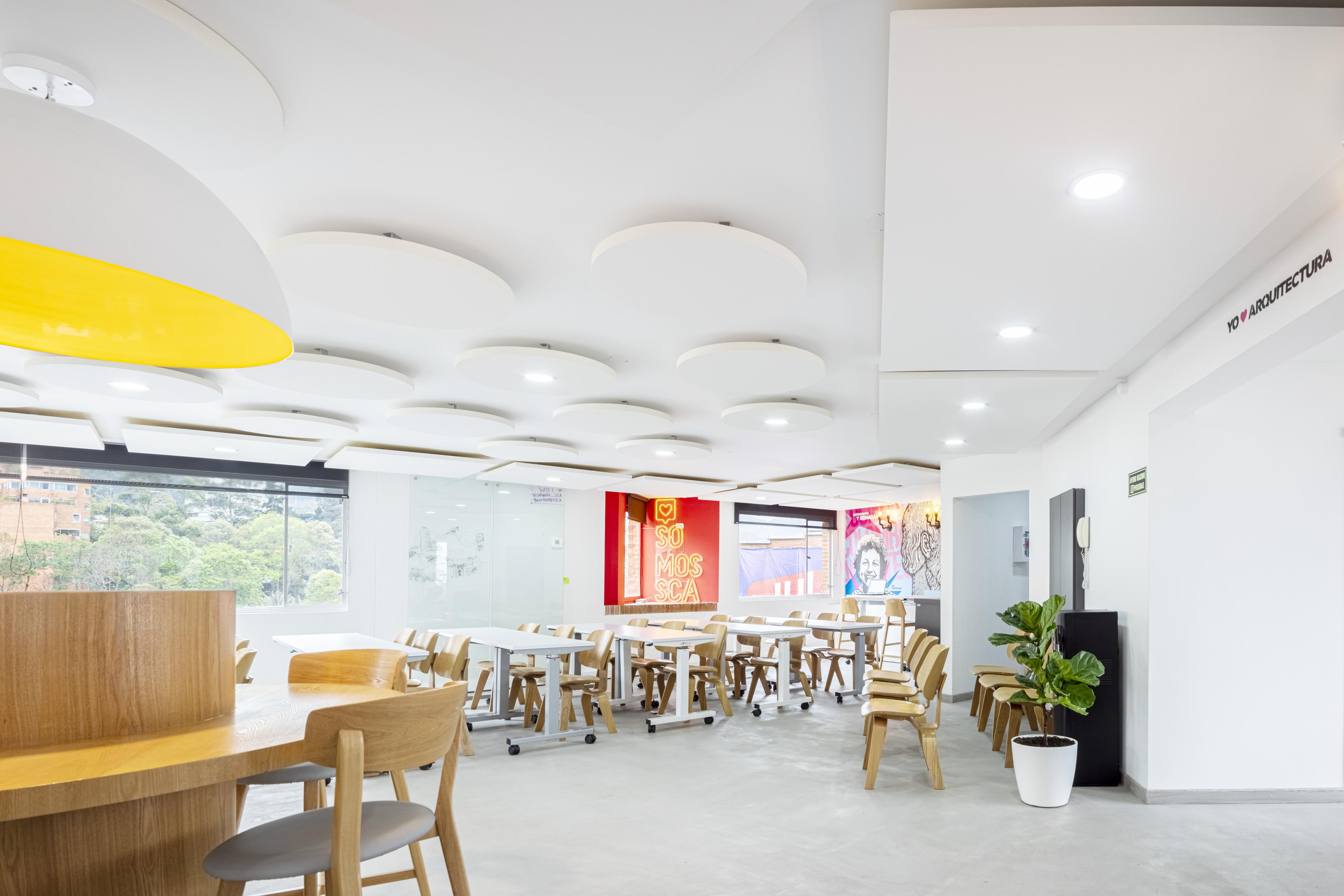 Ein Ort für kollaboratives Arbeiten, für kreative Prozesse und inspirierende Veranstaltungen, all das sollen die Büros der Kolumbianischen Architektenvereinigung in Bogotá ermöglichen. Doch nach Fertistellung des multifunktionlaen Coworking Spaces traten die ersten akustischen Schwierigkeiten auf. Eine hohe Nachhallzeit störte die Kommunikation und Konzentration in virtuellen Meetings, bei meheren Gesprächen im Raum sank die Sprachverständlichkeit immens.