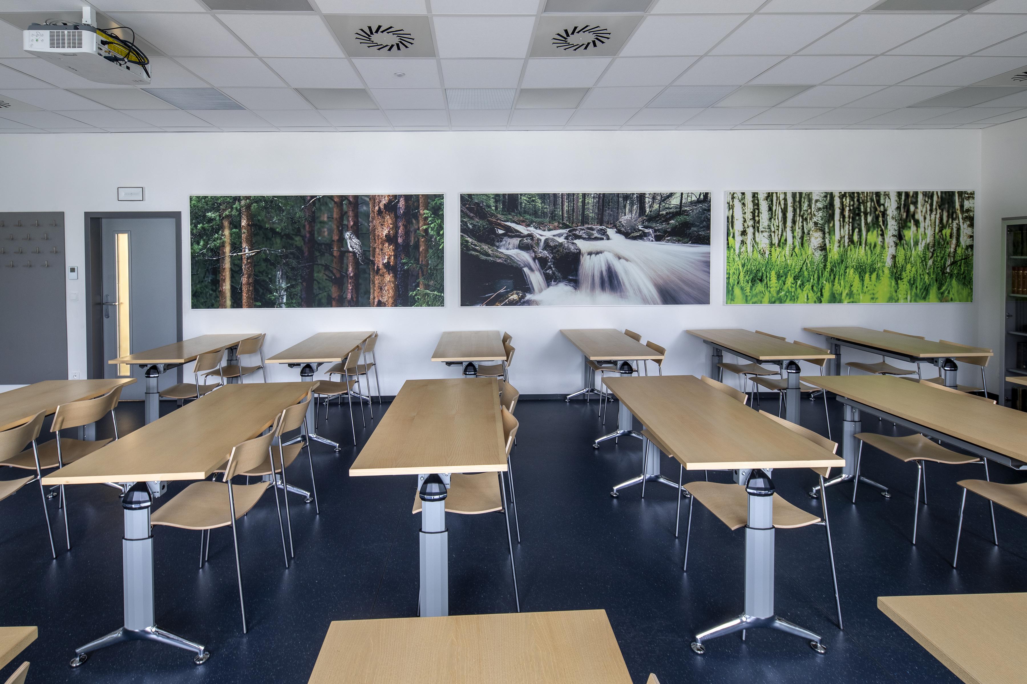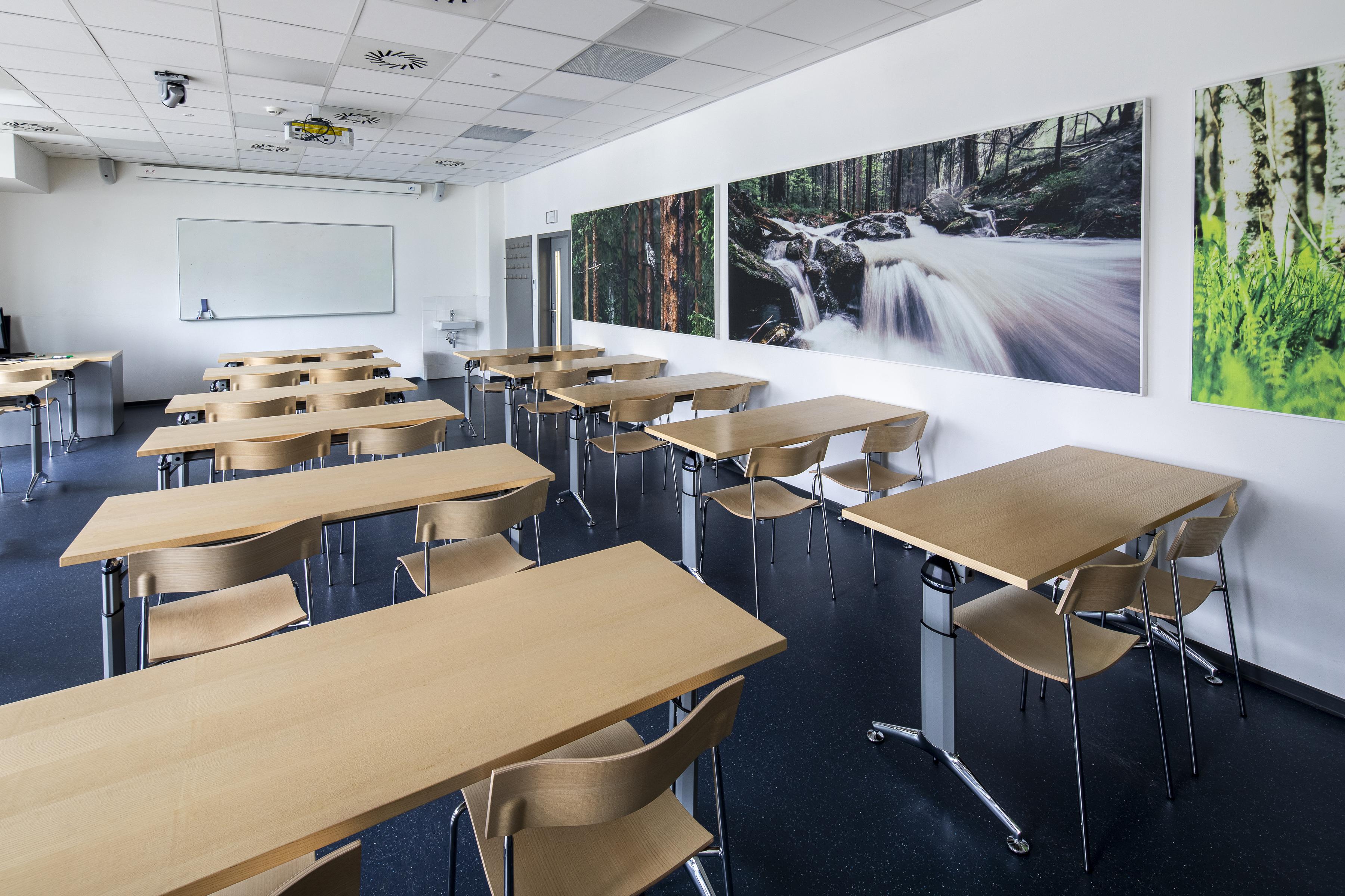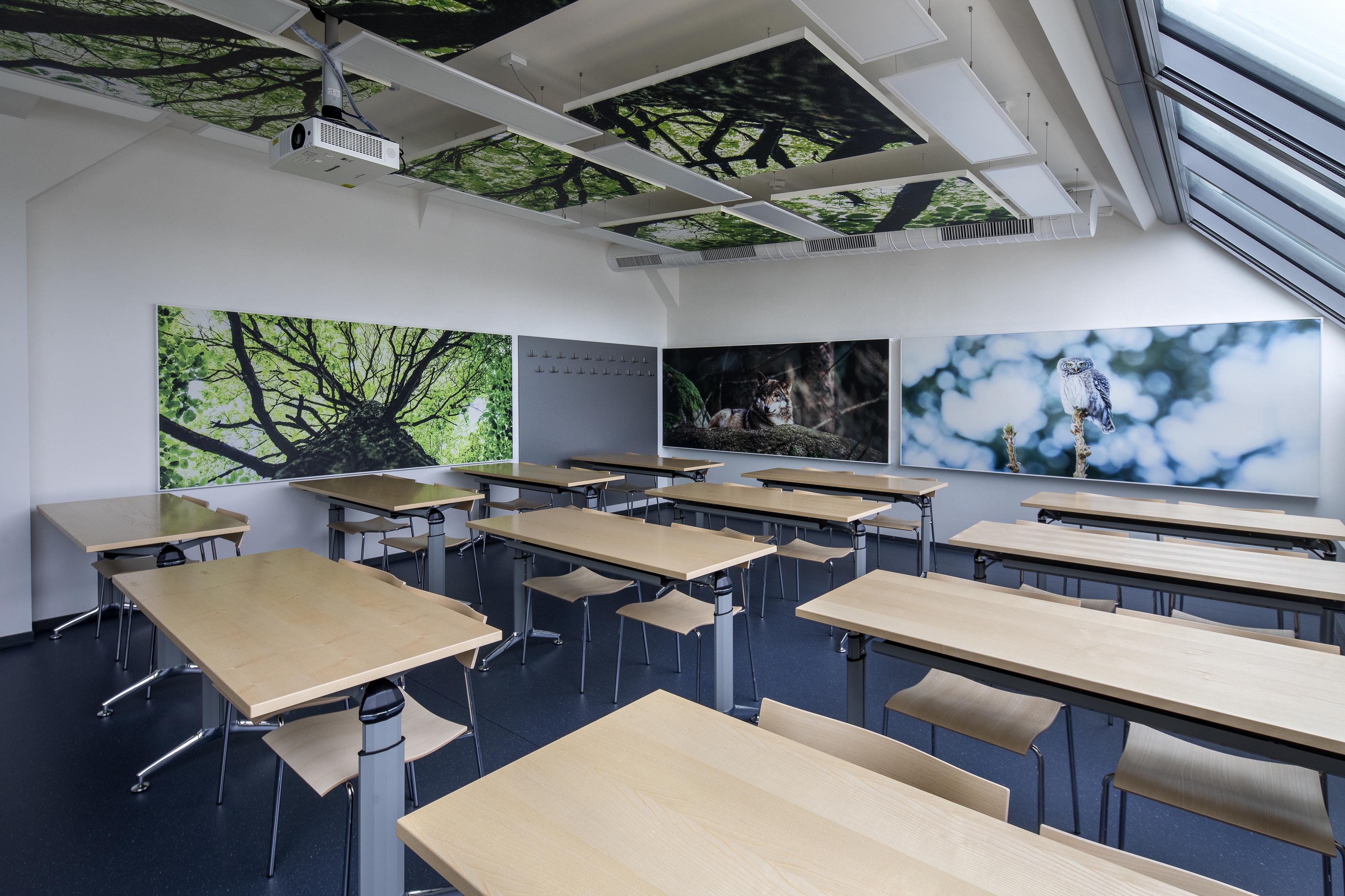 Die enge Zusammenarbeit der Architekten und Akustiker mit der Fakultät für Forst- und Holzwissenschaften der CZU zahlte sich auch bei der neuartigen Gestaltung der Deckensegel Ecophon Solo™ an den Decken und den Wandabsorbern Ecophon Akusto Wall C an den Wänden der Unterrichtsräume aus. Diese sind mit von der Fakultät ausgewählten thematischen Fotografien aus der Natur im UV-Druckverfahren bedruckt.