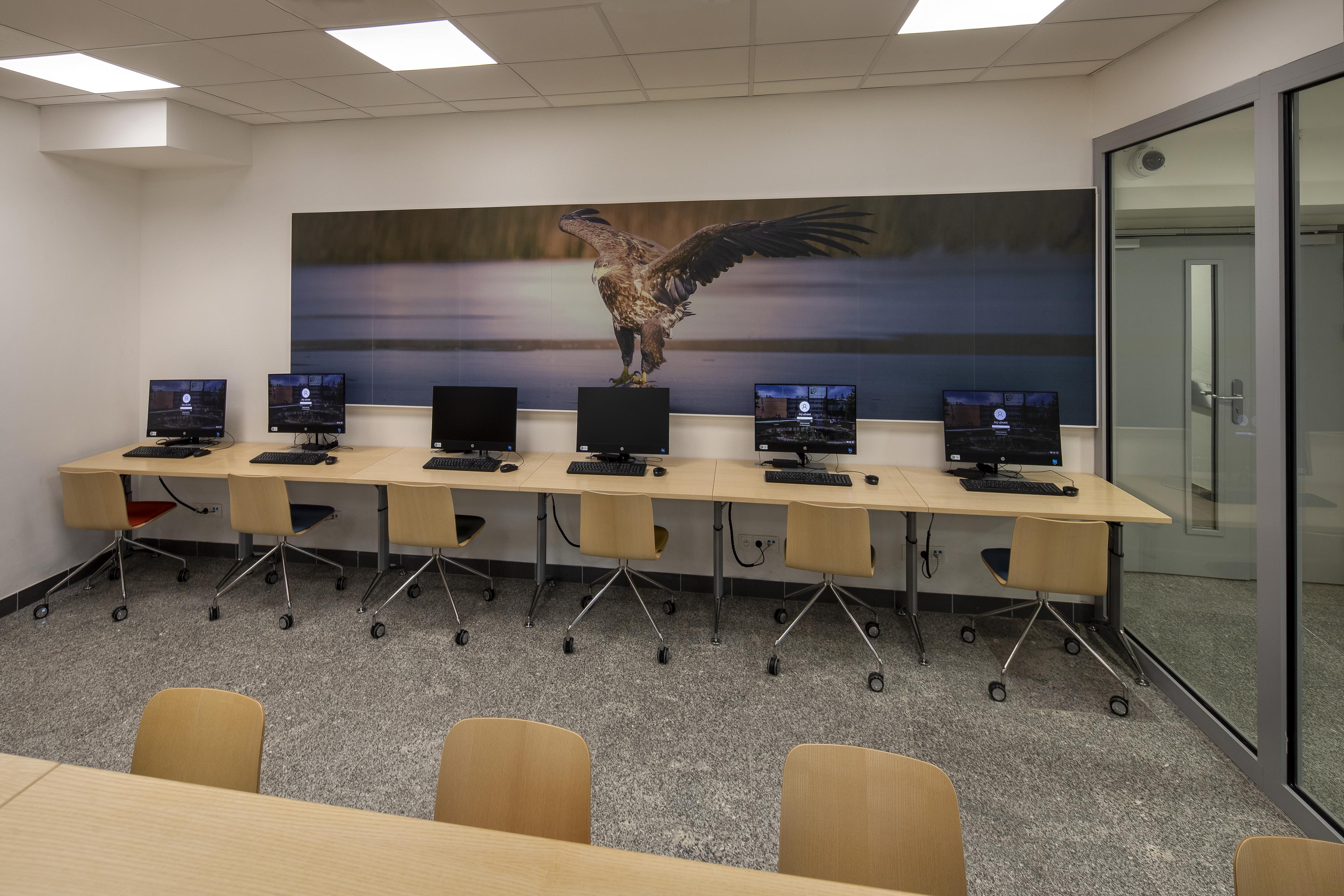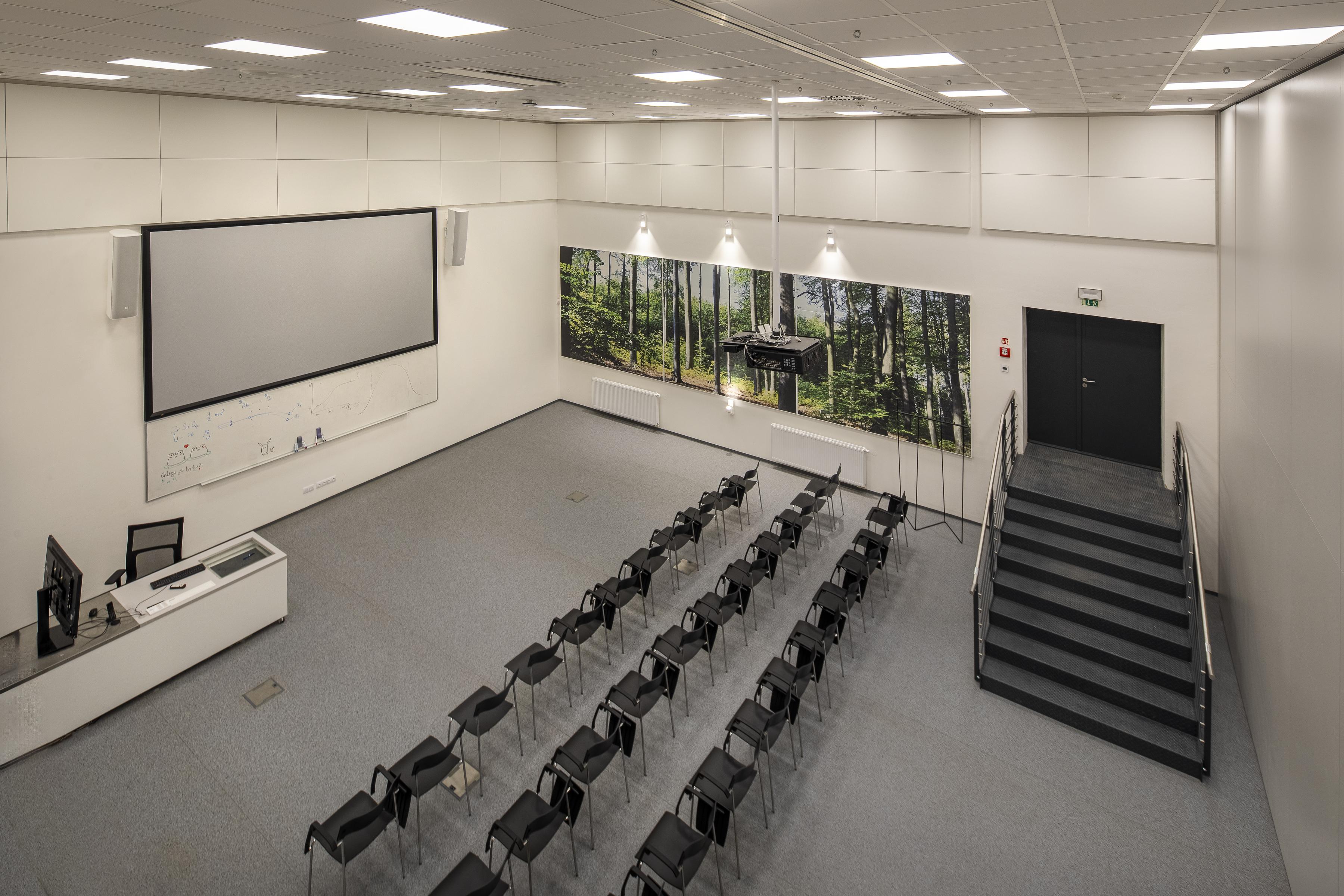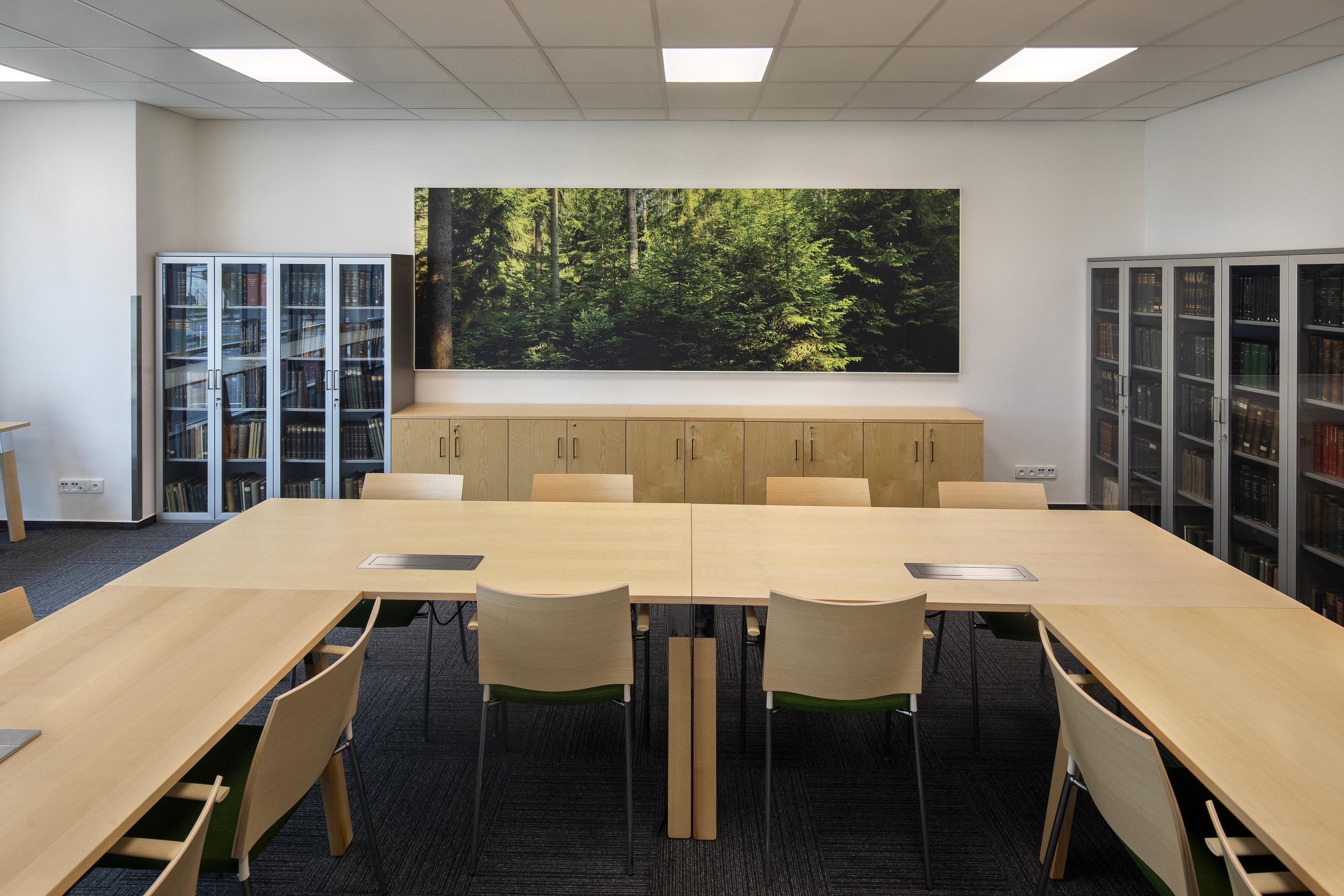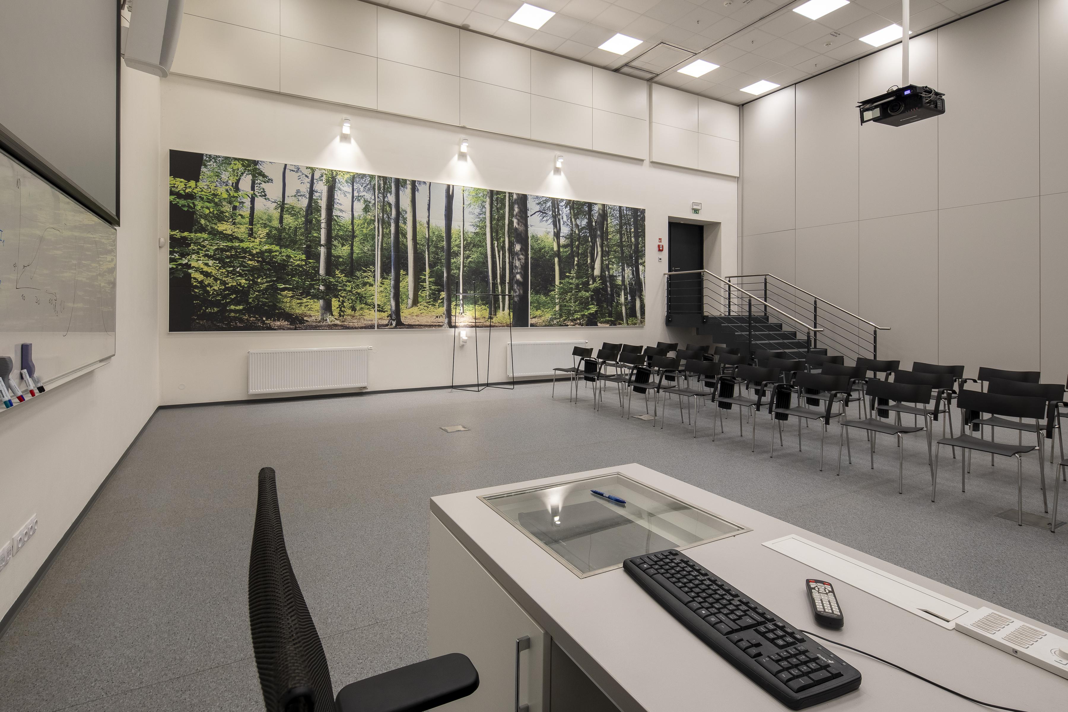 Die enge Zusammenarbeit der Architekten und Akustiker mit der Fakultät für Forst- und Holzwissenschaften der CZU zahlte sich auch bei der neuartigen Gestaltung der Deckensegel Ecophon Solo™ an den Decken und den Wandabsorbern Ecophon Akusto Wall C an den Wänden der Unterrichtsräume aus. Diese sind mit von der Fakultät ausgewählten thematischen Fotografien aus der Natur im UV-Druckverfahren bedruckt.