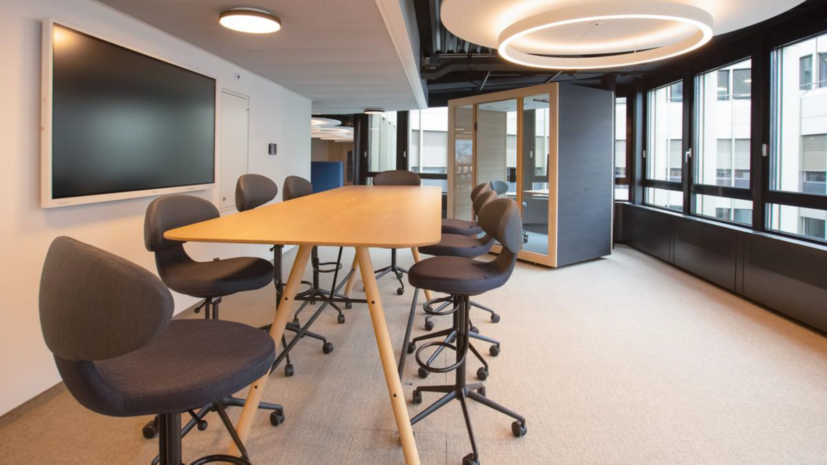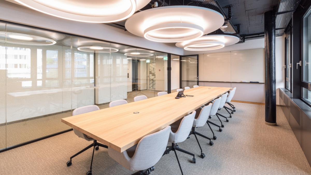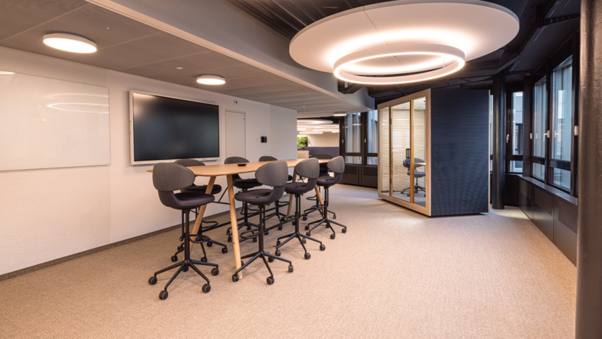 Die Stärke liegt in der Flexibilität: Durch die mehrschichtige Deckengestaltung sind die technischen Installationen von der Akustik- und Beleuchtungsebene entkoppelt, was eine flexible Zonierung ermöglicht. Die Besprechungskabinen wurden als modulare Einheiten konzipiert, die demontierbar sind und je nach Bedarf an jeder gewünschten Stelle wiederaufgebaut werden können. So lassen sich alle Elemente – Arbeitsplätze, Besprechungskabinen, Kreativzonen und Rückzugsbereiche – ohne bauliche Maßnahmen an neue Nutzungsmöglichkeiten anpassen.