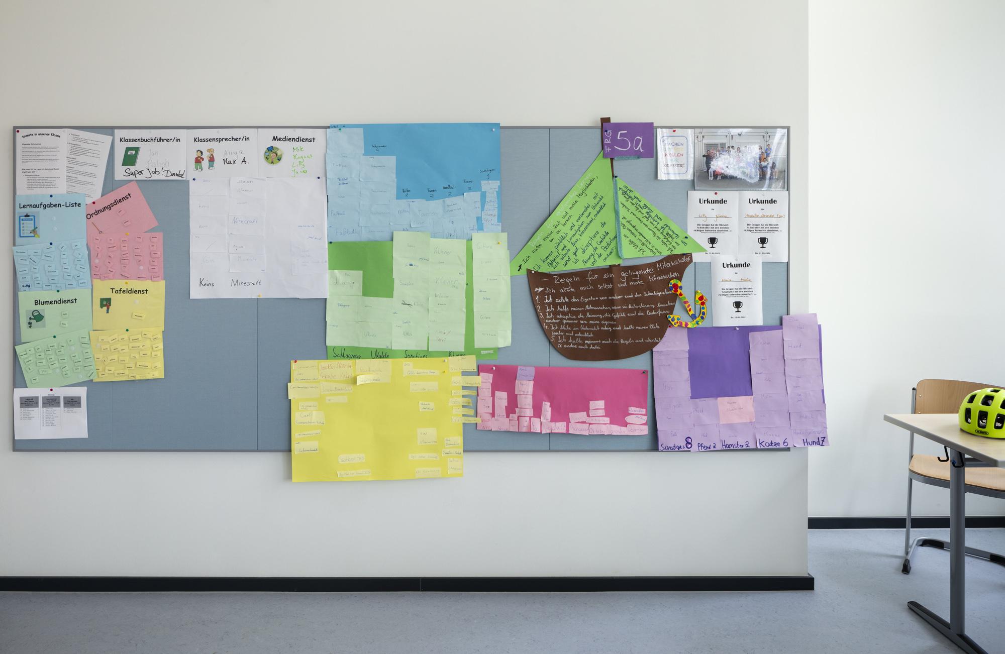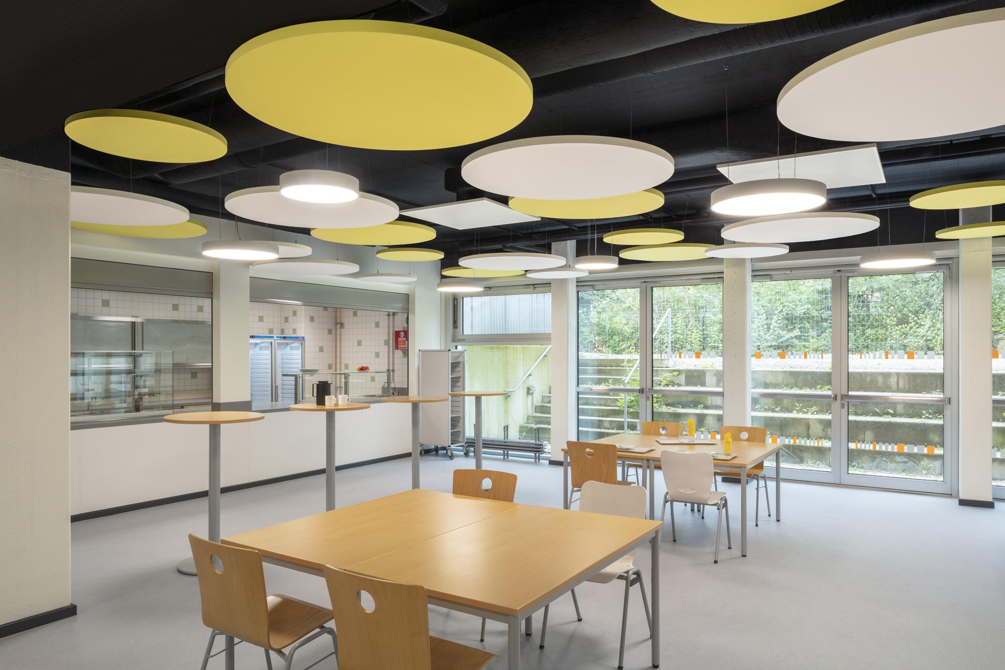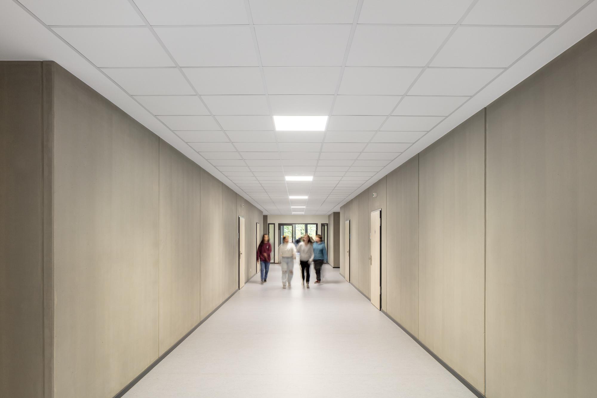 Für dieses Pilot- und Referenzobjekt fand das Architekturbüro agn Niederberghaus & Partner GmbH frühzeitig geeignete Ecophon Akustiklösungen, wissend, dass eine gute Akustik eine Investition in das Wohlbefinden, das Lernen und den Lernkomfort ist. Erreichen lässt sich dies mit vollflächig verlegten Akustikdecken aus höchstabsorbierenden Materialien sowie Wandabsorbern, die den Unterricht auch in praktischer Hinsicht unterstützen, weil sie sich als Pinnwand nutzen lassen.