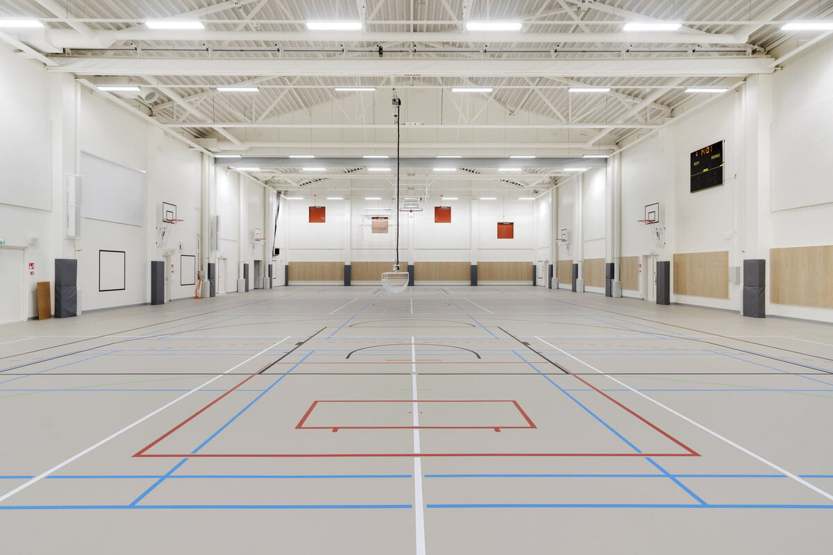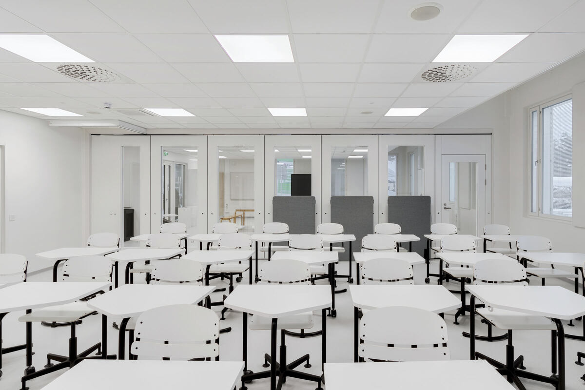 Insgesamt wurden 3.840 m² Ecophon-Akustikplatten in der Schule montiert, von denen 2.600 m² aus dem Carbon Low Sortiment stammen (Ecophon Focus™ A CarbonLow und Ecophon Master™ SQ CarbonLow).