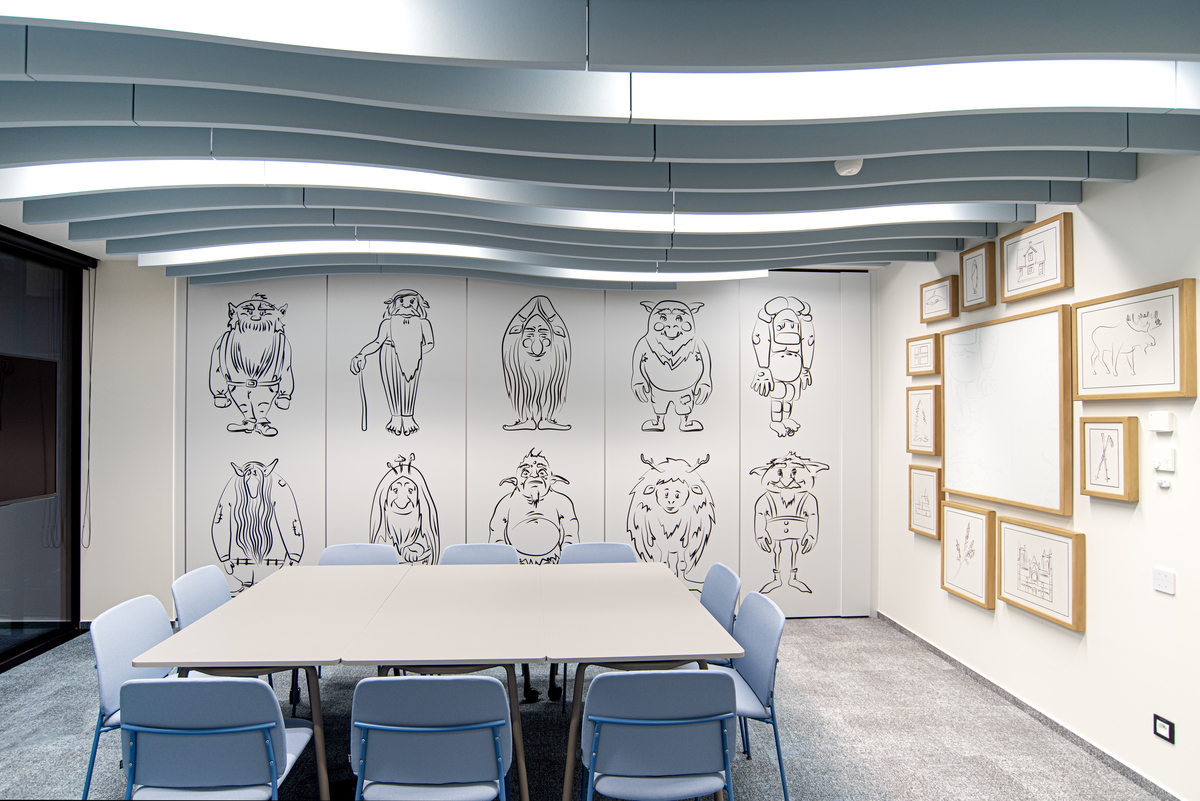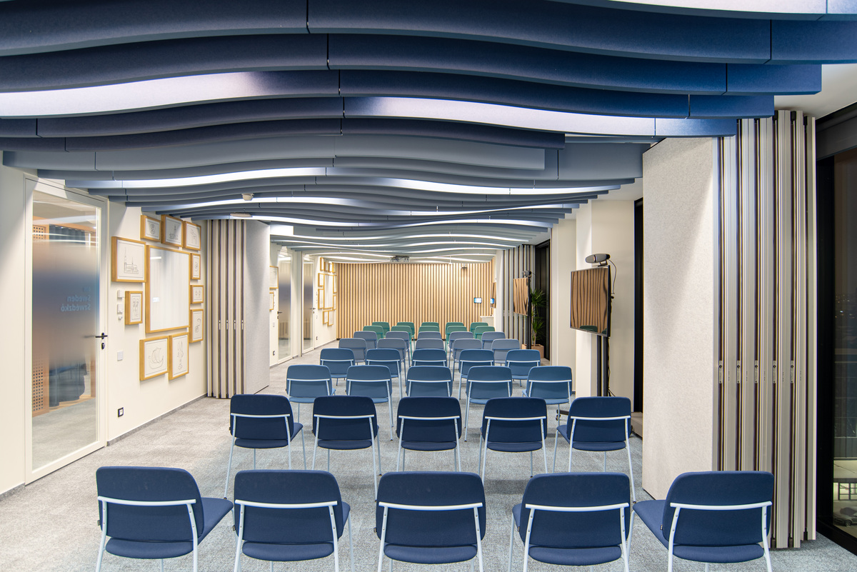 Für den Hauptkonferenzraum, den wichtigsten Besprechungsraum für Mitarbeiter und Kunden, wurden frei hängende Ecophon Solo™ Baffle Wave Deckensegel in Blautönen gewählt, die ein wellenförmiges Muster bilden. Wenn der Raum offen ist, schaffen die unterschiedlichen Blautöne ein Gefühl von Tiefe, während bei einer Unterteilung in kleinere Räume jeder Bereich sein eigenes wellenförmiges Deckendesign aufweist.