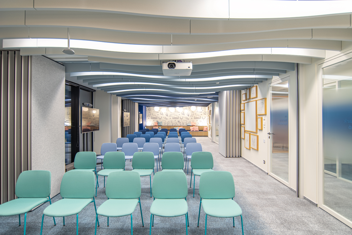 Die Inneneinrichtung des Büros in Gdańsk wurde von der pommerschen Landschaft inspiriert. Das spiegelt sich in den Wänden, der Beleuchtung und den Farbschemata wider, die das Meer, die Gletscherhügel, den Sand und die Wellen imitieren. Um dieses einzigartige Design mit der richtigen Akustiklösung zu ergänzen, wurde die Akustikdecke Ecophon Focus™ E auf der gesamten Freifläche montiert.