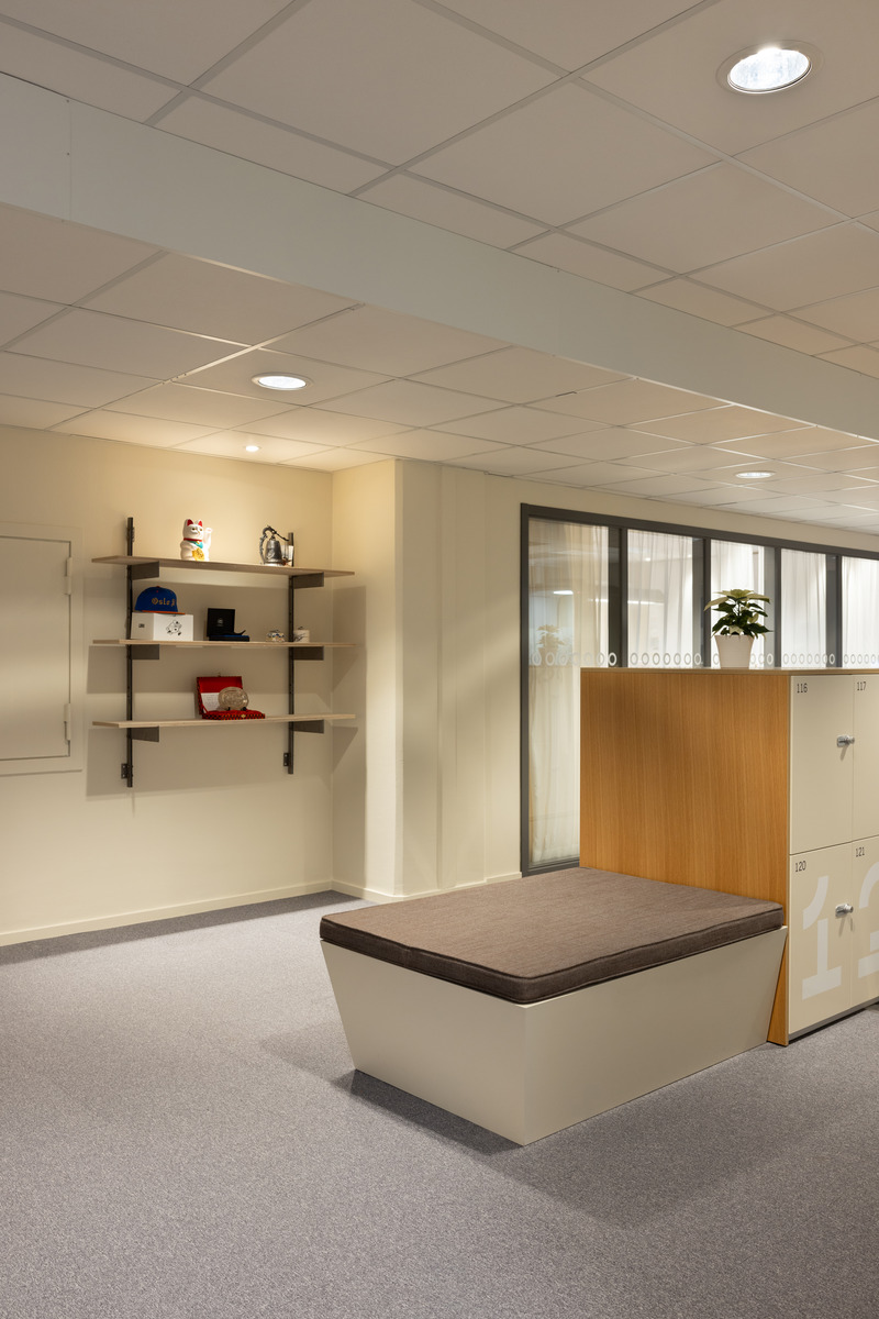 Die Wiederverwendung geht weit über die akustischen Elemente hinaus - von den Baumaterialien bis hin zur Inneneinrichtung wurde allem ein zweites Leben gegeben. Wände, elektrische Komponenten und Belüftungssysteme wurden wiederverwendet, ebenso wie Vorhänge, Möbel und Schreibtischoberflächen aus recycelten Krankenhaustextilien. Ein maßgefertigtes Sofa, das aus Kaffeeabfällen hergestellt wurde, ist ein weiteres kreatives Beispiel für nachhaltiges Design.