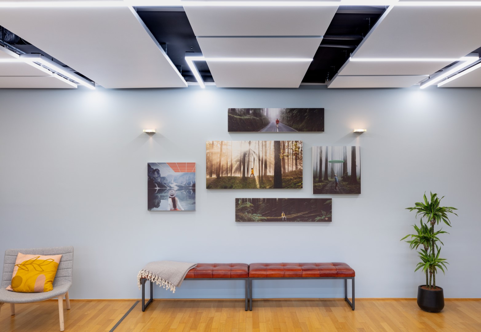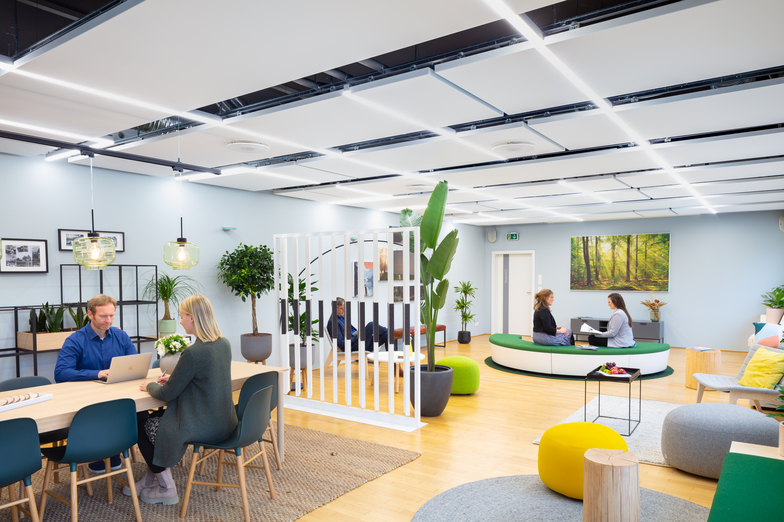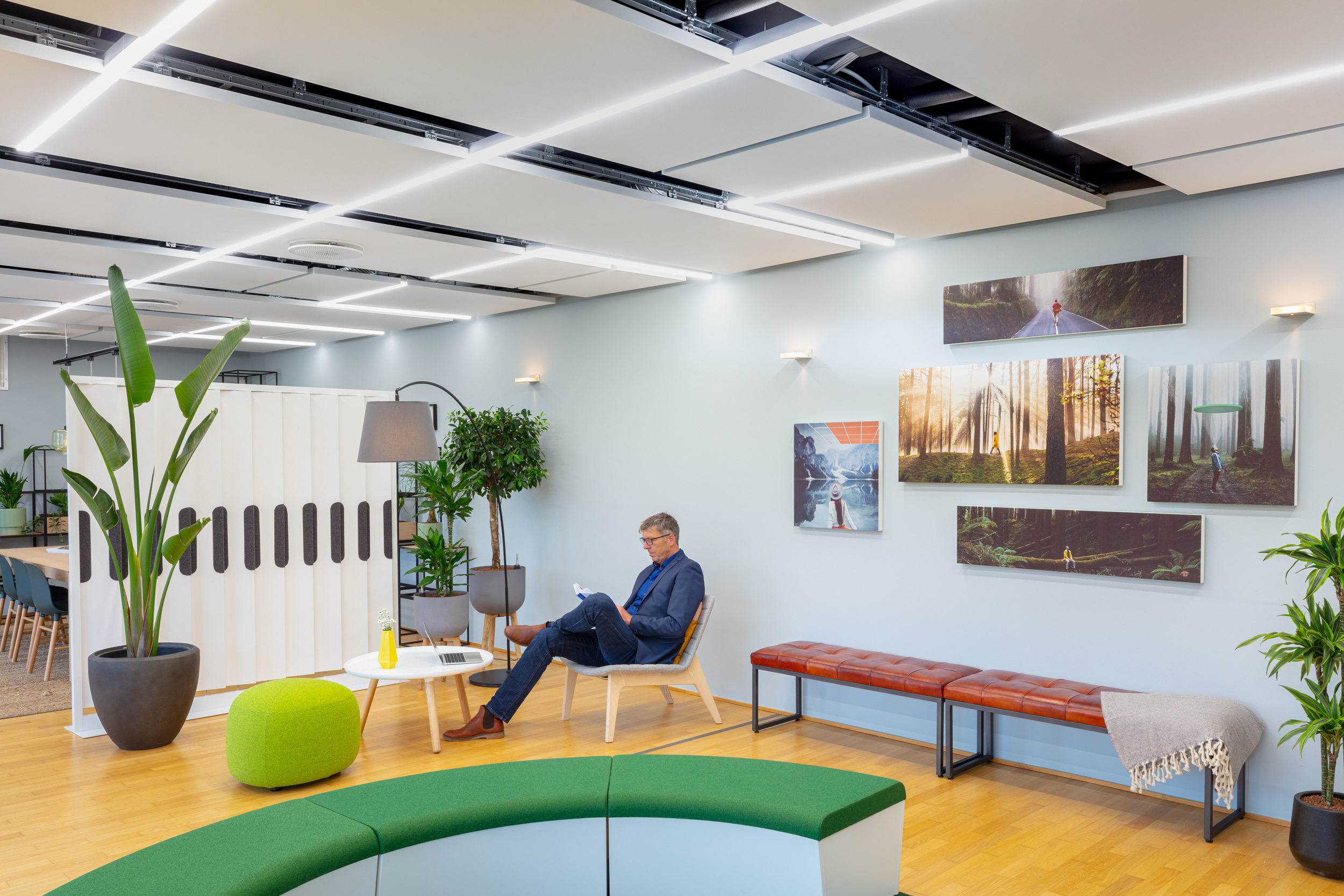 Die größten Herausforderungen für solche großen Räume stellen in der Regel die Raumakustik sowie die Raumtemperatur dar. Um den besten Komfort zu erreichen, entschied sich der Innenarchitekt für eine Heiz-/Kühldecke, die gleichzeitig eine hochwertige Akustiklösung beinhaltet: Ecophon Solo Matrix Celsius.