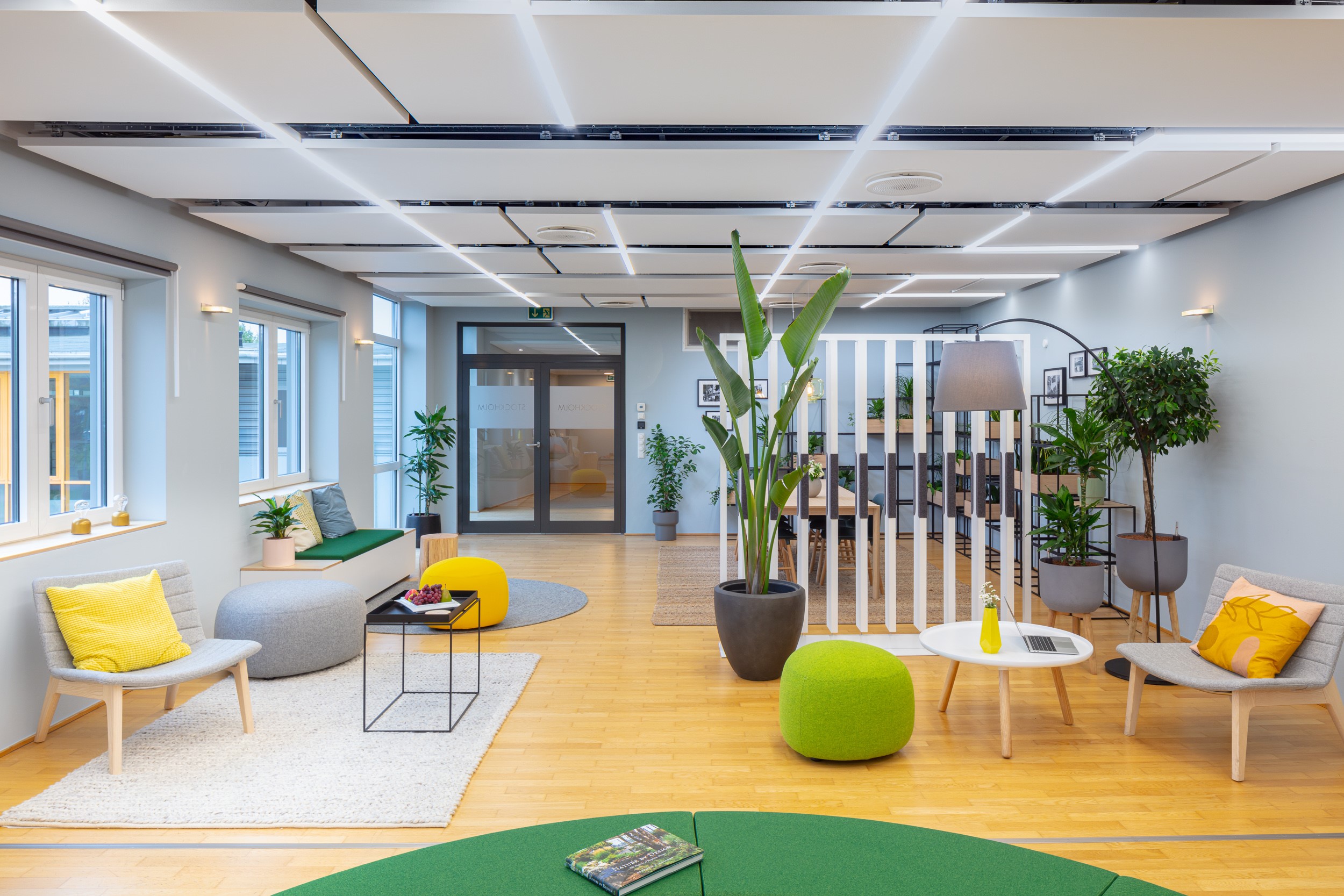 Konferenz- bzw. Veranstaltungsräume sind tendenziell eher funktional und schlicht ausgestattet. Das galt auch für unseren Raum „Stockholm“. Innenarchitekt Volker von Baczko entwarf ein neues Designkonzept, dass uns und unsere Gäste nachhaltig beeindrucken sollte: Neben verschiedenen Bereichen, gibt es nun auch ein Sofa, Designhocker und Sitzbänke. Es wurde ein multifunktionaler Raum, in dem Besprechungen abgehalten, Pausenzeiten verbracht und auch Veranstaltungen durchgeführt werden können. Wichtig war dem Designer auch, dass ein biophiles Design verfolgt wurde. Diverse Pflanzen fanden in den Regalen, auf dem Boden und auf den Fensterbänken Platz.