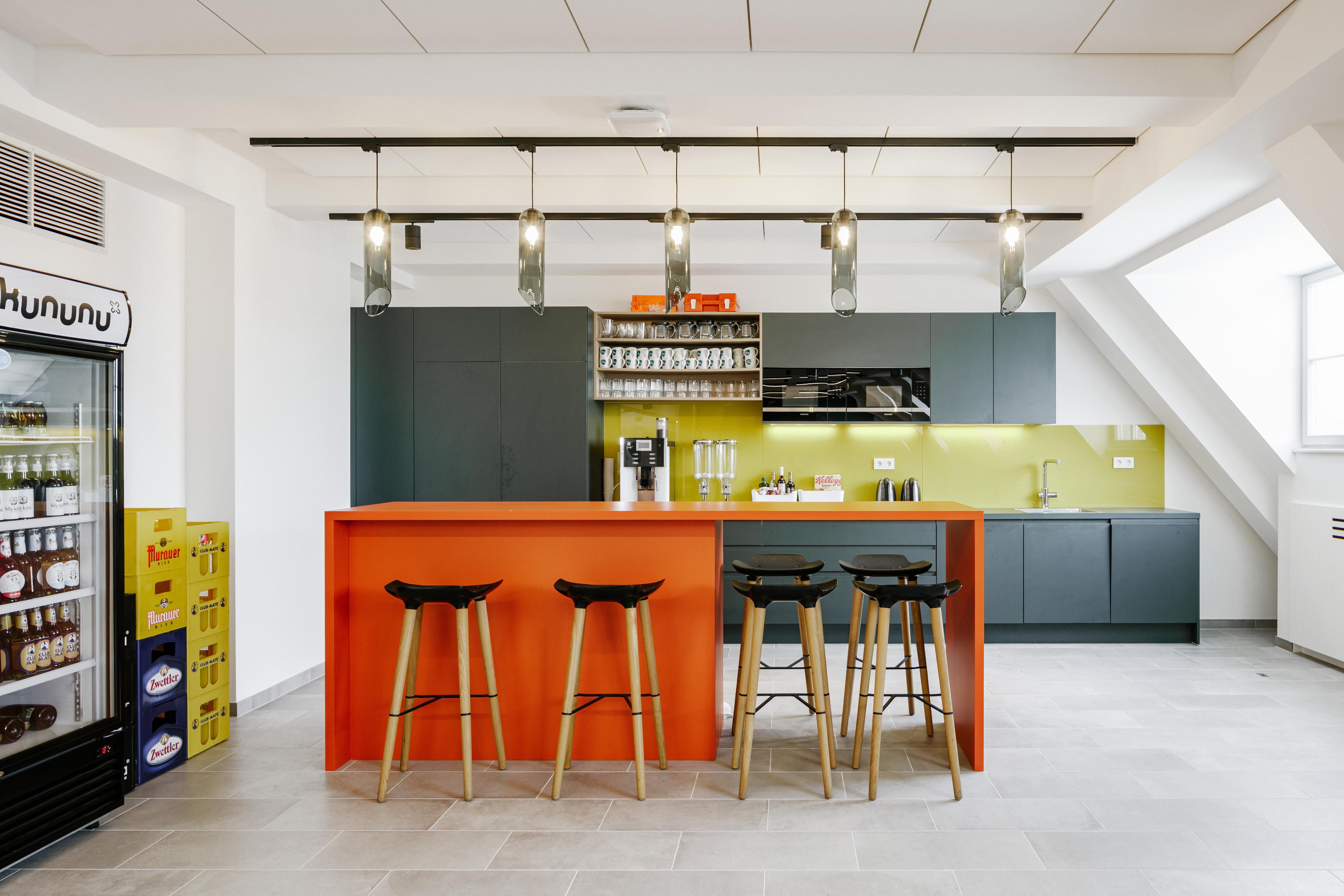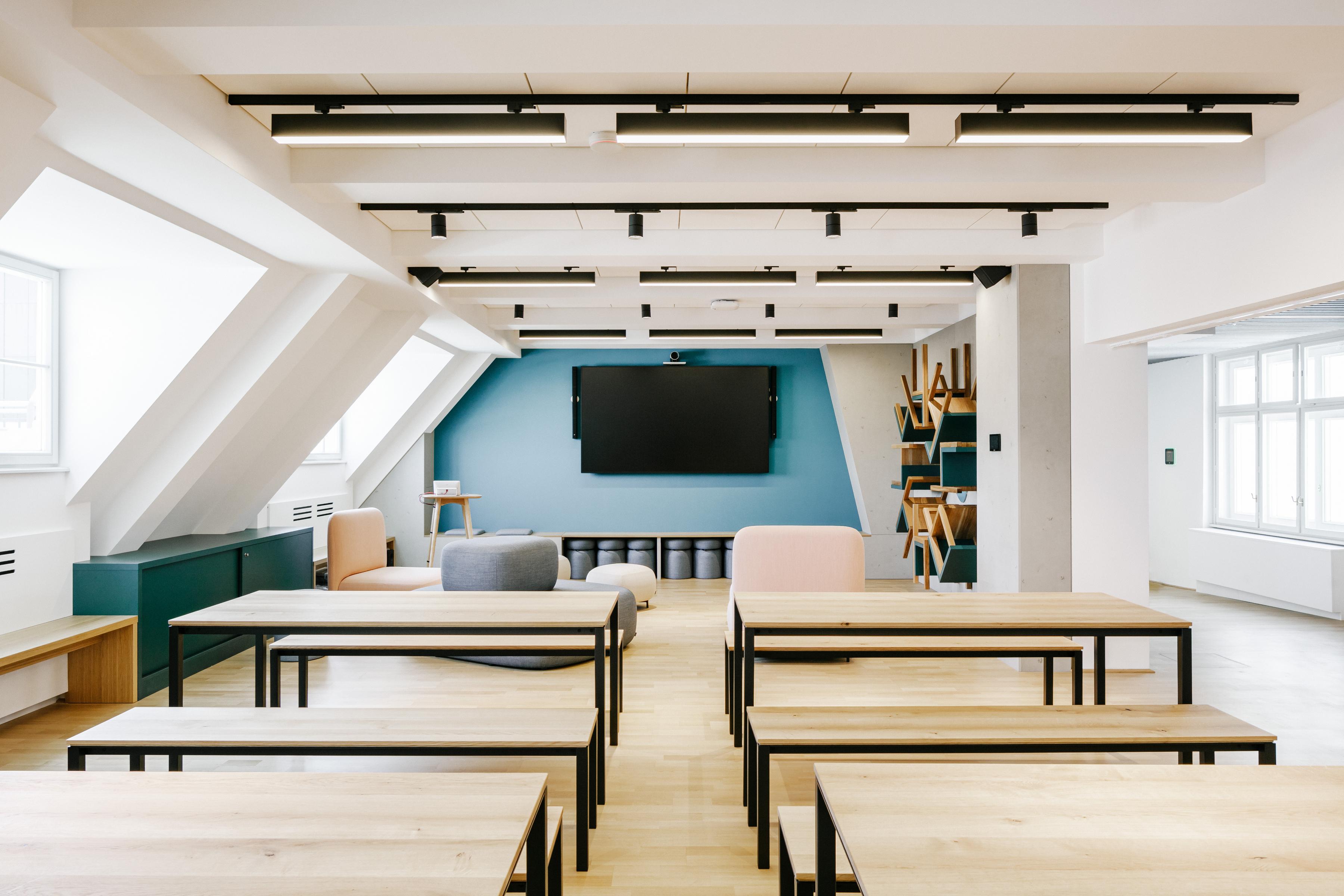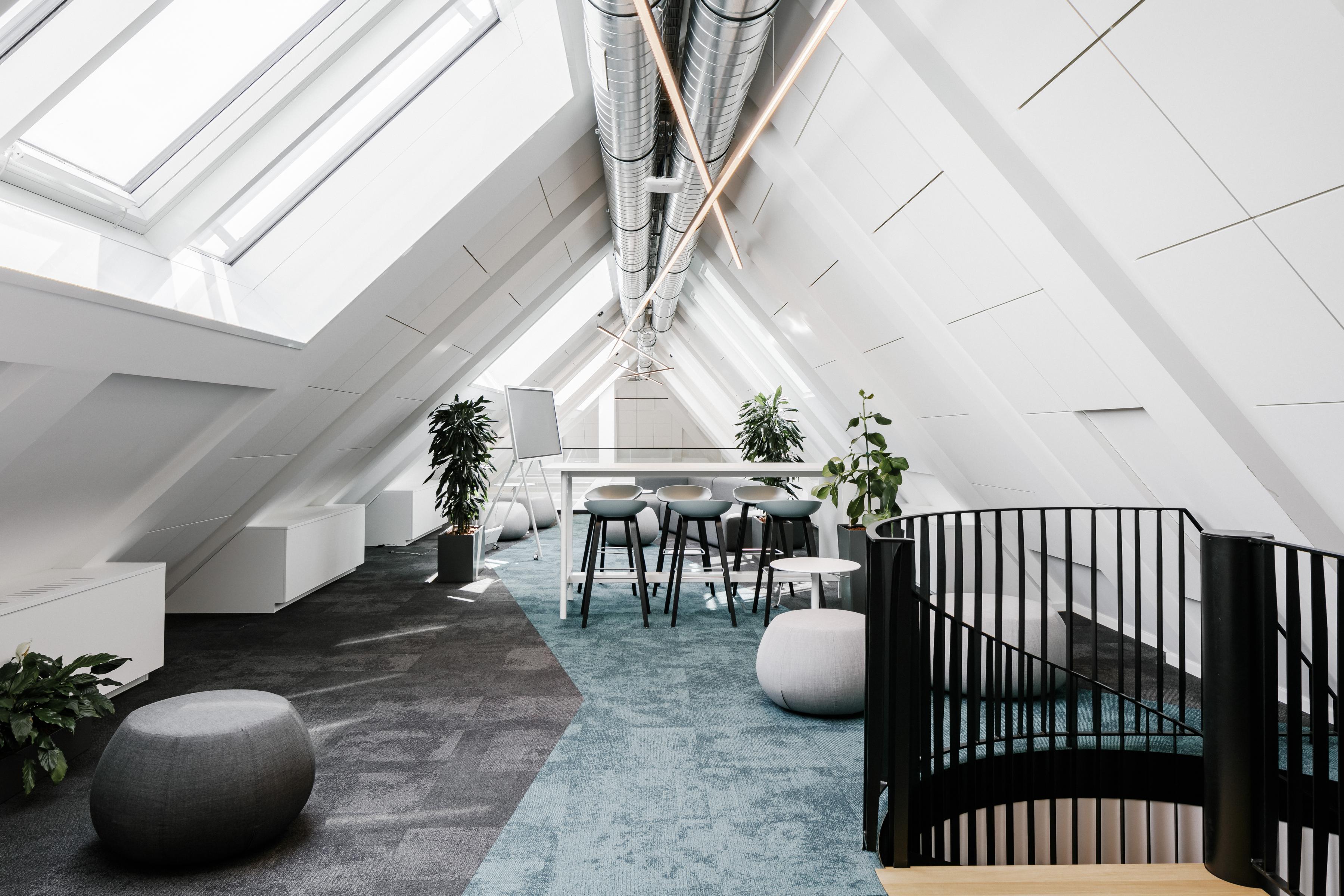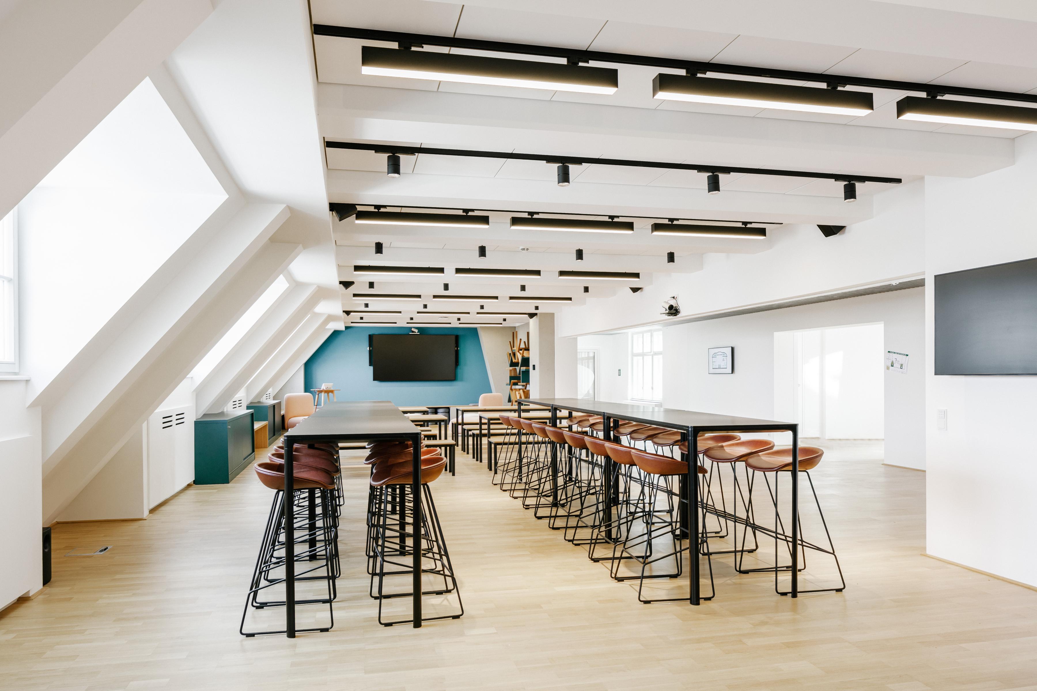 5.500 Quadratmeter auf zwei Geschossen stehen den rund 300 Mitarbeiter:innen zur Verfügung, zusätzlich drei Galerien sowie zwei Dachterrassen. Die Arbeitsplätze sind auf verschiedene Räume und Areas aufgeteilt, die Mitarbeitenden können täglich wählen, wo sie sich niederlassen und wo das Kollaborieren, Lernen, Kommunizieren und konzentrierte Arbeiten in der New Work Base am besten gelingt. Ziel war es, die Dynamik des Unternehmens in diesem ehrwürdigen Gebäude sichtbar zu machen und dem Büro Bewegung zu verleihen.