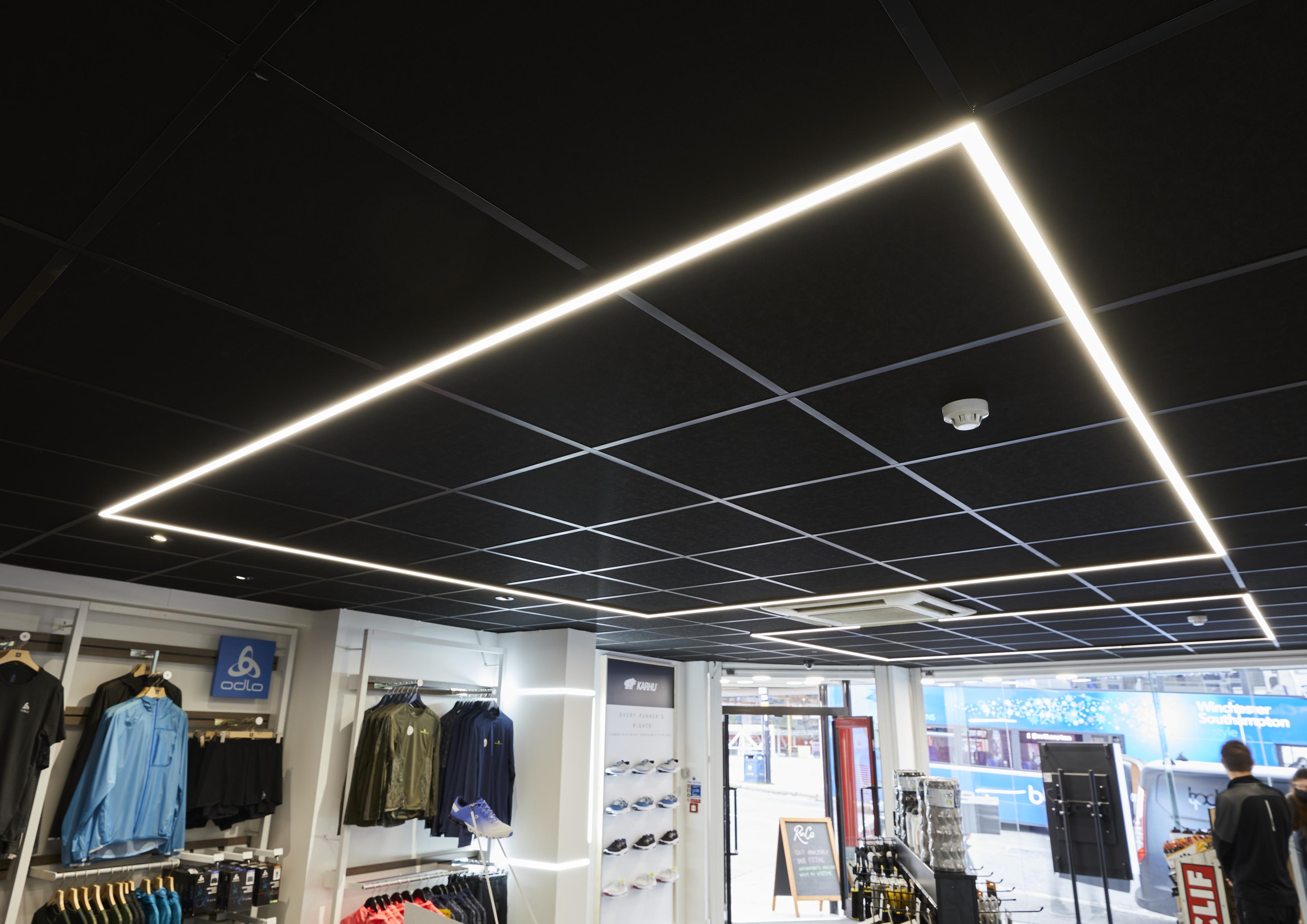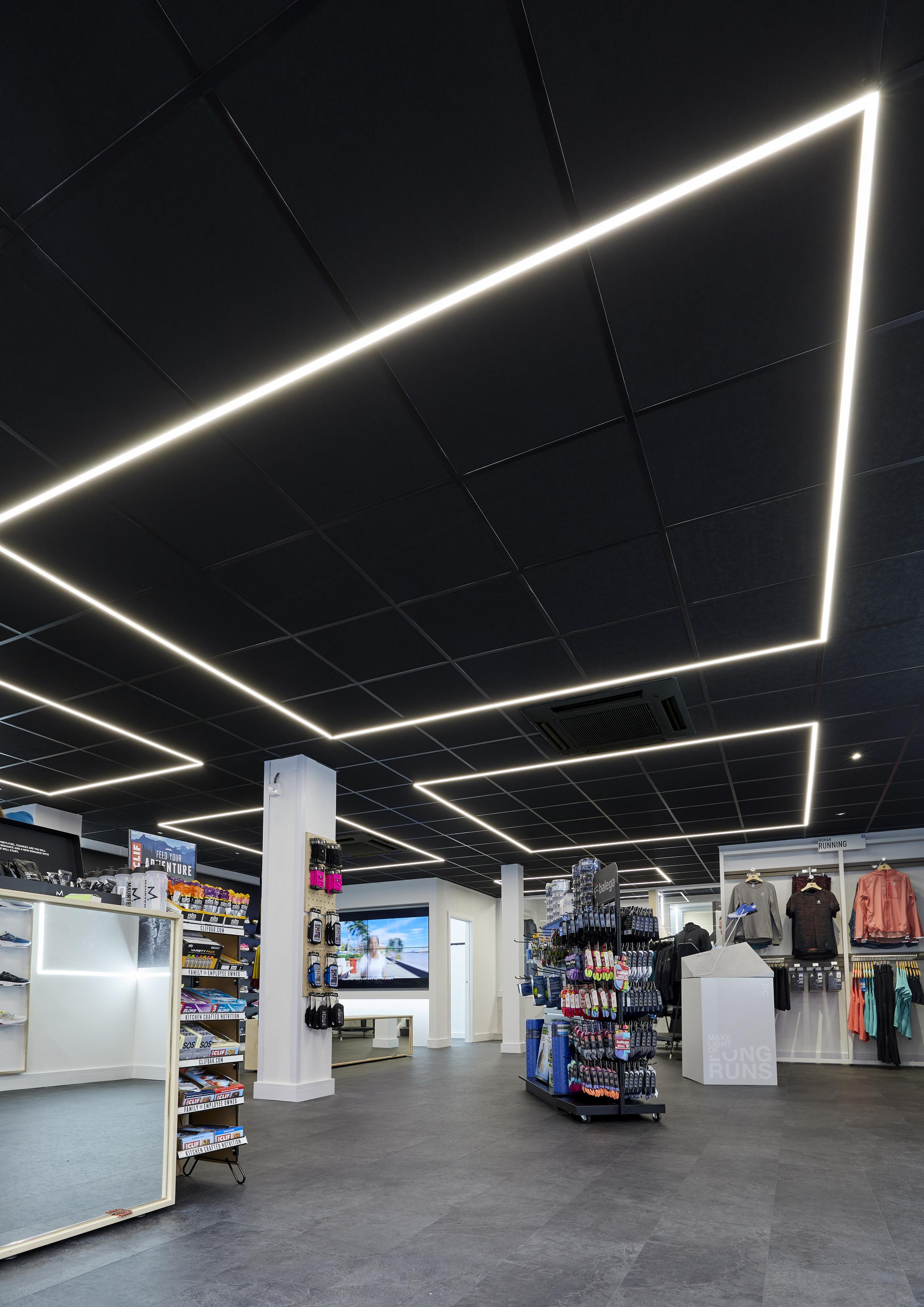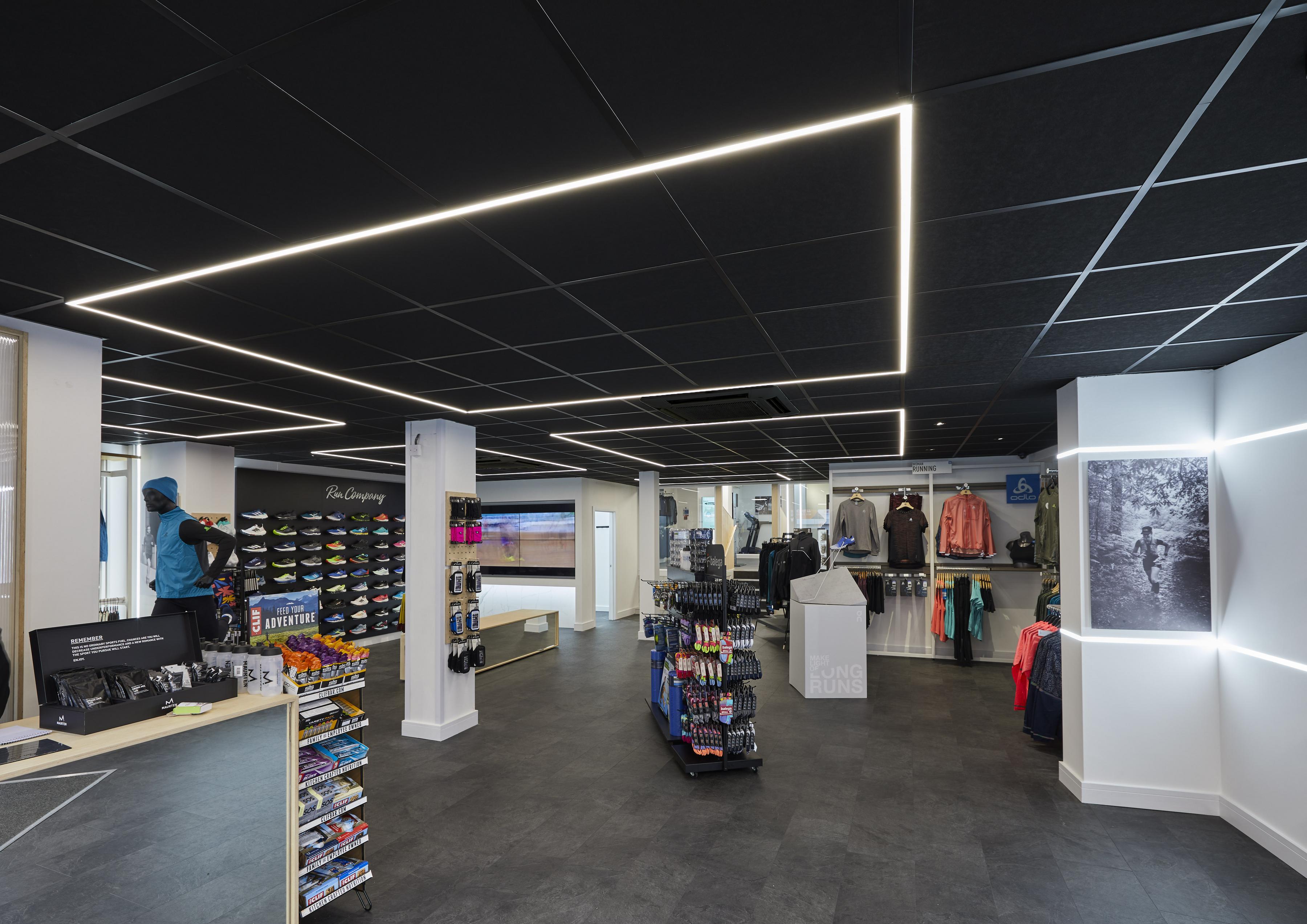 In Zusammenarbeit mit CCF konnte Ecophon dem Bauunternehmer zur Montage einer Akustikdecke raten, anstatt die Deckenuntersicht schwarz zu streichen. Mit der Montage von Ecophon Sombra können die Kunden in einem akustisch angenehmen Ambiente einkaufen, und Run Company profitiert von der Renovierung seiner Geschäfte in einem modernen Design.