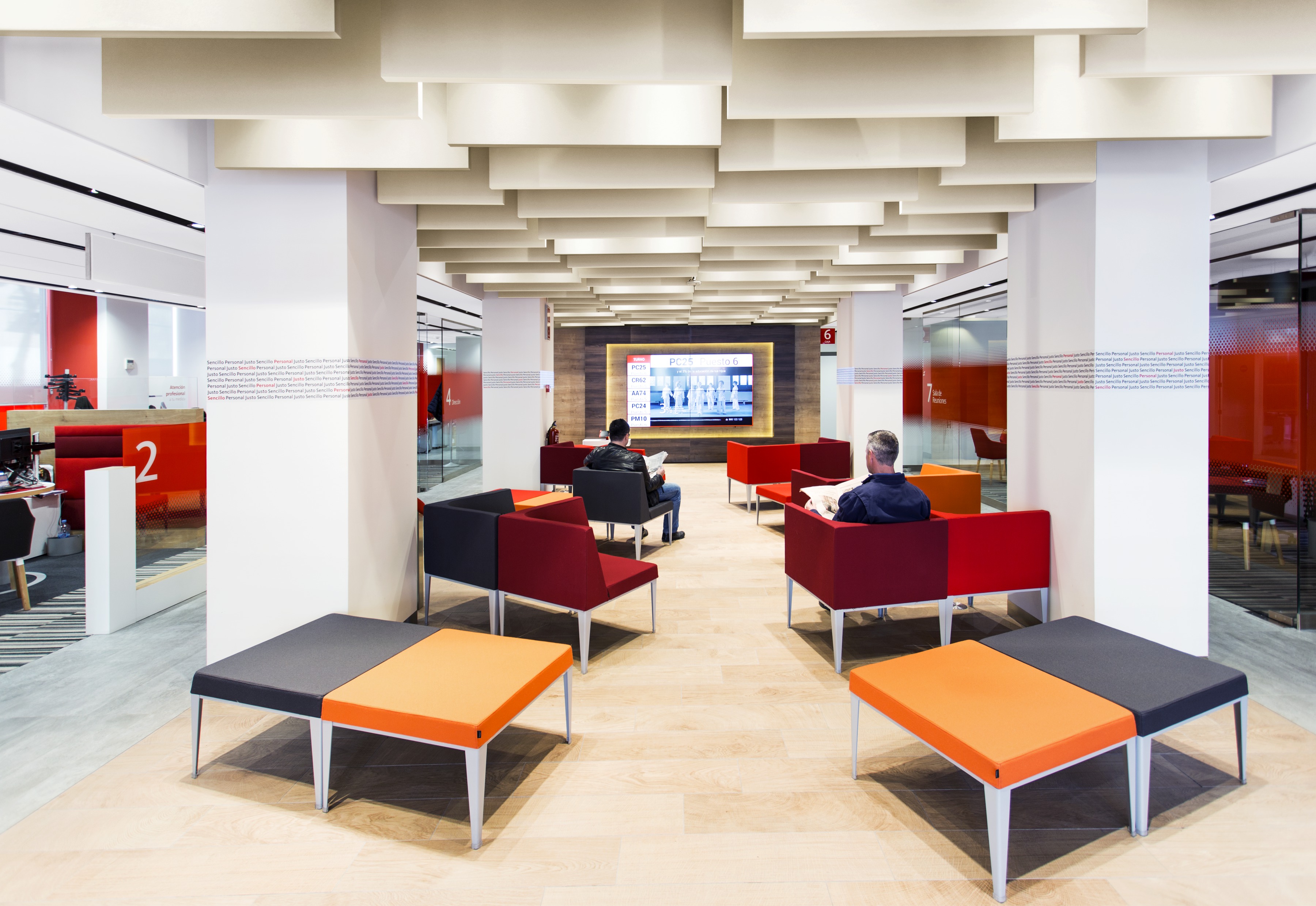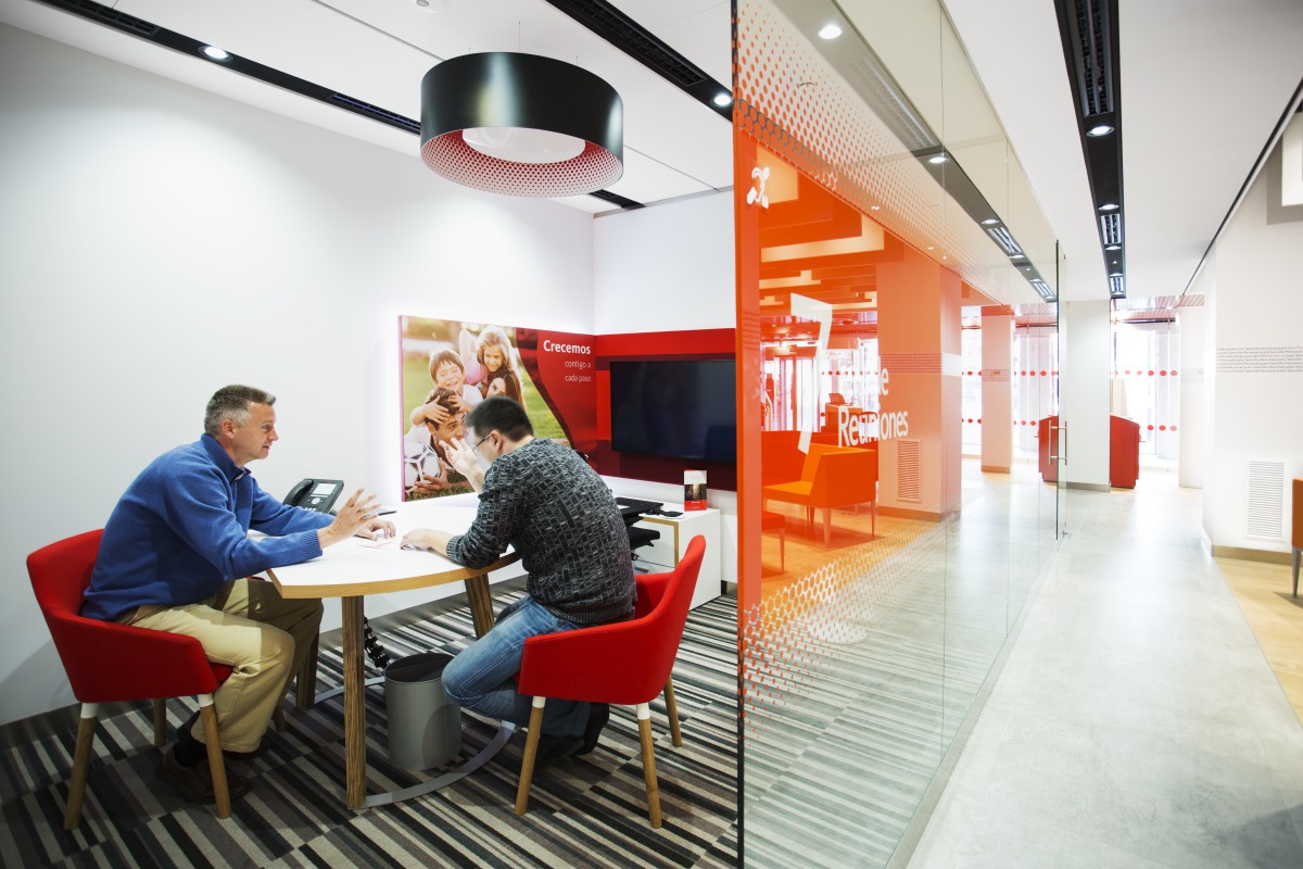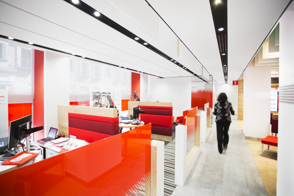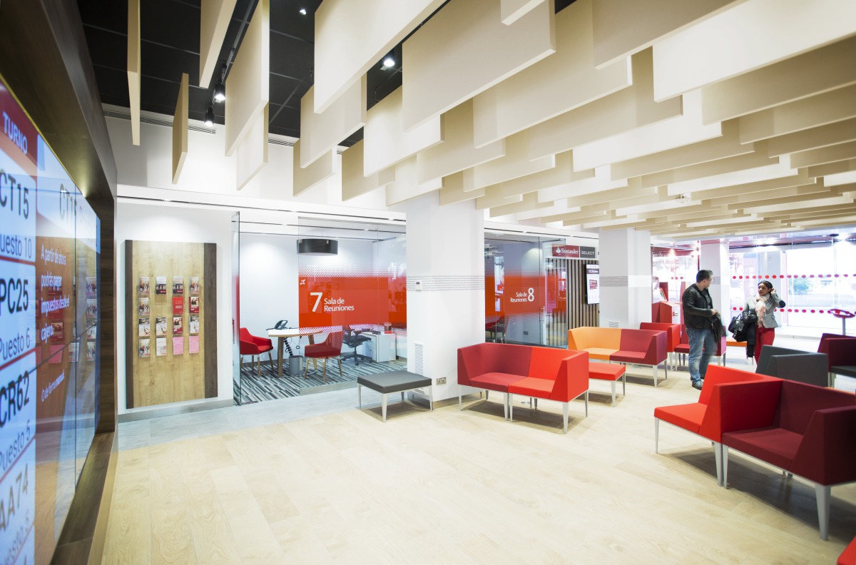 Die Santander Bank, eine der größten Banken Spaniens, hat beschlossen, ihr Firmenimage zu erneuern und ihre Räumlichkeiten in eine modernere und offenere Umgebung zu verwandeln. Ziel war es, "das Büro der Zukunft" zu schaffen, ein Büro mit einer zugänglichen, agilen und freundlichen Atmosphäre. Deshalb wurden existierende architektonische Barrieren beseitigt und ein neues, offeneres Arbeitsumfeld geschaffen. Dieser neue architektonische Stil zusammen mit der ganz persönlichen Ansprache der Kunden soll eine langfristige Beziehung aufzubauen.