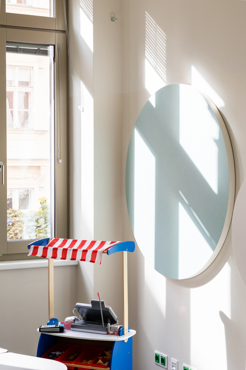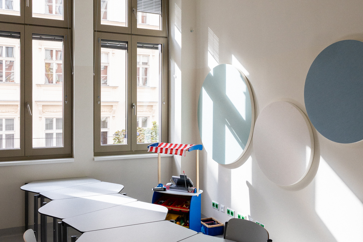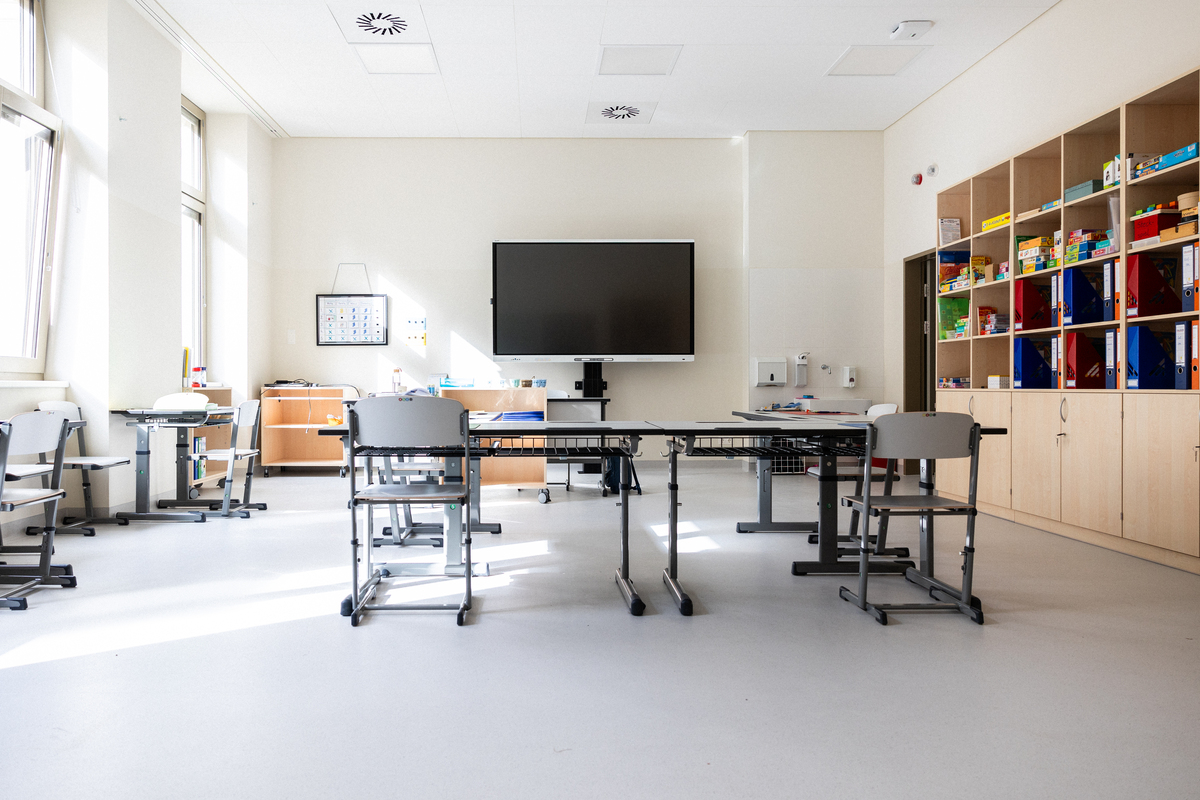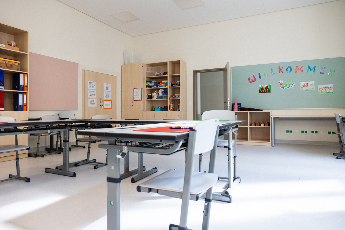 Die Klassenzimmer sind mit der Akustikdecke Ecophon Focus Ds ausgestattet. Sie bietet hervorragende schallabsorbierende Eigenschaften und ermöglicht einfache Integrationen bei einem nahezu nahtlosen Erscheinungsbild. Darüber hinaus ergänzen die Wandpaneele Ecophon Akusto Wall C und Ecophon Akusto One die Schallabsorption. Dieses Zusammenspiel schafft eine optimale Raumakustik für Klassenräume und schafft somit einen angenehmen Ort für Schülerinnen und Schüler sowie Lehrkräfte.