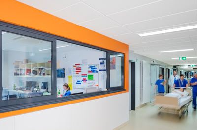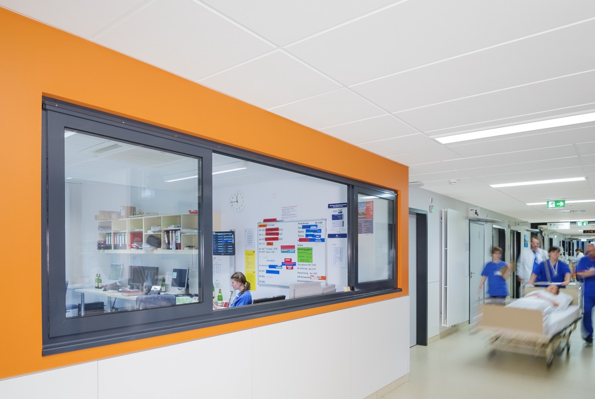 Obwohl dies eine vorübergehende Lösung darstellt, wurde die akustische Umgebung als relevanter Gestaltungspunkt für diesen Arbeitsplatz in Planungsgesprächen mit Architekten, Ärzten und Krankenschwestern und Patienten als relevant bewertet und baulich berücksichtigt.