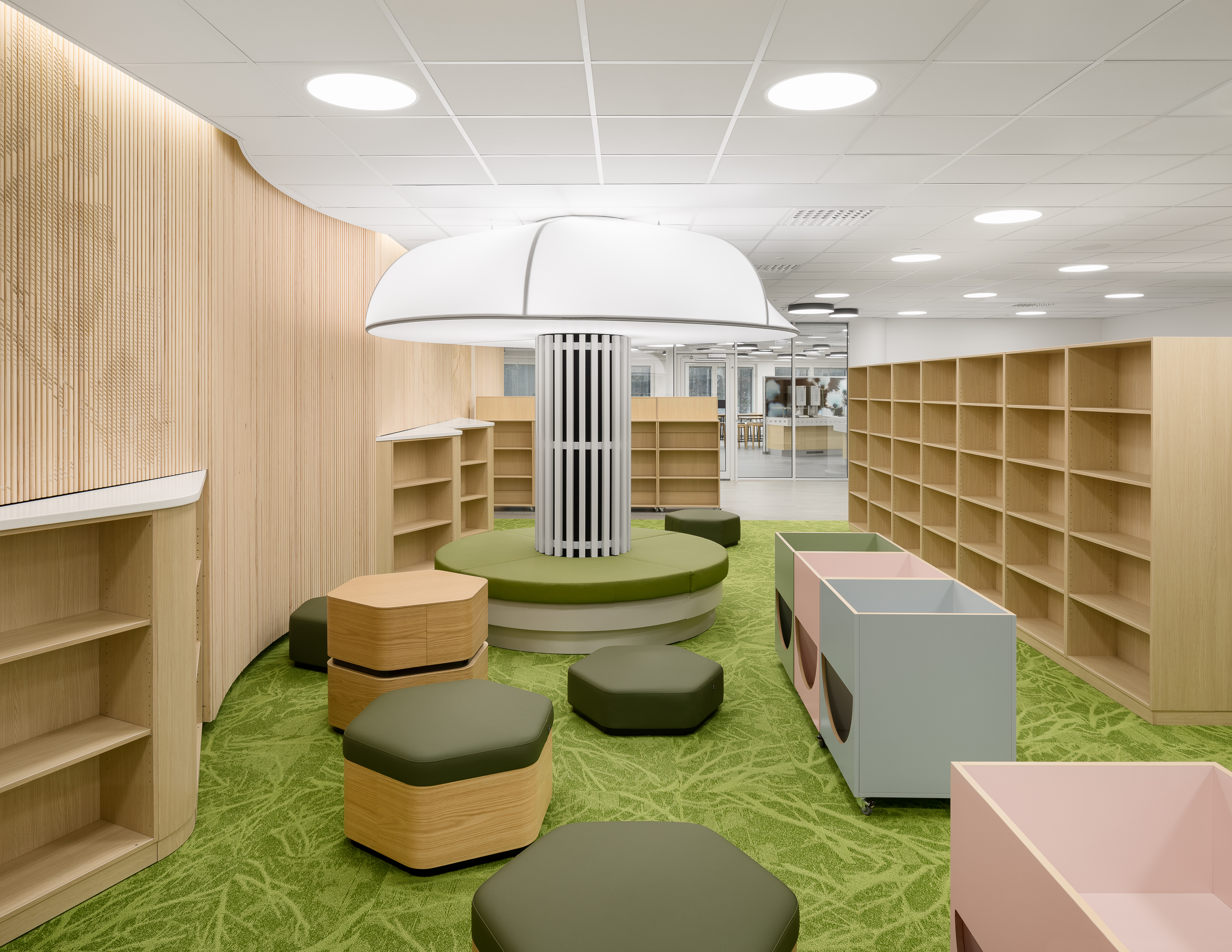 Die Kyrkkäri-Bibliothek, die sich im Gebäude M befindet, ist die erste unabhängige Bibliothek in Seinäjoki. Um eine gute Akustik zu gewährleisten, wurden Ecophon Focus™ A Deckenplatten verwendet.
