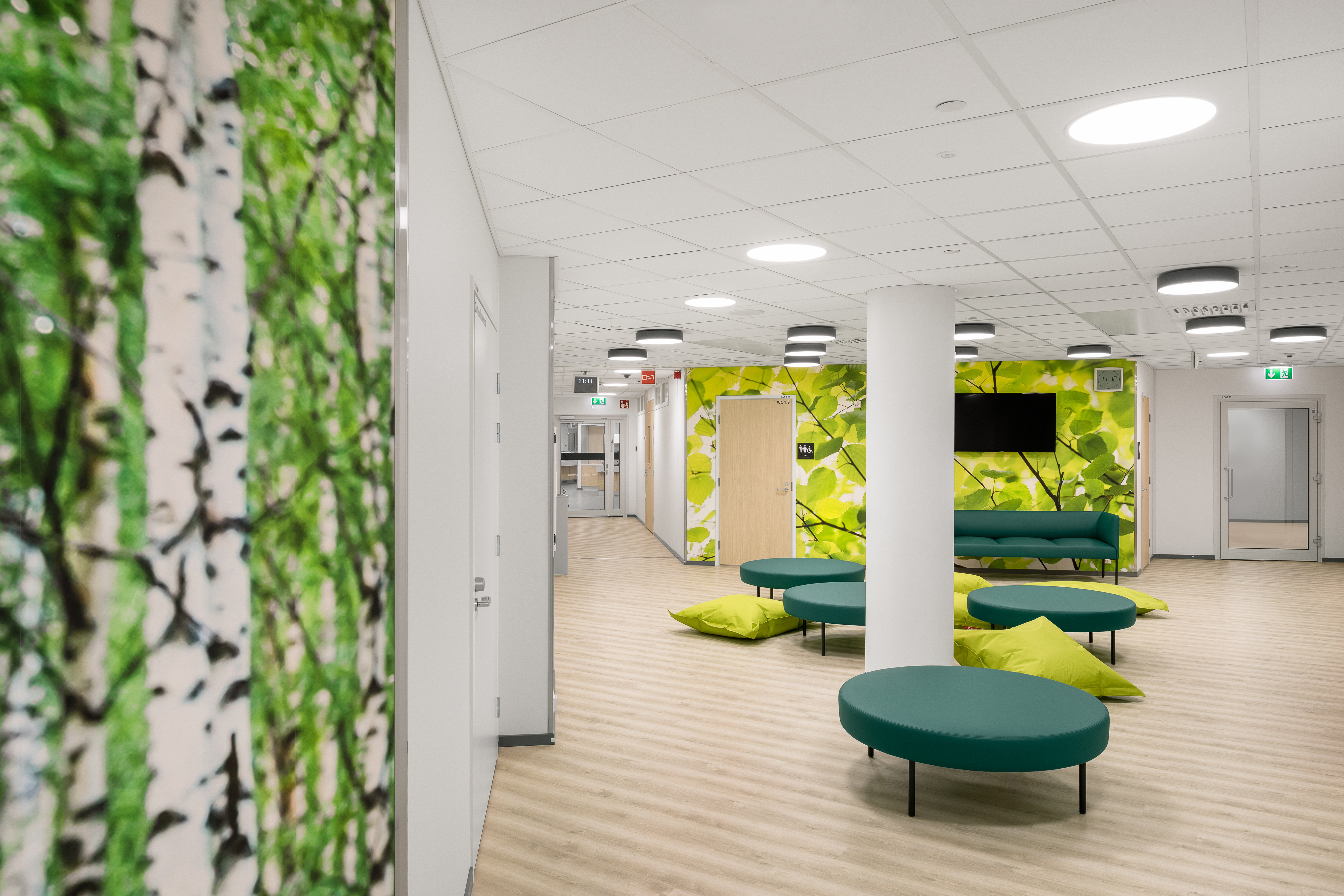 Das Zentralkrankenhaus in Seinäjoki mit seinen unbegrenzten Möglichkeiten, besser bekannt als M-talo oder Gebäude M, ist ein wichtiger Bestandteil des Genesungsprozesses. Kunstwerke, Bilder aus der Natur, eine dem Tagesrhythmus angepasste Beleuchtung und eine beruhigende Raumakustik tragen zum Wohlbefinden der Patienten und des Pflegepersonals bei.
