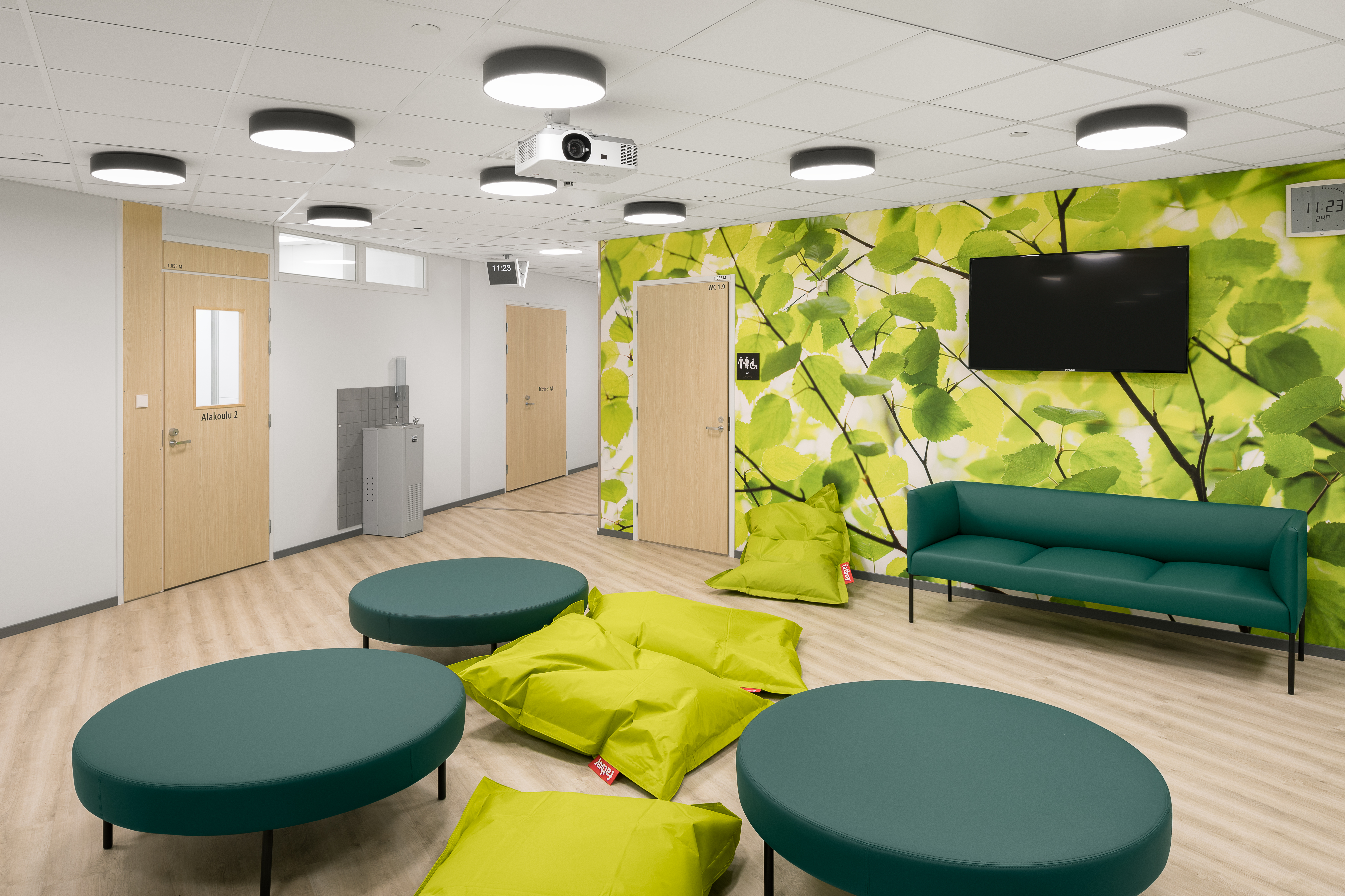 Die Natur ist auch in den Innenräumen vertreten, unter anderem in den Fluren und Wohnbereichen der Krankenhausschule.
