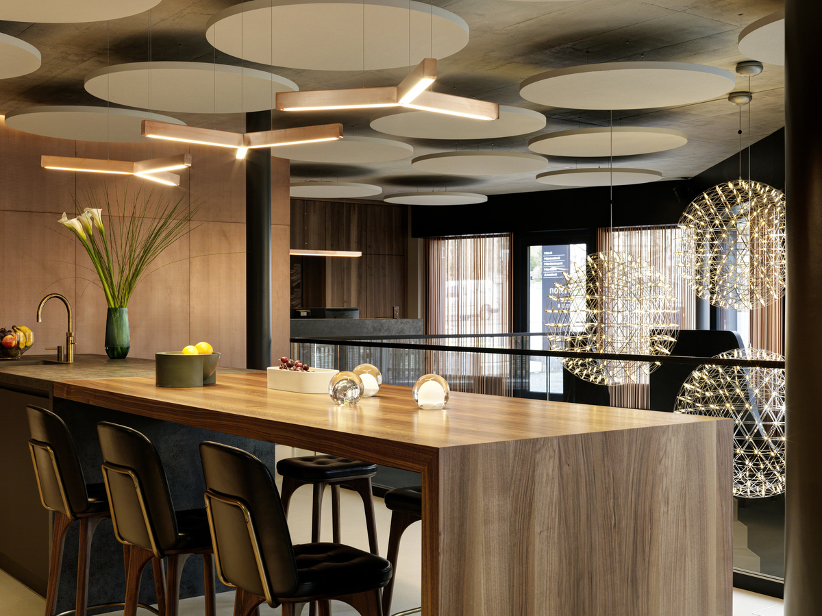 Within this minimalist setting, Ecophon Solo™ Circle acoustic panels play a key role. Their precise placement enhances spatial clarity and acoustic comfort, allowing the materials and detailing to remain the focal point of the interior.
