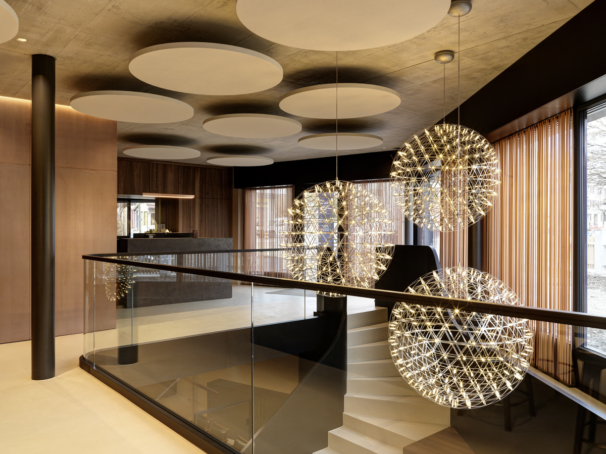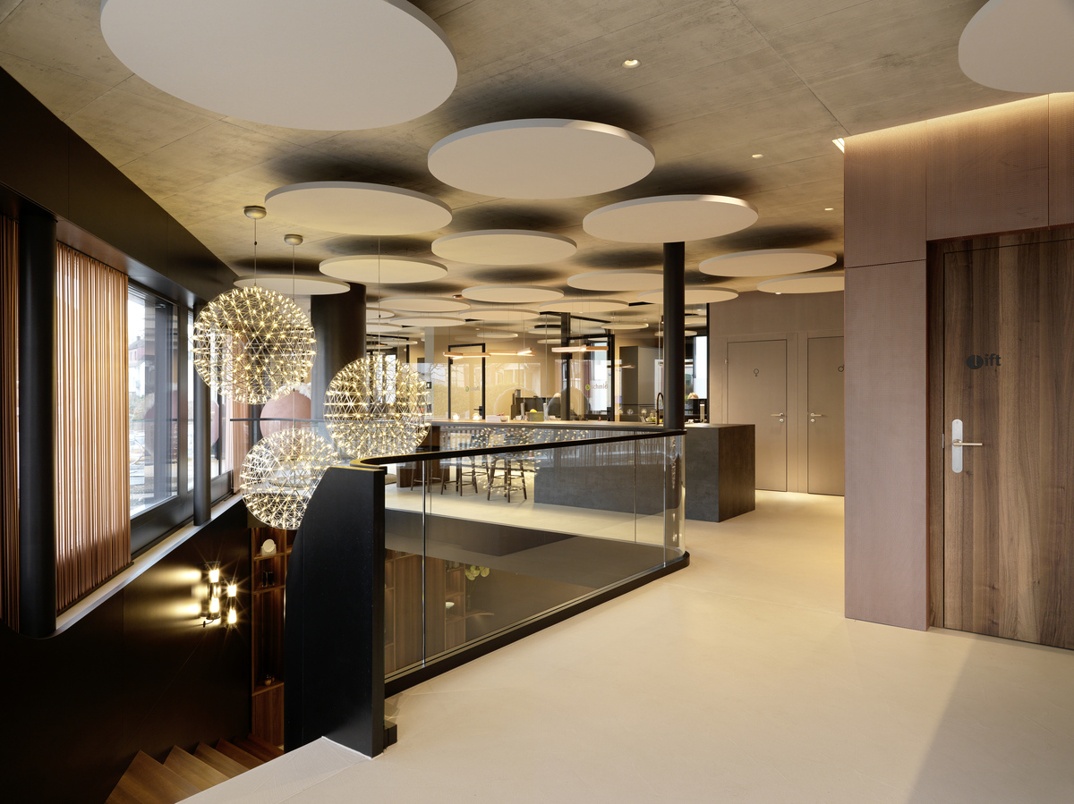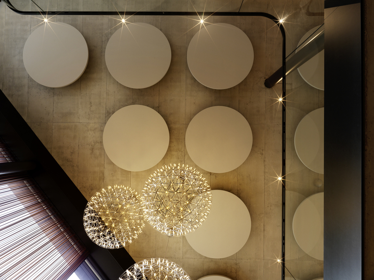 The building’s geometry and exposed concrete ceilings required a lighting and acoustic concept that delivers high performance without visual intrusion. The floating circular panels introduce softness, balance, and a subtle architectural rhythm, creating spaces that feel calm, considered, and highly functional.