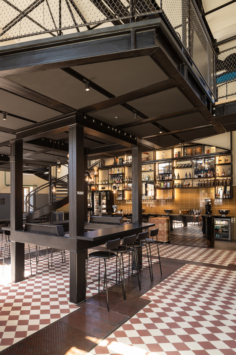 The design approach was guided by respect for the original structure. Façades, windows, doors and many interior details were carefully restored, and elements such as pipework and steel trusses were intentionally left exposed. Where materials could not be preserved, they were reconstructed to maintain the authentic appearance – including the distinctive red-and-white checkered floor, recreated based on historical documentation.