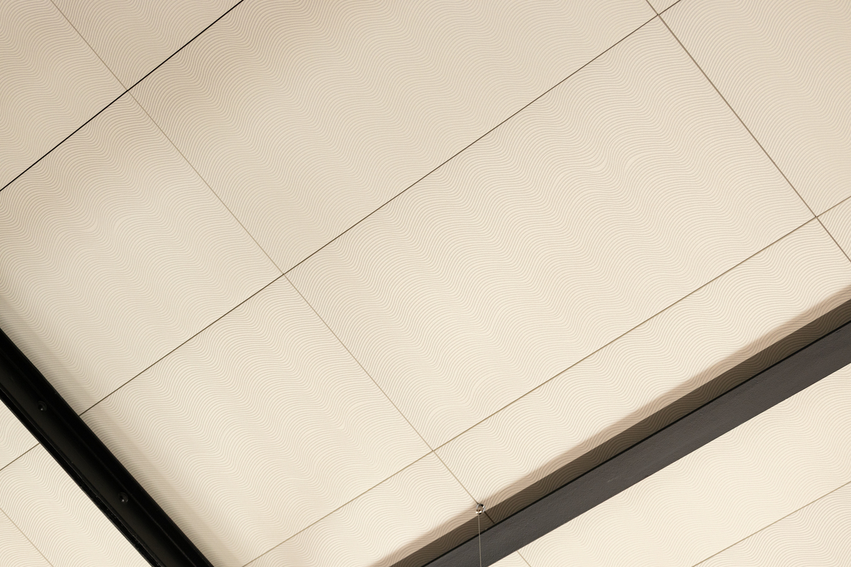 The building’s large volumes and architectural constraints posed acoustic challenges. In the former boiler hall, new Ecophon Master™ SQ panels were developed with a wave-like printed pattern inspired by the original suspended ceiling. The solution enhances the acoustic comfort while blending naturally into the industrial surroundings. Additional acoustic treatment included spray-applied material on upper wall sections, textile carpeting, and a black Ecophon Focus™ Dg system under the mezzanine to discreetly reduce reverberation.