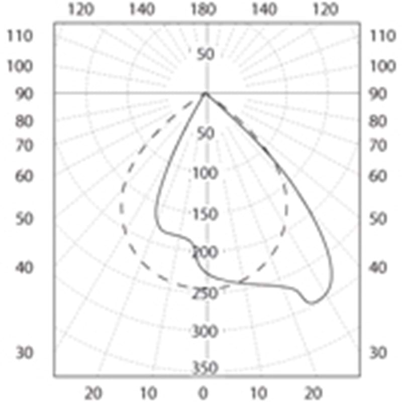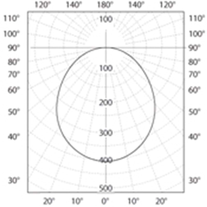 La curva de distribución luminosa es un trazado sobre un diagrama polar. Indica la intensidad luminosa de la luminaria en cd/klm en diferentes direcciones en función del ángulo de visión en uno o más planos. Una línea continua muestra la distribución de la luz perpendicular al eje longitudinal de la lámpara, y la línea discontinua muestra la distribución de la luz en la dirección longitudinal. La dirección hacia arriba y hacia abajo muestra la salida de luz directa o indirecta de la luminaria. Los datos de salida de luz también se pueden usar para la planificación de luz en un software (por ejemplo, Dialux).