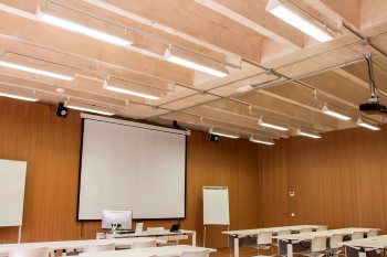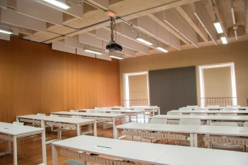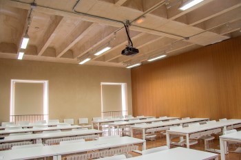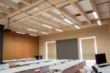 Los productos que Saint-Gobain Ecophon ha incorporado a este aula han sido 45 m2 de Ecophon Solo™ Baffles 1200 x 600 x 40mm, que se han instalado verticalmente en las bovedillas existentes y que han permitido reducir notablemente la presión sonora, además de contribuir a limitar el tiempo de reverberación. También se ha instalado 6 m2 de Ecophon Akusto™Wall 2700 x 600 x 40mm en una de las paredes, lo que mejora sustancialmente la calidad del discurso y controla la reverberación.