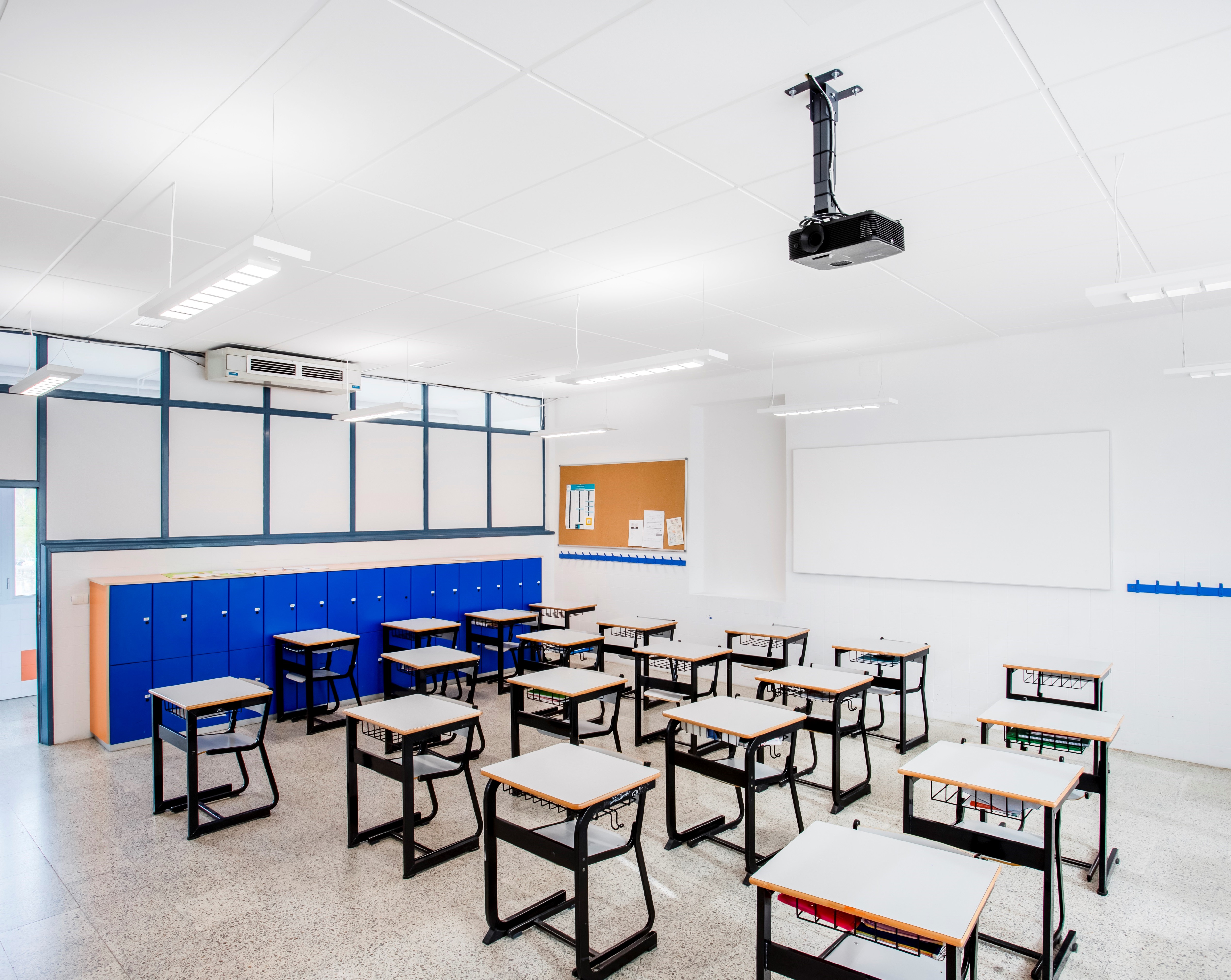 Con el objetivo de saber si la climatización difusa a través del techo puede ofrecer una solución más silenciosa, confortable, sostenible y económica, se compararon cuatro aulas con tratamientos acústicos casi idénticos, pero que diferían en el tipo de sistema de climatización utilizado. En dos de las cuatro aulas, se instaló la climatización de techo difusa, mientras que las aulas restantes se mantuvieron con ventilación tradicional. Todas las aulas se remodelaron con un techo suspendido Clase A de absorción de 40 mm de espesor, y un panel fonoabsorbente de pared en la vertical opuesta al profesor.