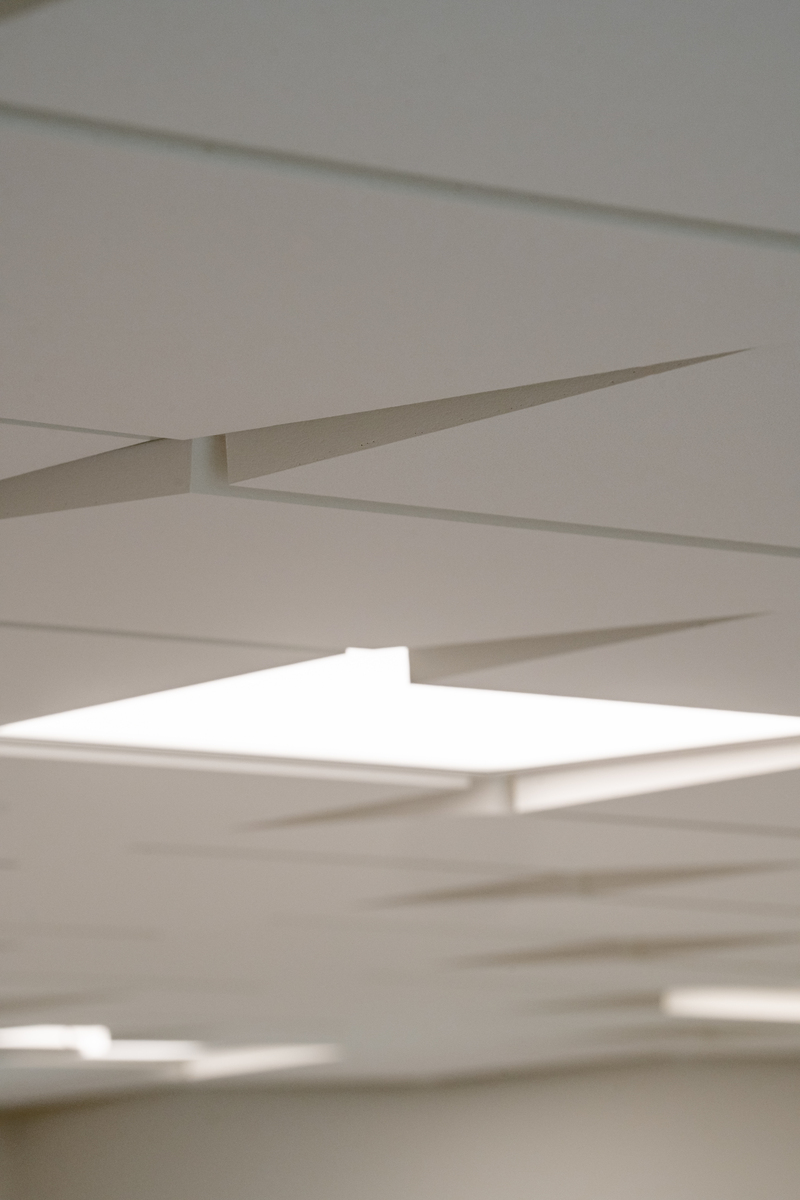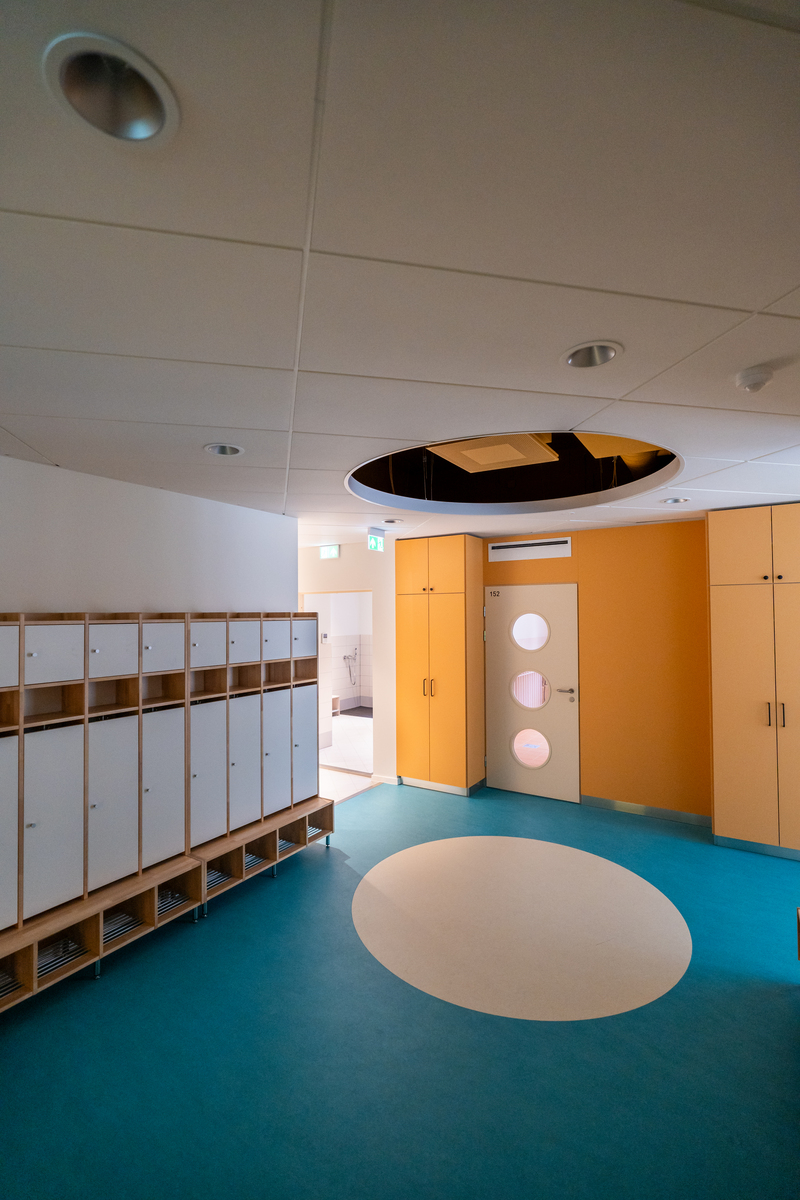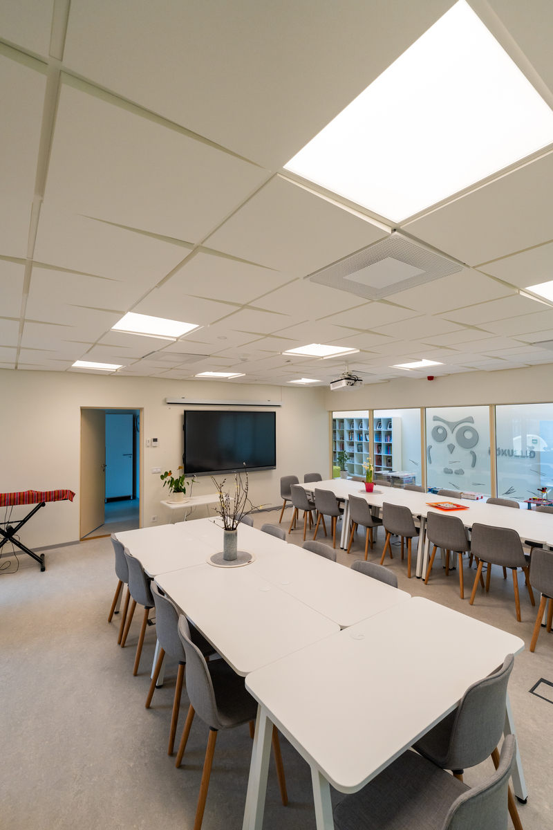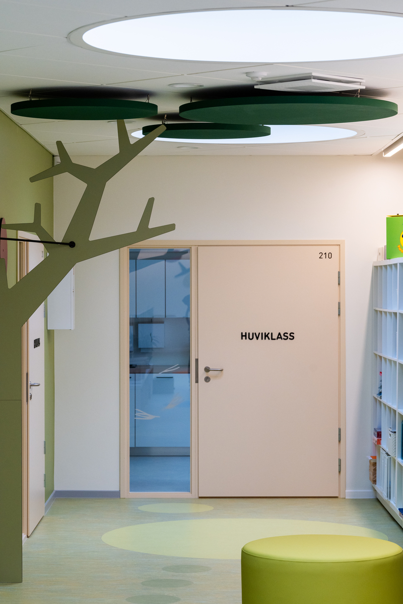 Los materiales cuidadosamente seleccionados y las soluciones de diseño fueron fundamentales para crear un entorno óptimo para los niños y el personal. El confort acústico desempeñó un papel fundamental, ya que un entorno sonoro tranquilo es esencial para la concentración, la comunicación y la recuperación. En los salones, los paneles Ecophon Akusto™ One/Texona en los tonos Garlic y Ginger añaden carácter visual y una excelente absorción acústica. En las salas para grupos y otros espacios de aprendizaje, los paneles Ecophon Industry™ Modus TAL y Ecophon Focus™ Ez garantizan un ambiente acústico equilibrado y propicio.