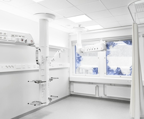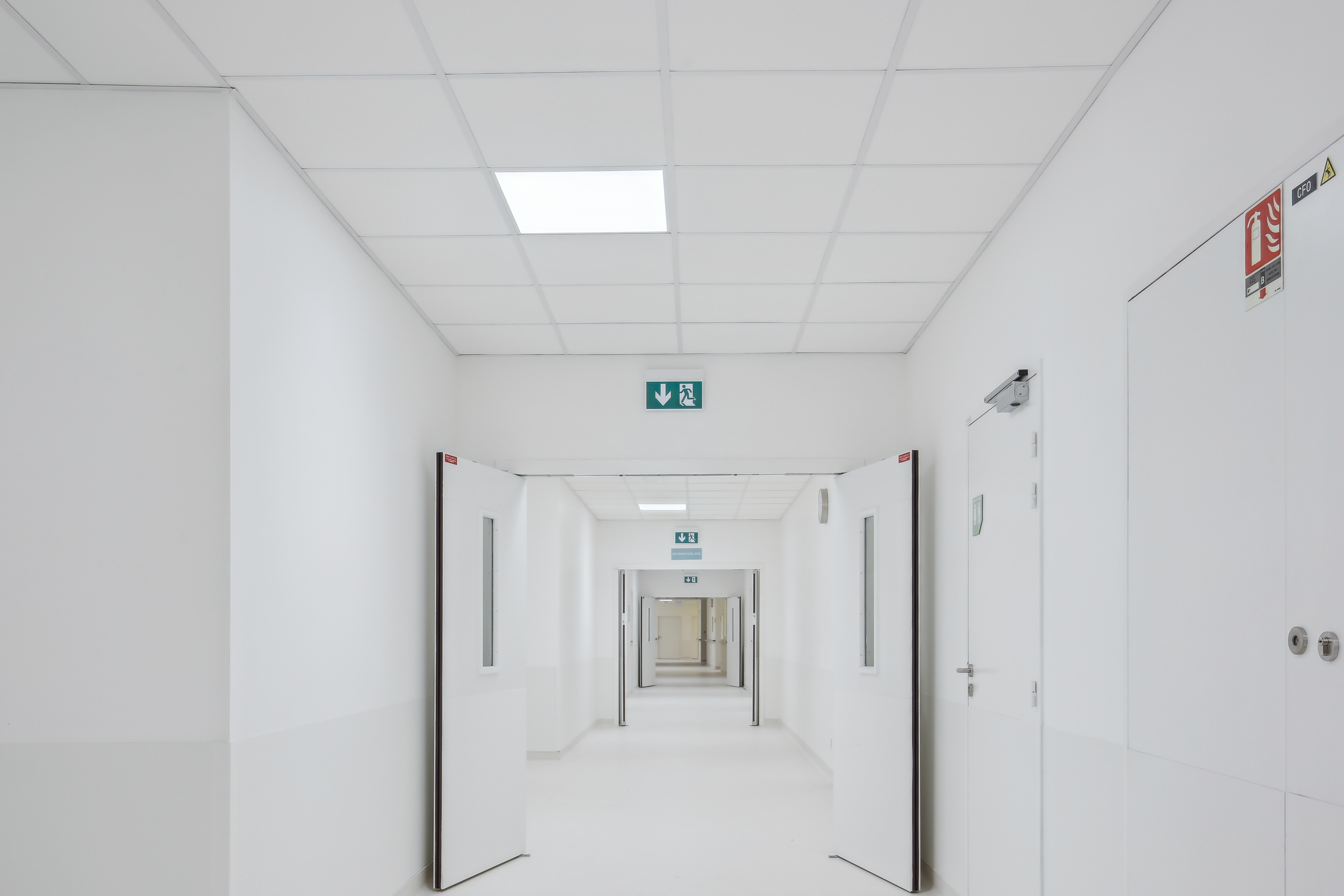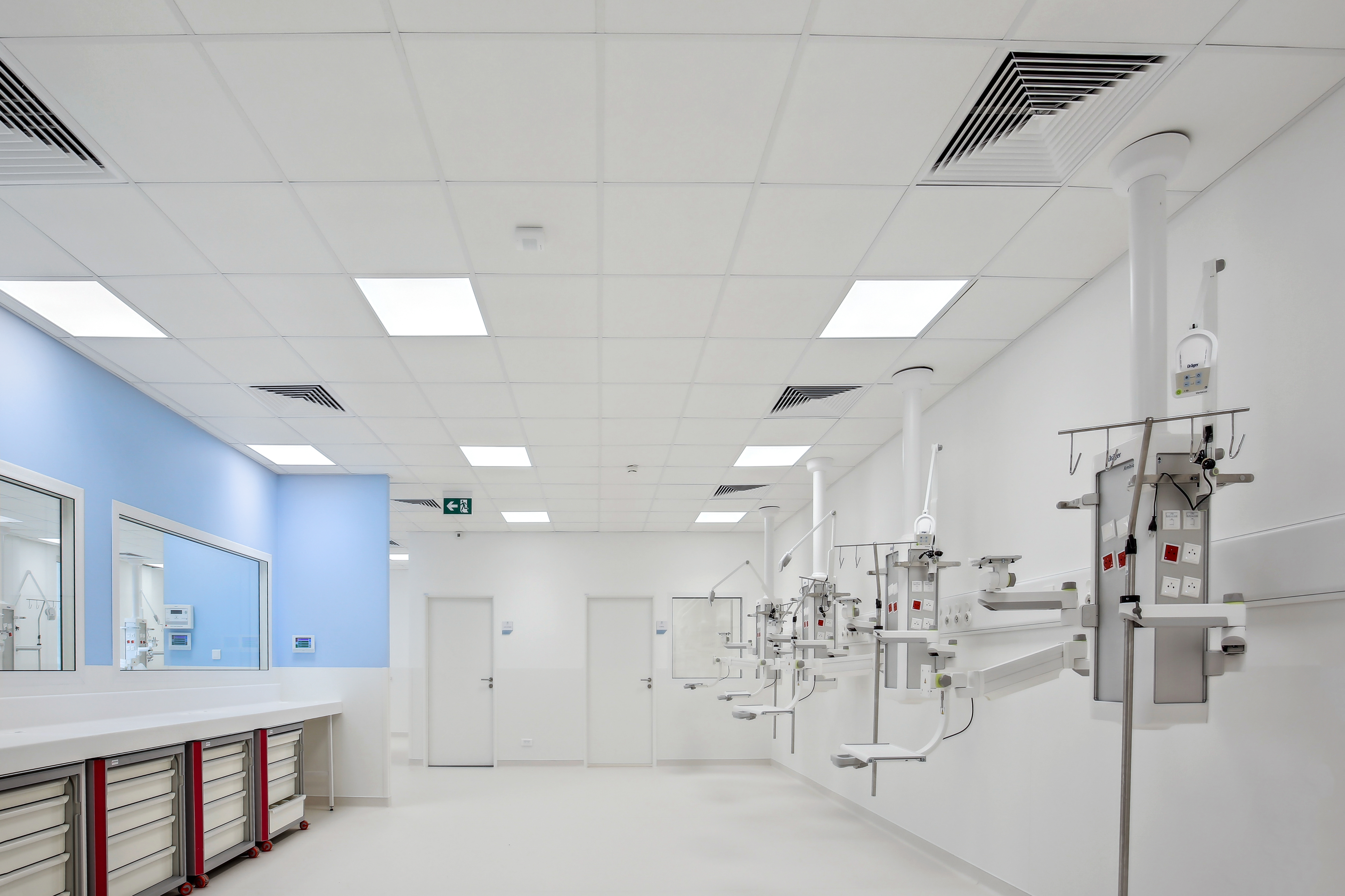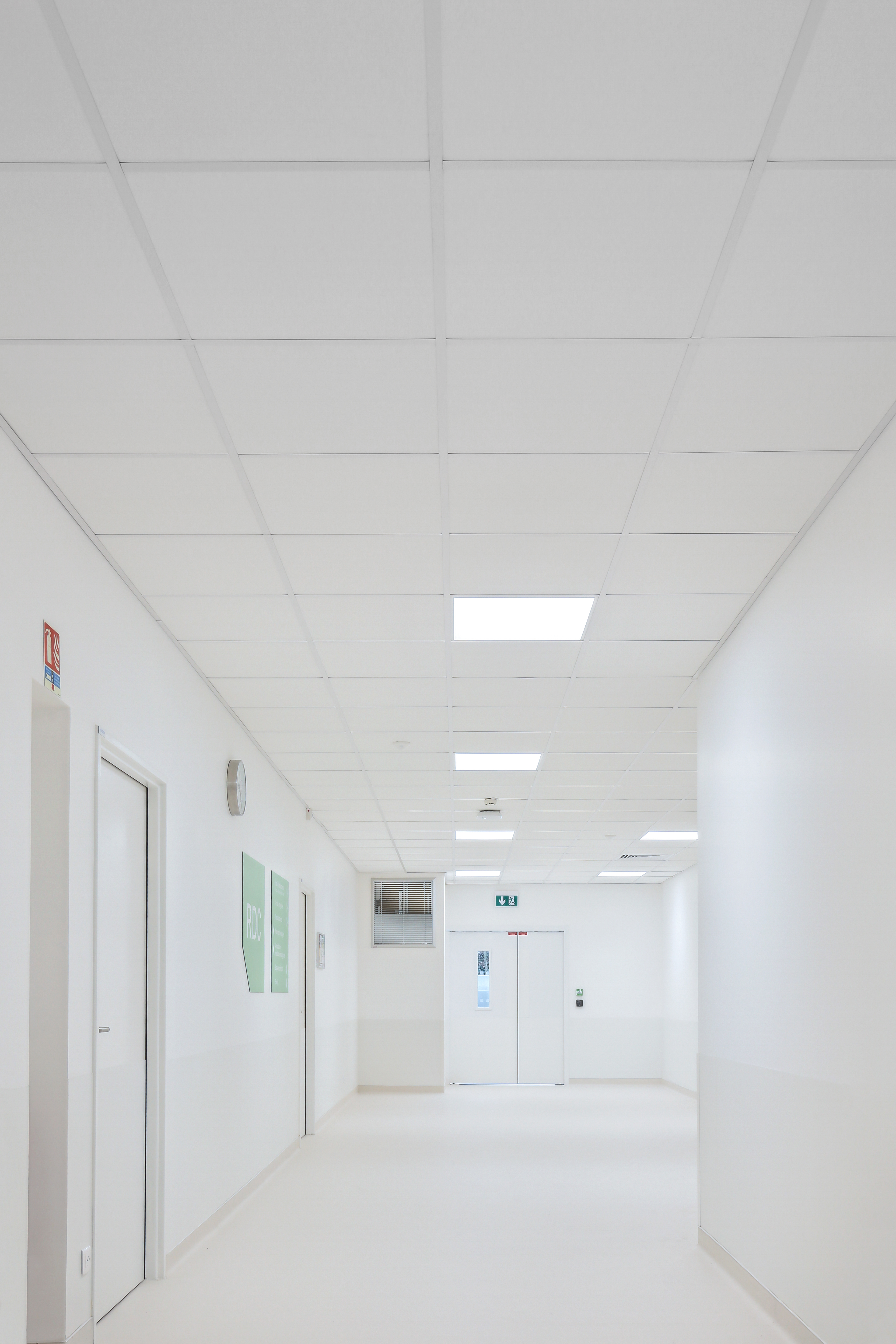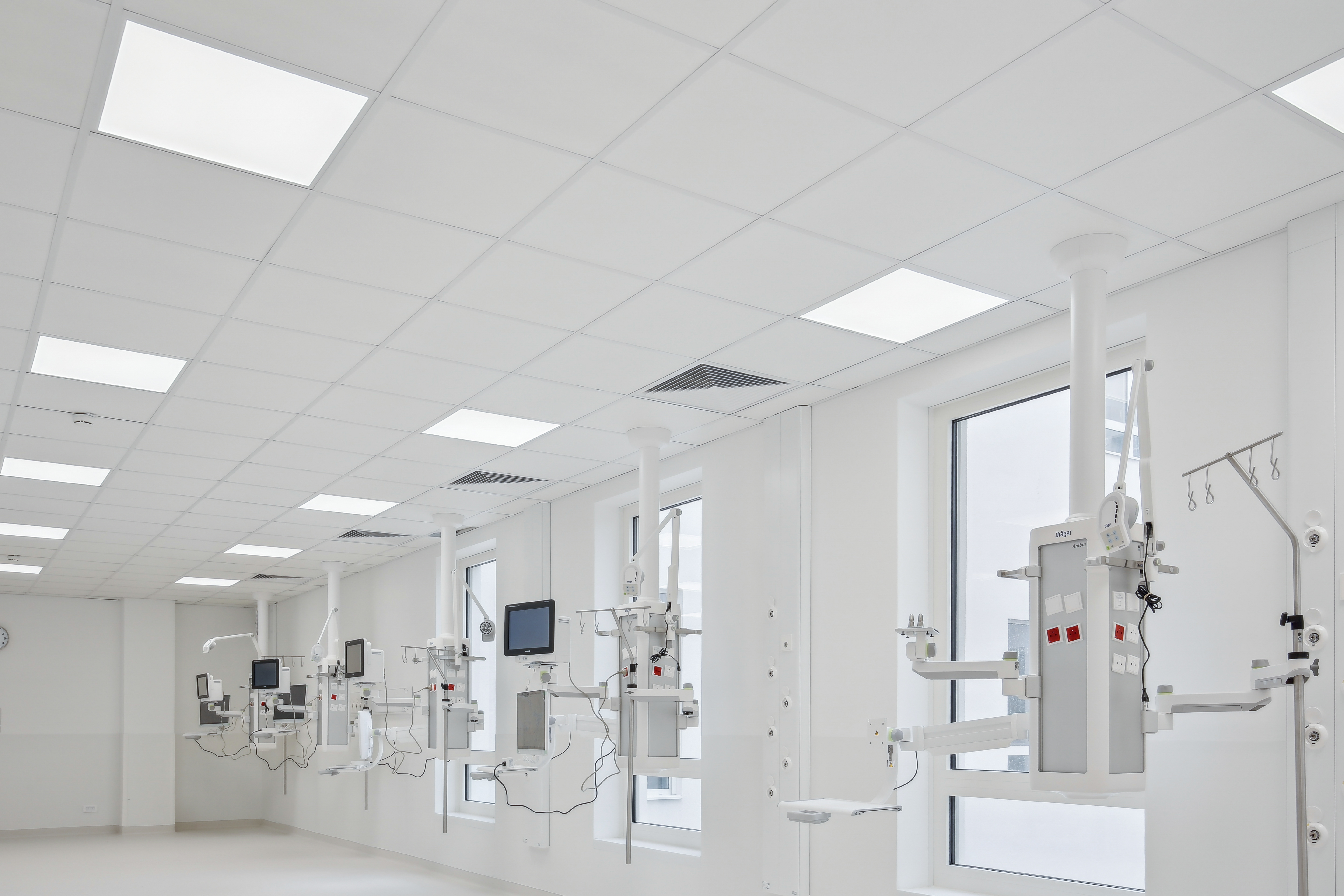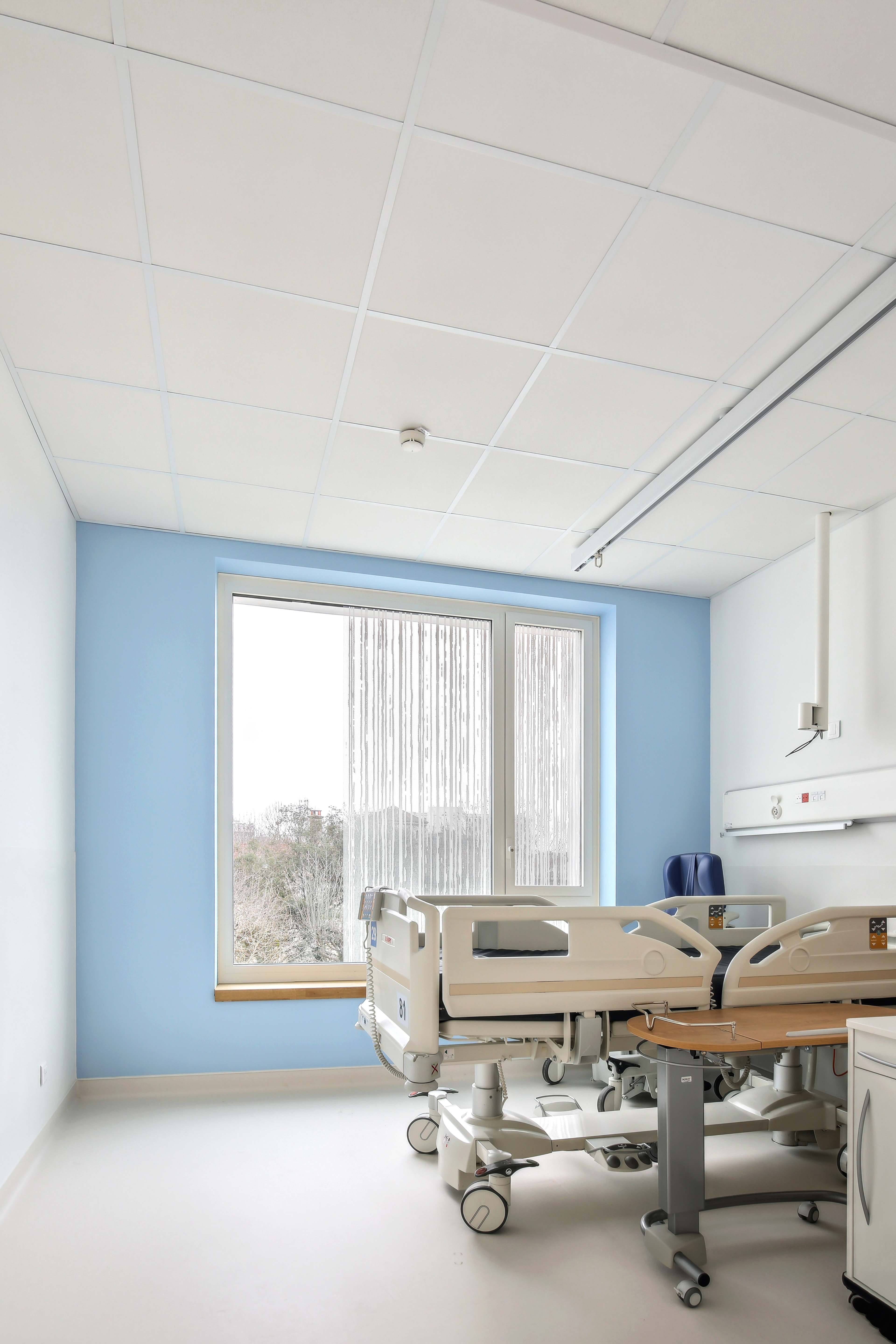 Pour pallier le bruit dans les couloirs très fréquentés, 5 030 m² de dalles Ecophon Advantage™ A ont été posés. Dans les zones de circulation des blocs opératoires, les chambres standard et les bureaux, 4 300 m² de dalles Ecophon Hygiène Clinic™ ont été installés, garantissant une haute qualité de l’air intérieur et empêchant la prolifération des bactéries (Classe 0, méthode A/C - ISO 846). Les blocs opératoires, salles de réveil, chambres hautement médicalisées et PC soignants ont, quant à eux, bénéficié de 1 936 m² de dalles Ecophon Hygiene Protec™ Air. Ce système, répondant aux normes les plus strictes, est particulièrement adapté aux environnements où l'hygiène est primordiale. Enfin, les locaux médicaux de nettoyage, de réserve et de soins ont été équipés de dalles Ecophon Hygiene Performance™, tandis que les locaux de rangement, de circulation logistique et les cabines de change ont été pourvus de dalles Ecophon Hygiene Meditec™.