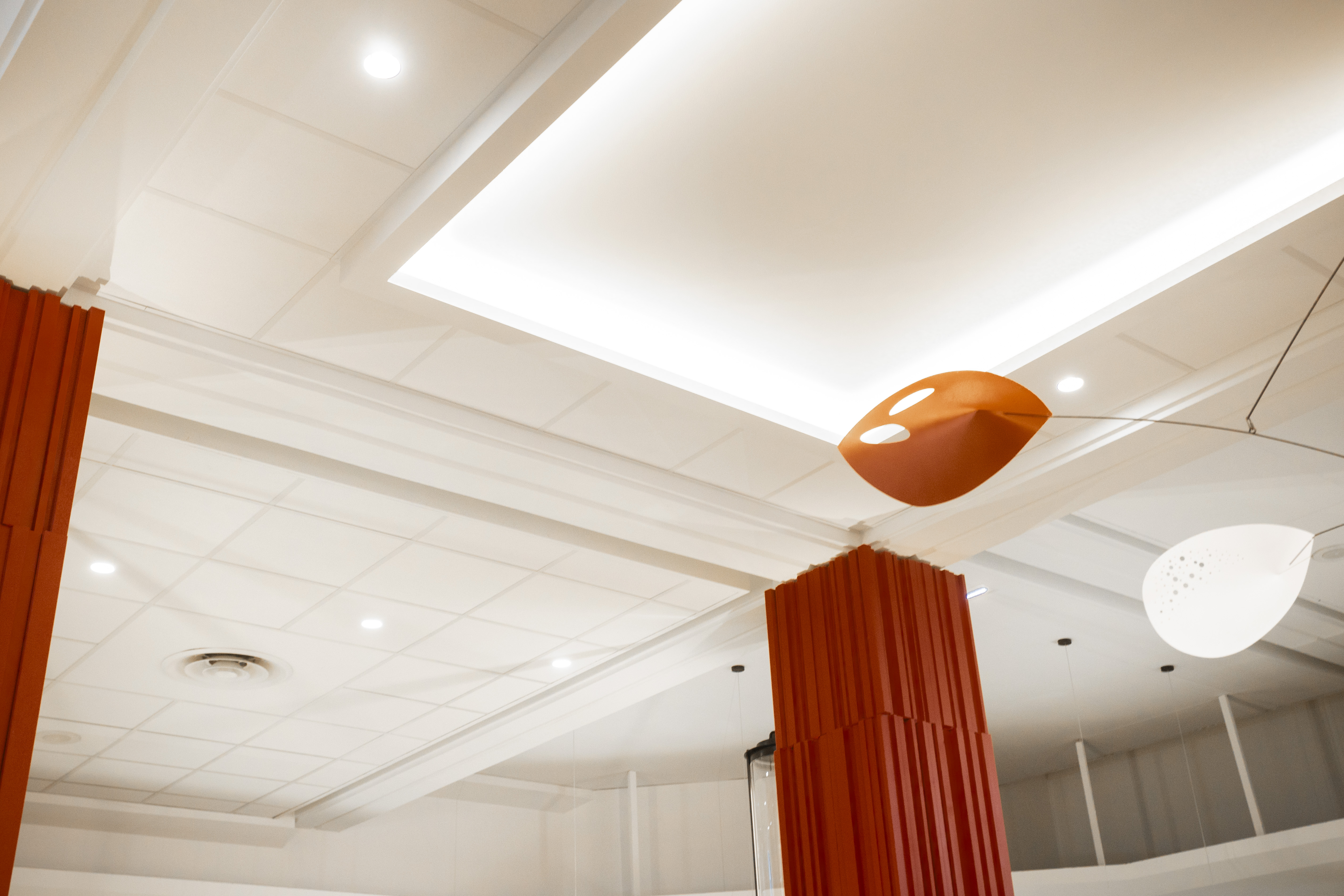 Ces plafonds modulaires acoustiques permettent également de délimiter visuellement les différentes zones d’usage, en optant pour deux tailles de dalles différentes, créant des ambiances adaptées tout en optimisant l’absorption acoustique dans un espace à la fois vaste et très fréquenté.