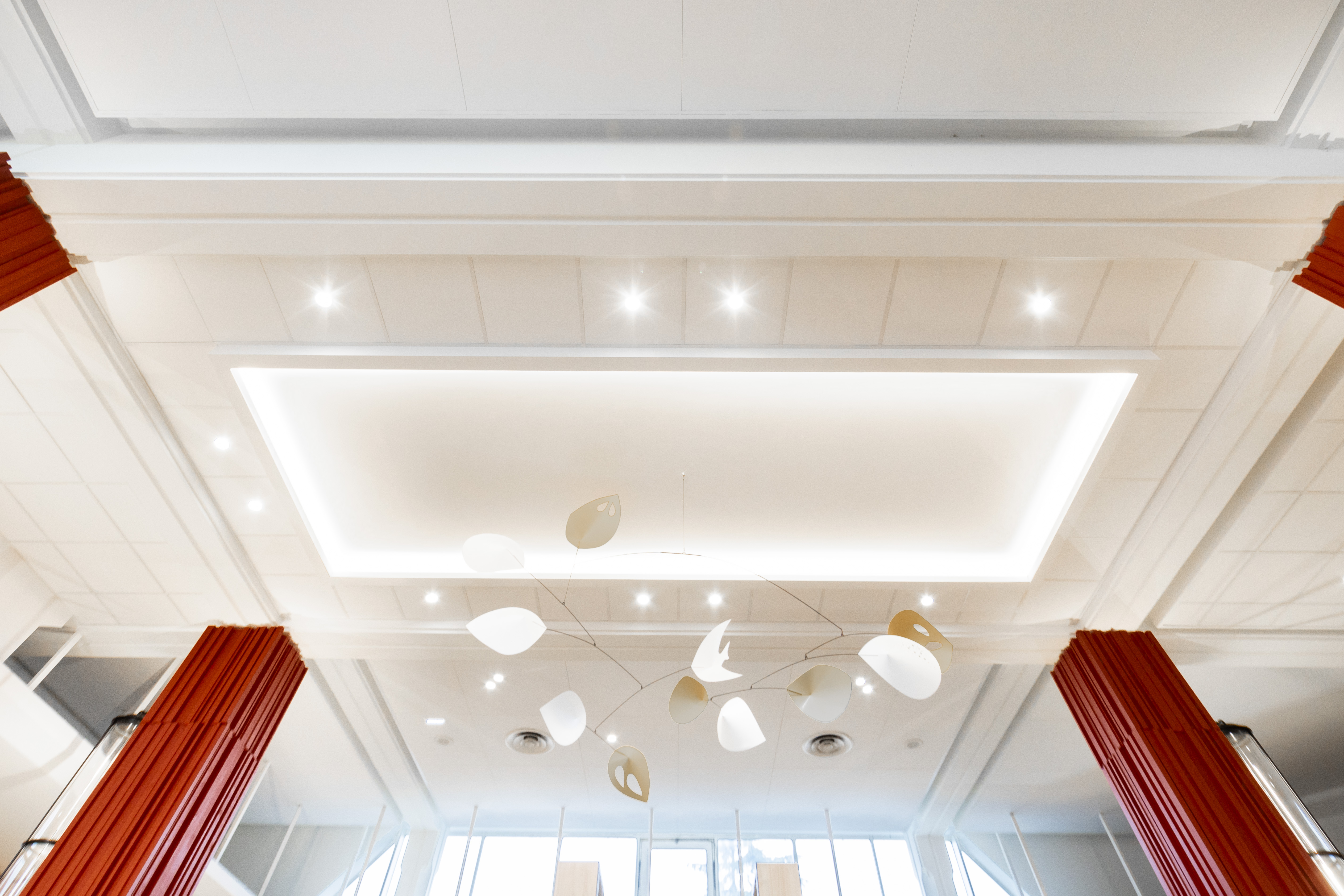 Elles ont été choisies pour leurs performances acoustiques adaptées à des espaces de passage intensif. Ces solutions offrent un excellent contrôle du bruit (aw ≃ 0,95) et contribuent à une ambiance harmonieuse, essentielle dans un espace aussi fréquenté.