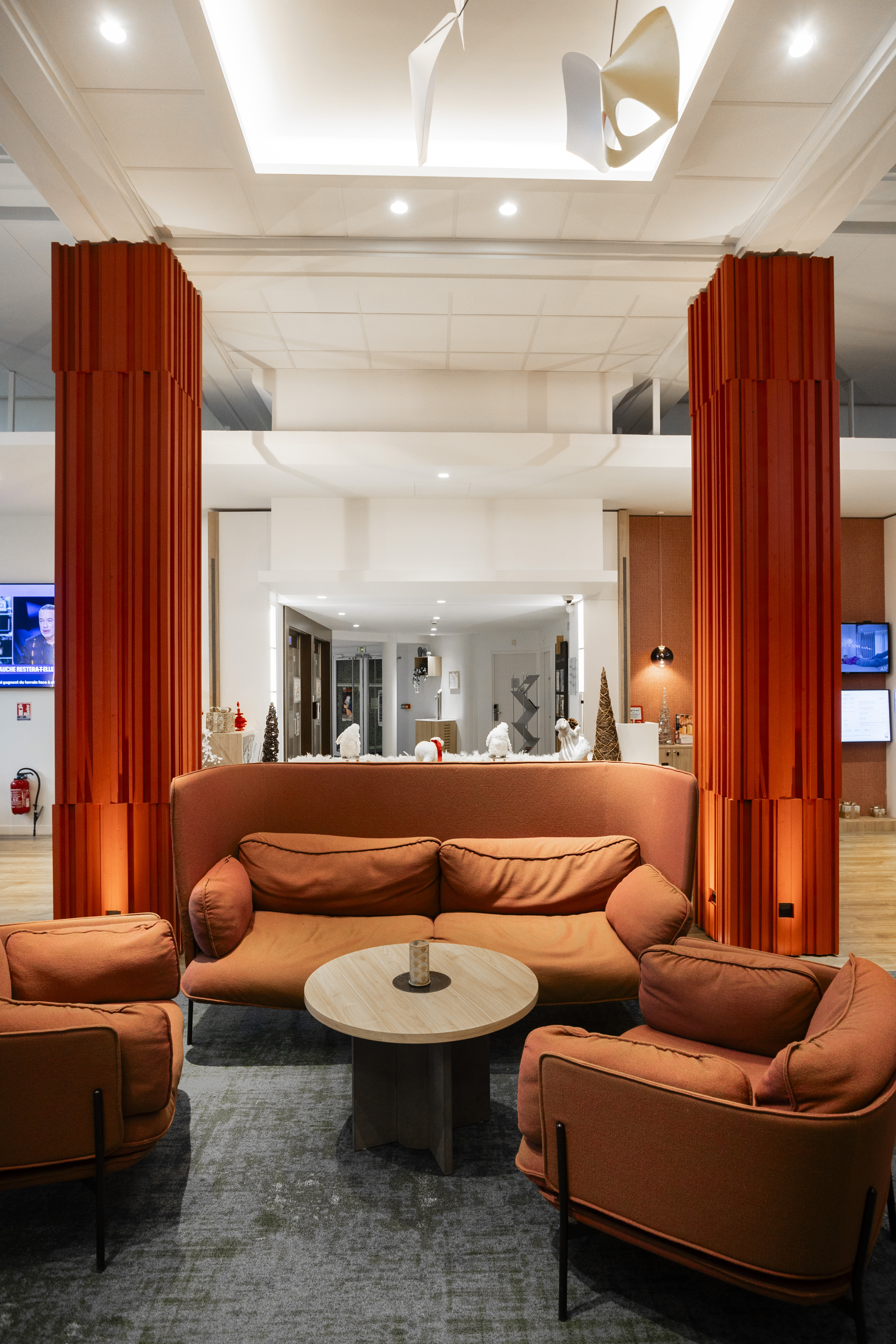 Grâce à leurs bords discrets, ces dalles ont contribué à sublimer le design du Novotel en lui apportant une touche de modernité et de design, tout en se mélangeant à un mobilier au charme des années 70 et aux magnifiques colonnes de cet espace.