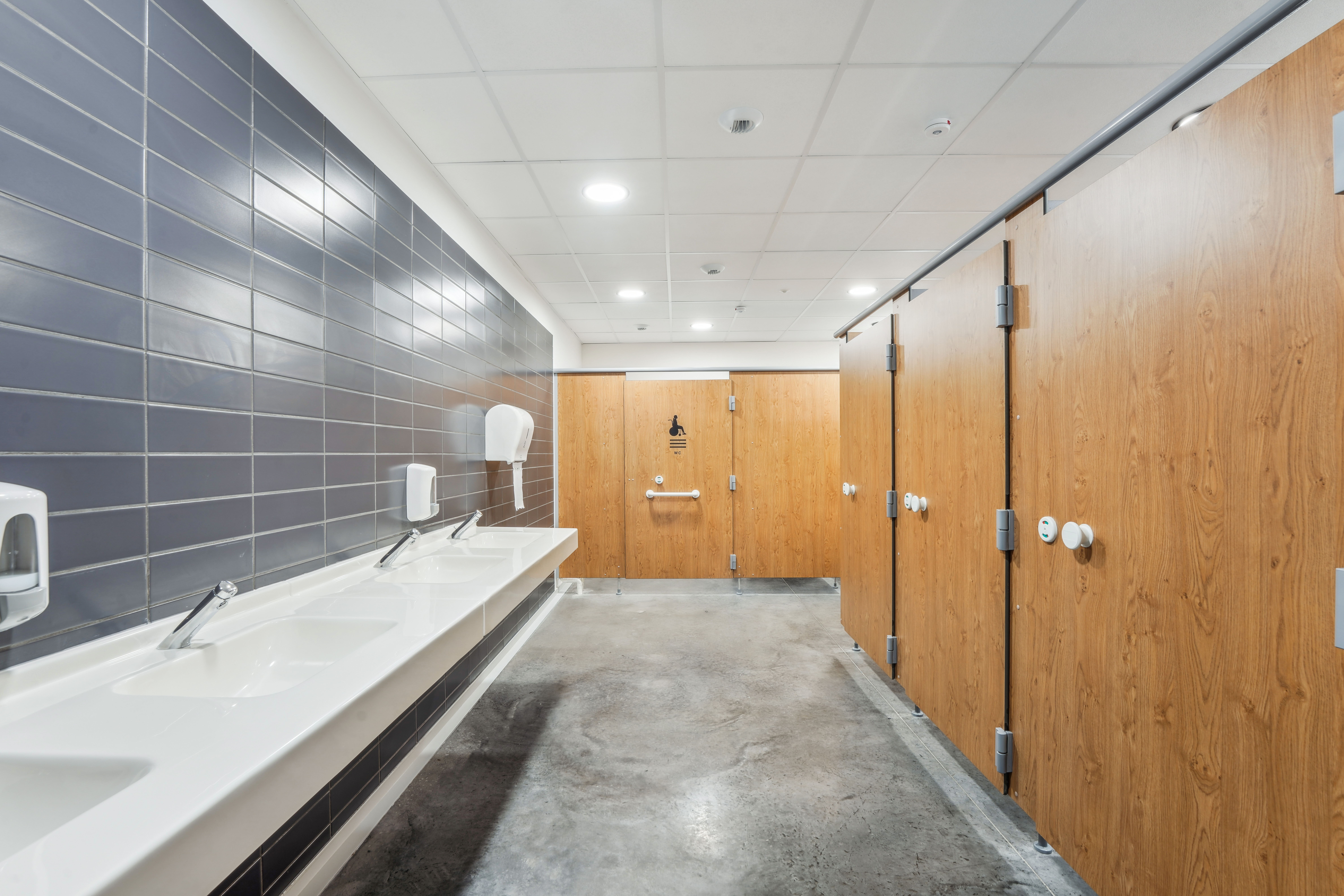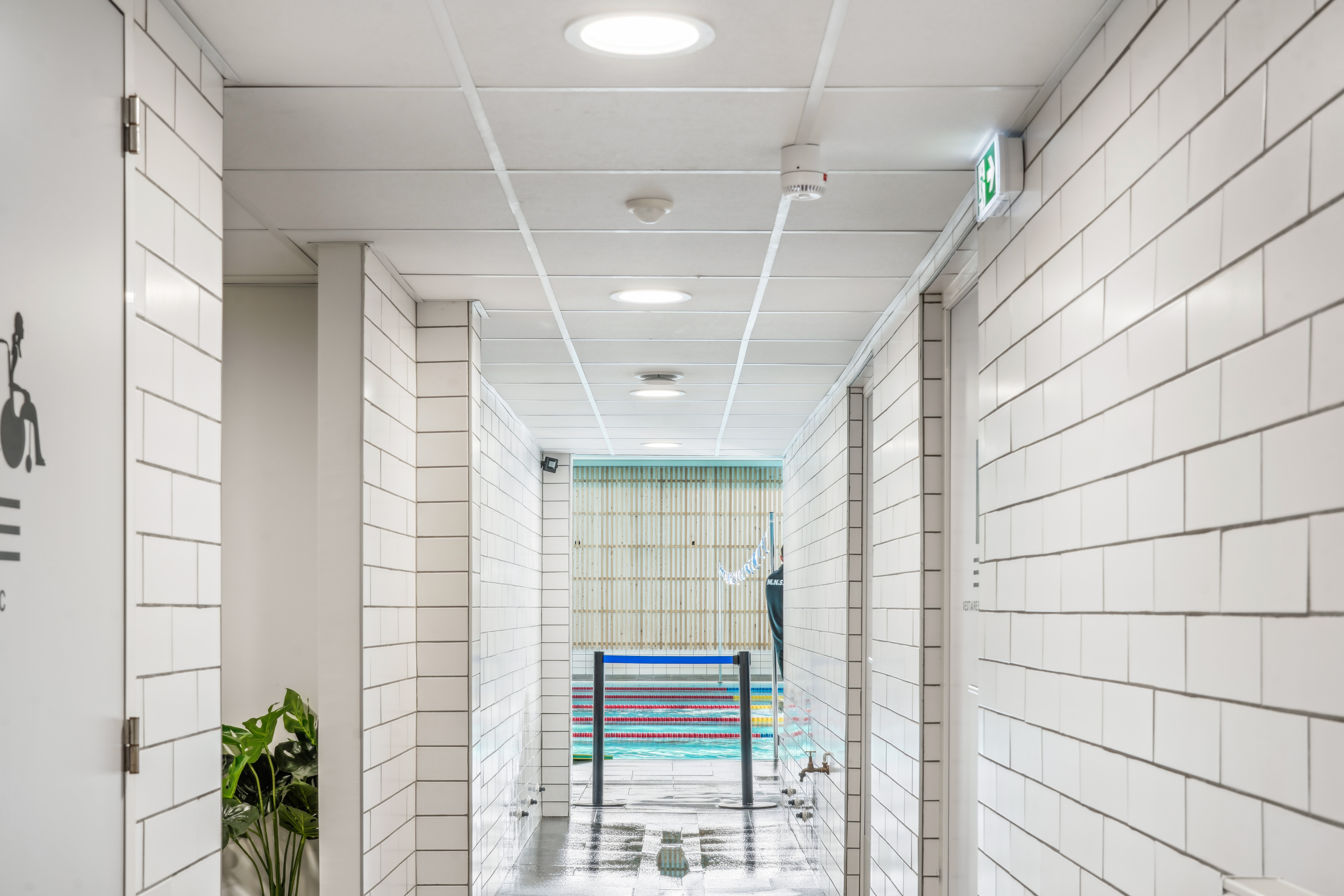 Les autres espaces du complexe, tels que les vestiaires, ont également été équipés avec soin pour répondre à des critères spécifiques. Ainsi, 300 m² de dalles Ecophon Advantage™ ont été installées, offrant une solution fonctionnelle répondant aux exigences essentielles telles que l'acoustique, la résistance à l'humidité et la résistance mécanique. Ces panneaux, constitués de laine de verre de haute densité revêtus sur la face apparente d'un voile de verre peint, garantissent une absorption acoustique maximale de classe A (αw = 1). Le système, monté sur plénum isolé avec une ossature apparente, facilite par ailleurs la maintenance courante dans ce type d’espace.