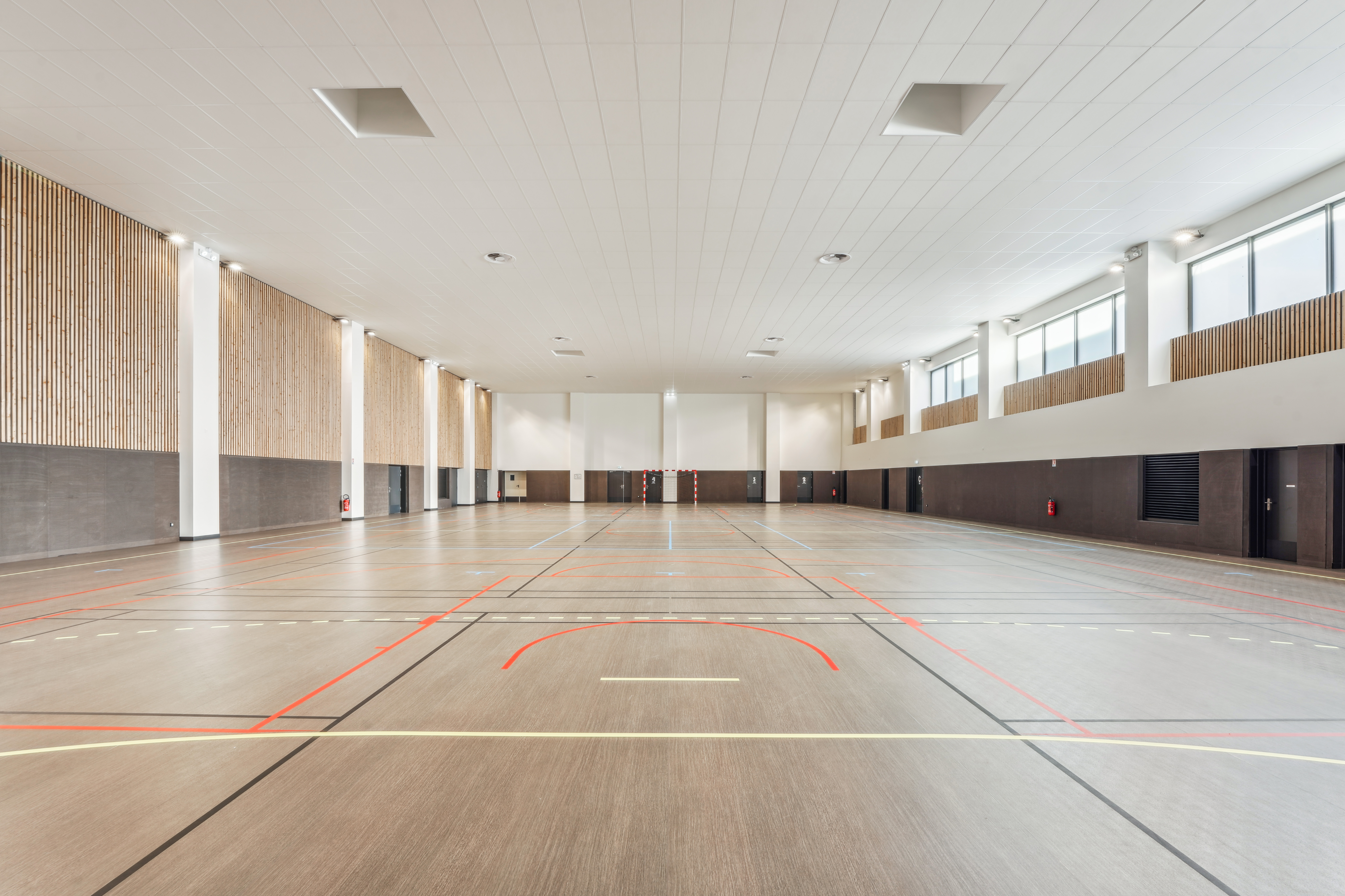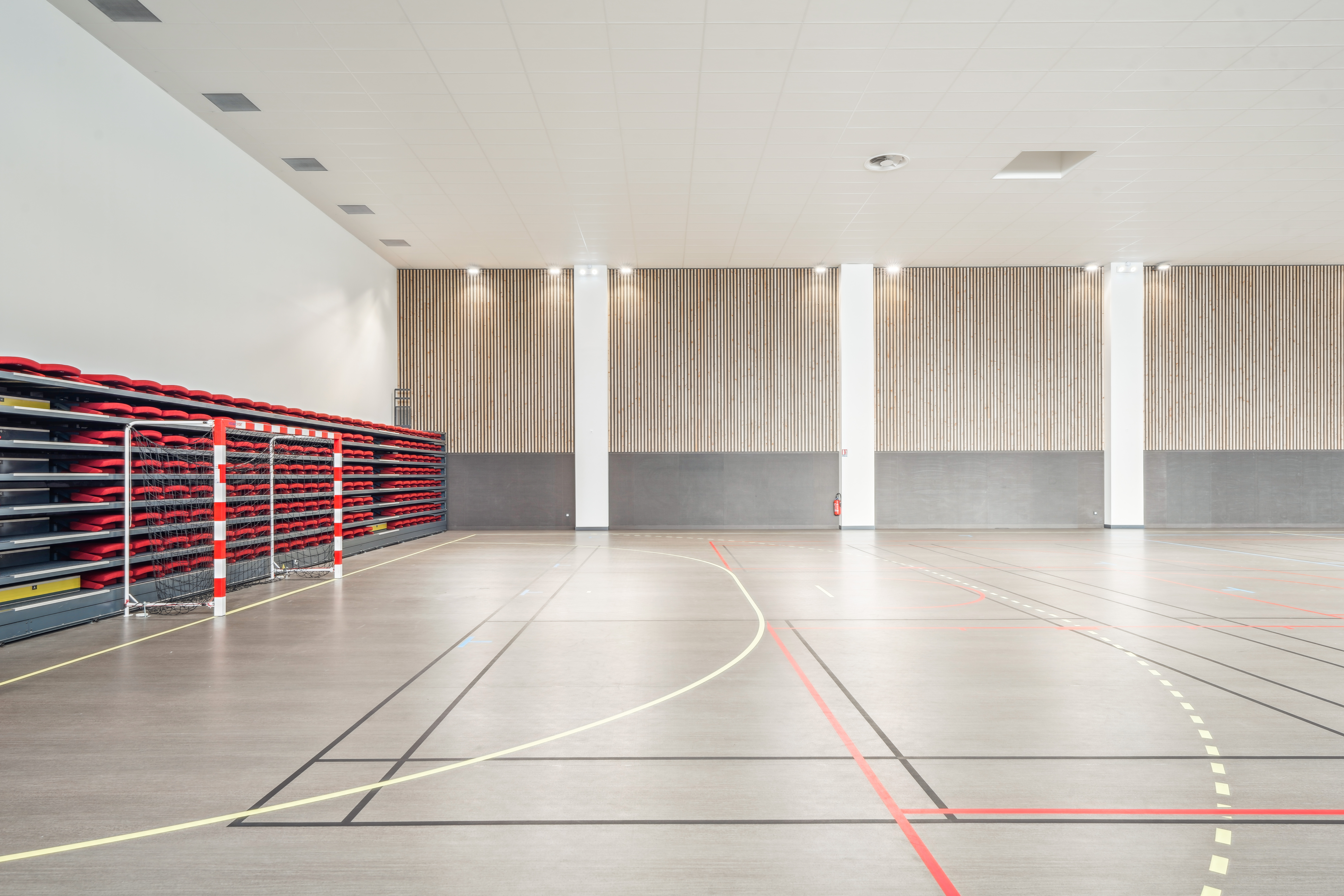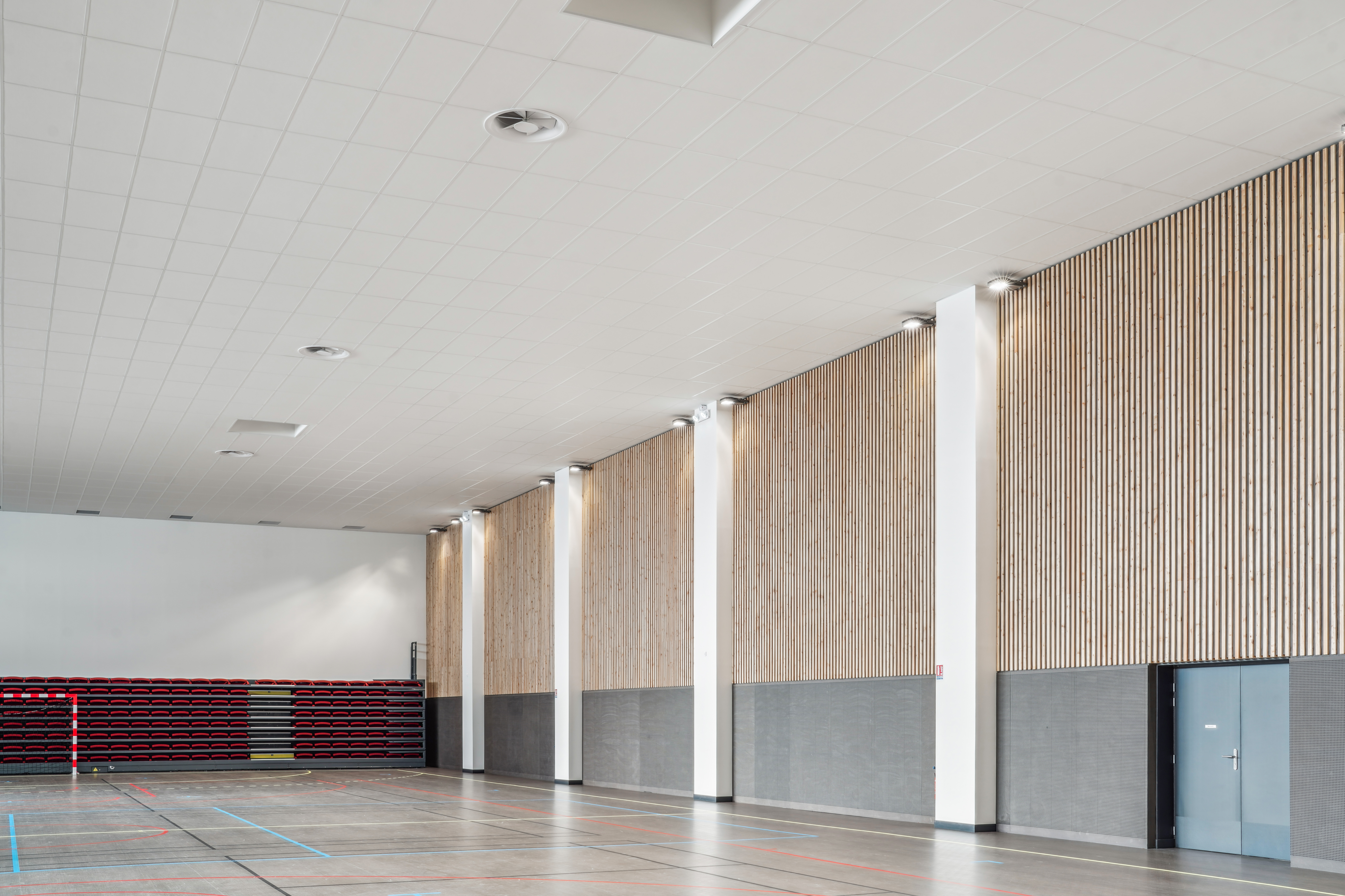 Le traitement acoustique des plafonds de la salle polyvalente a été un élément clé venant compléter les cloisons acoustiques installées sur grande hauteur. En effet, la salle accueillant des évènements très variés, aussi bien sportifs que culturels, l’objectif était d’avoir une solution qui assure une correction acoustique efficace tout en offrant une forte résistance aux impacts mécaniques.