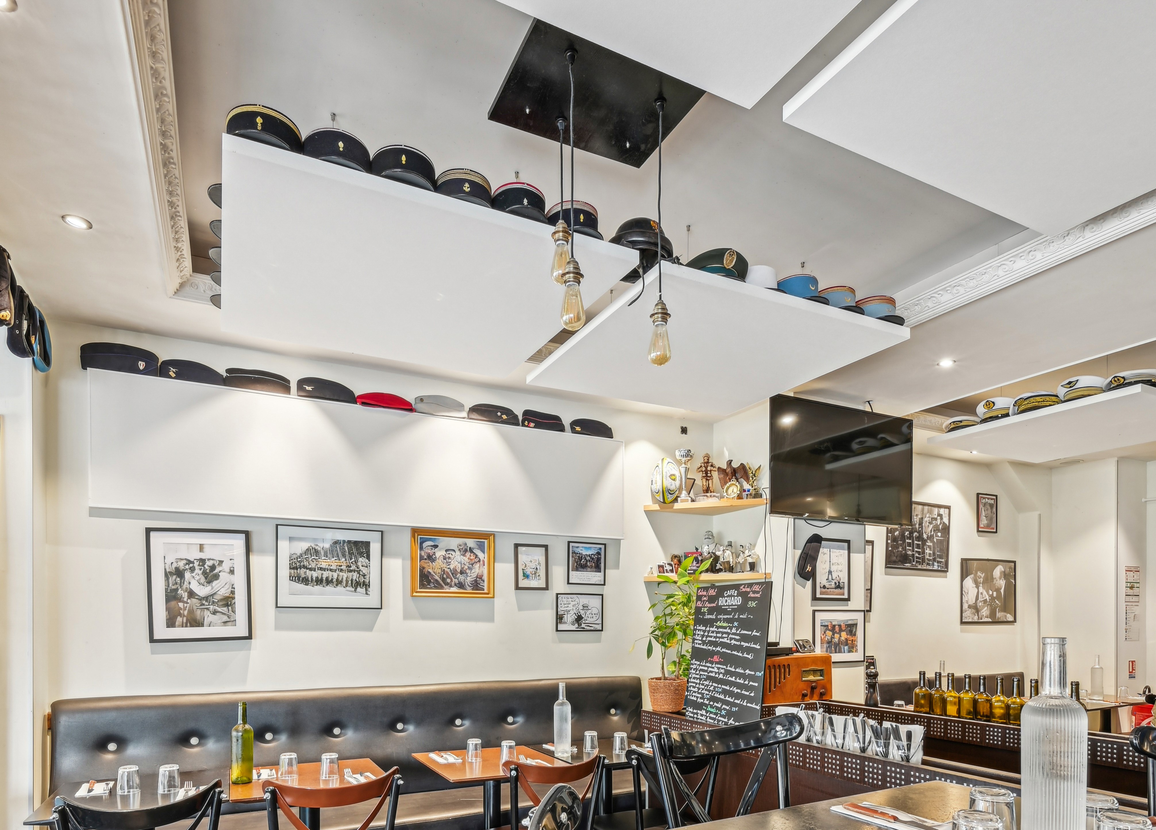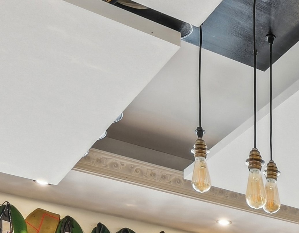 Installation de plusieurs panneaux acoustiques Ecophon Akusto™ Wall C Blanc dans le creux intérieur de la corniche, une surface verticale disponible. Le traitement de cette zone libre a permis d'ajouter des matériaux acoustiques sans nuire à l'utilisation potentielle d'autres murs par le restaurateur.