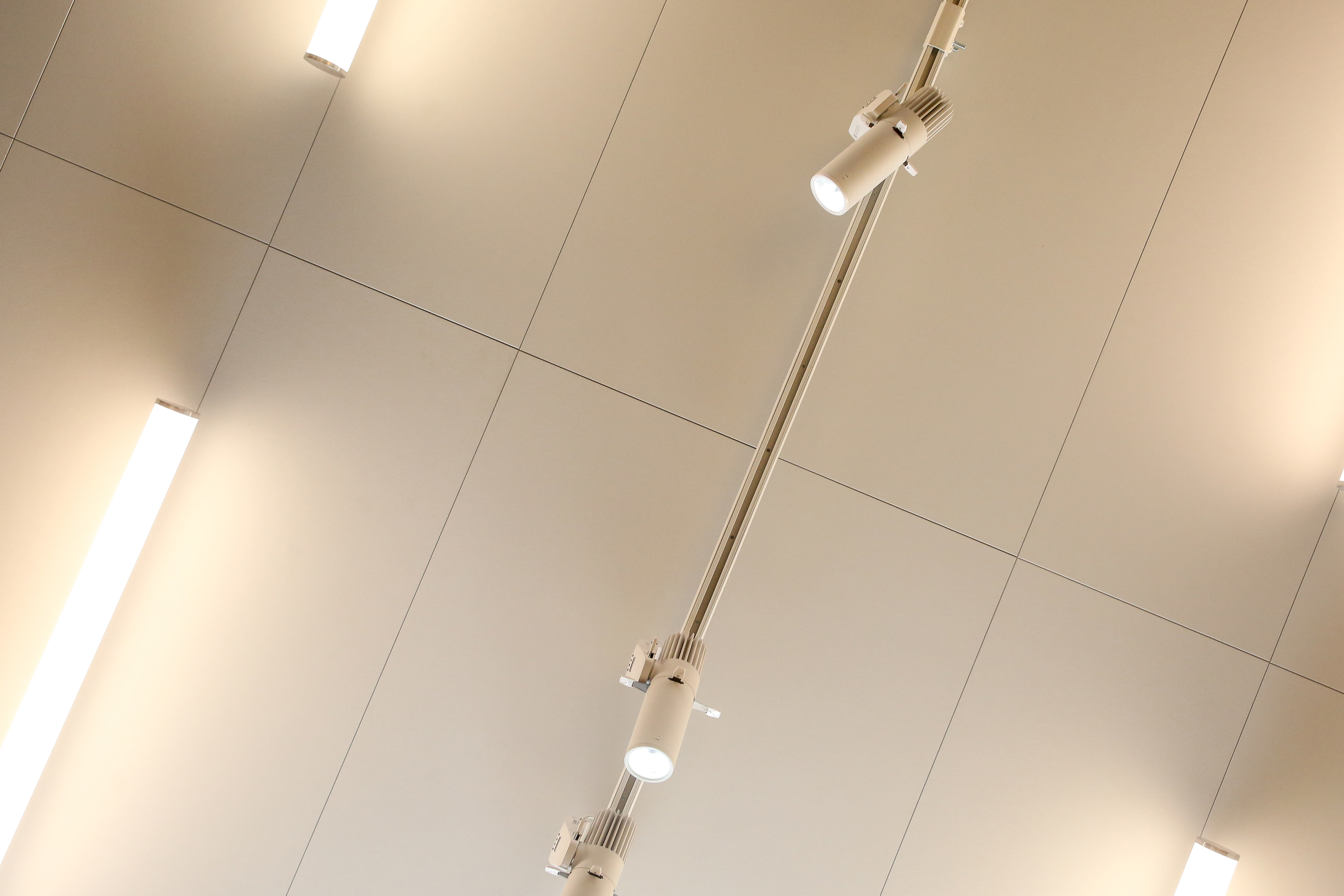 La scénographe a également apprécié la sobriété apportée par ce produit. L’Ecophon FocusTM Ds est un système de plafond modulaire acoustique élaboré. Du fait de son ossature dissimulée et ses dalles à bord biseauté, avec une rainure étroite entre chaque dalle, le Focus Ds est tout simplement design. Les dimensions de ses dalles pouvant aller jusqu’à 2m40 mettent en évidence la direction principale de la pièce où il est installé. Il possède un design particulièrement soigné qui renforce l’esthétisme des lieux et l’harmonie architecturale. Il est facile à installer et l’intégration de luminaires ou de système de validation est très aisée. On distingue entre deux dalles un joint large dans le sens de la longueur de la pièce et un joint plus étroit dans le sens de la largeur. Cette solution pose une classe d’absorption A, des bords peints et un plafond linéaire à joint creux uni directionnel et bords vifs à angle droit.