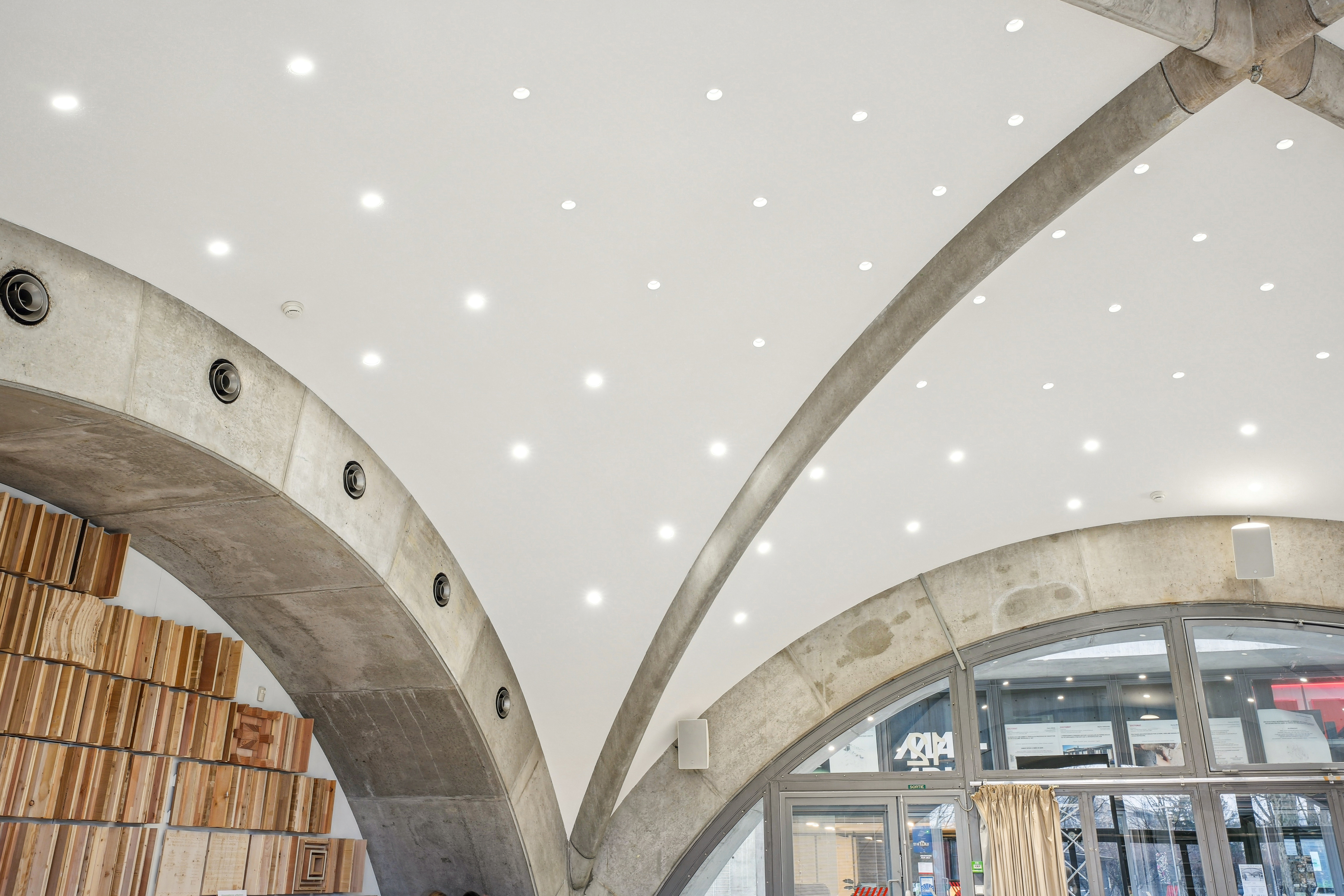 Cette architecture singulière, à la fois esthétique et technique, nécessitait une attention particulière pour intégrer une solution acoustique adaptée.