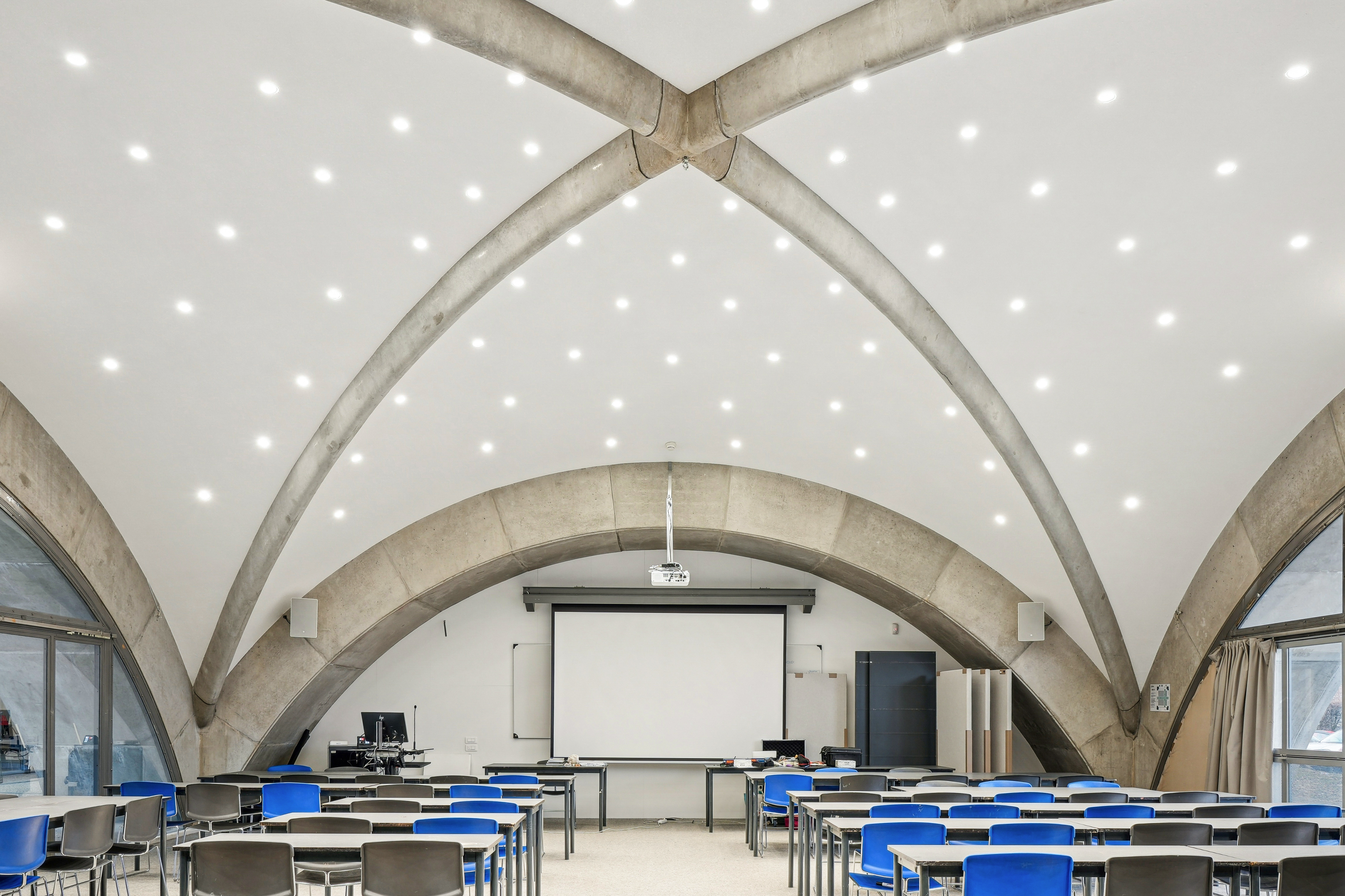 Cette grande salle de 143 m² se distingue par son impressionnant plafond voûté, composé de quatre grandes coques courbées.