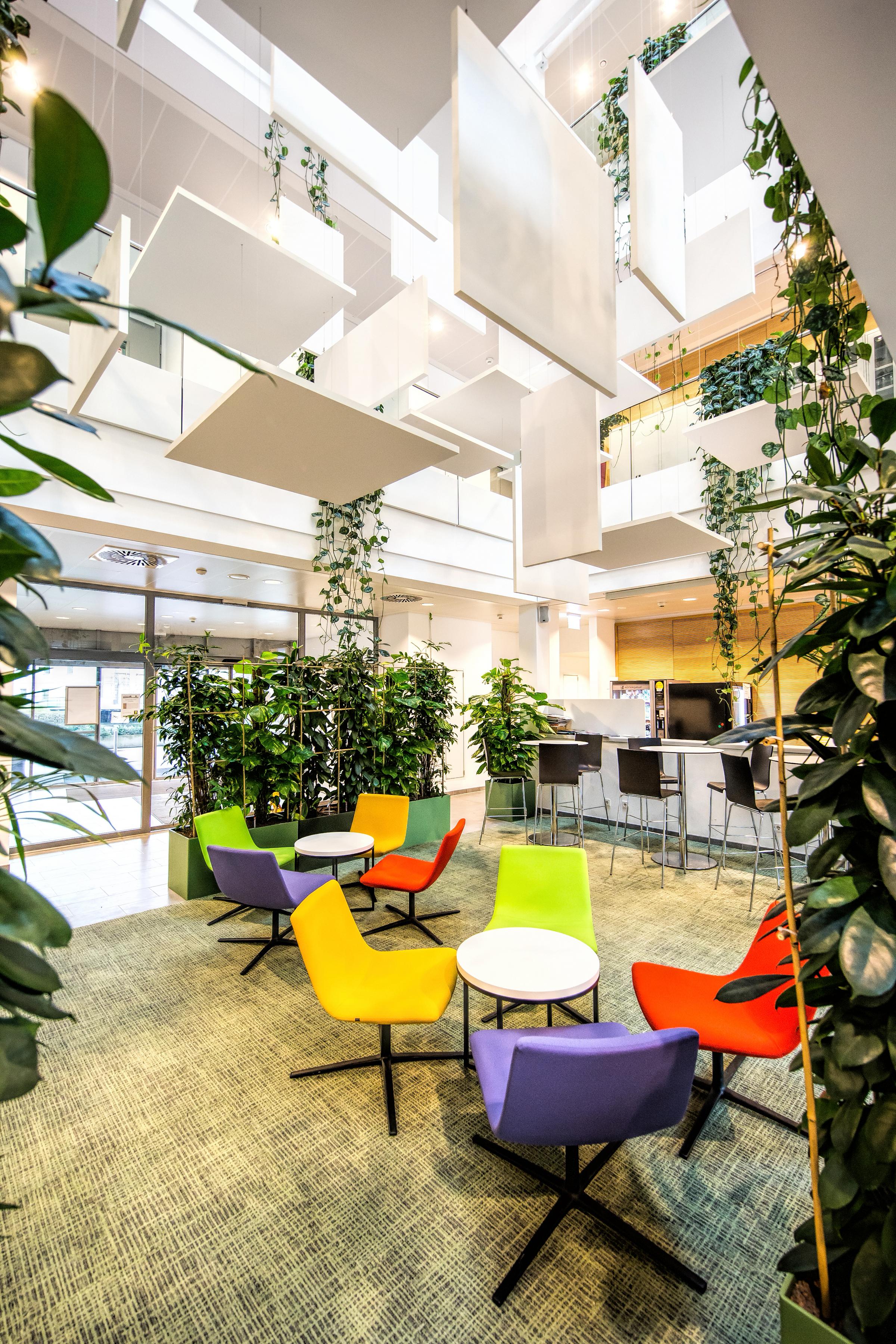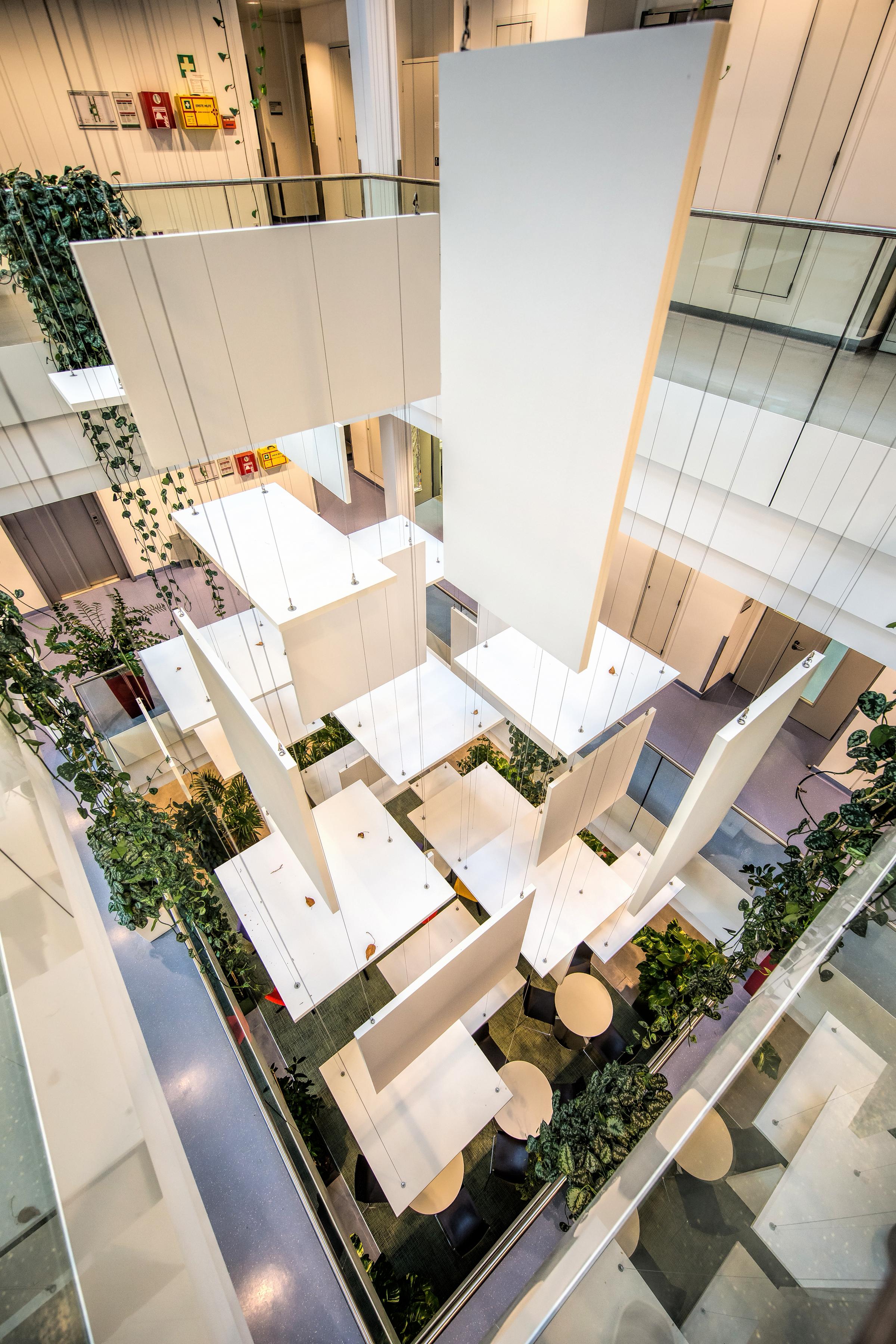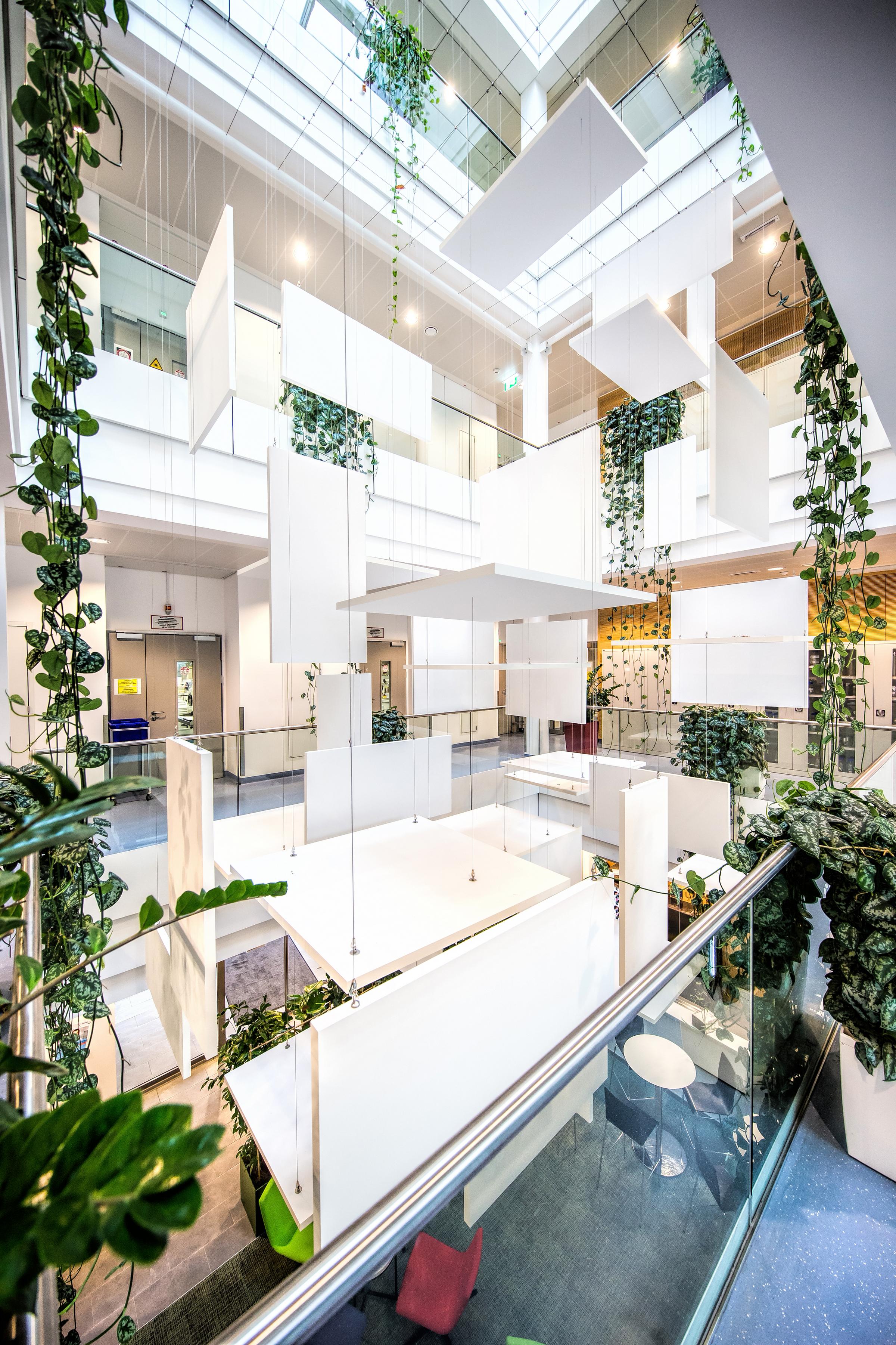 Afin de maintenir le caractère de l'atrium et de laisser entrer la lumière naturelle, des panneaux suspendus Ecophon Solo™ ont été installés sur plusieurs niveaux. L'interaction entre la suspension verticale et horizontale des panneaux crée un effet dynamique qui s'étend sur plusieurs étages, permettant à l'installation d'être vue sous tous les angles. En combinaison avec les plantes suspendues, une expérience harmonieuse pour l'ouïe et la vue est ainsi créée.