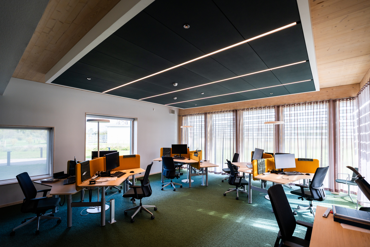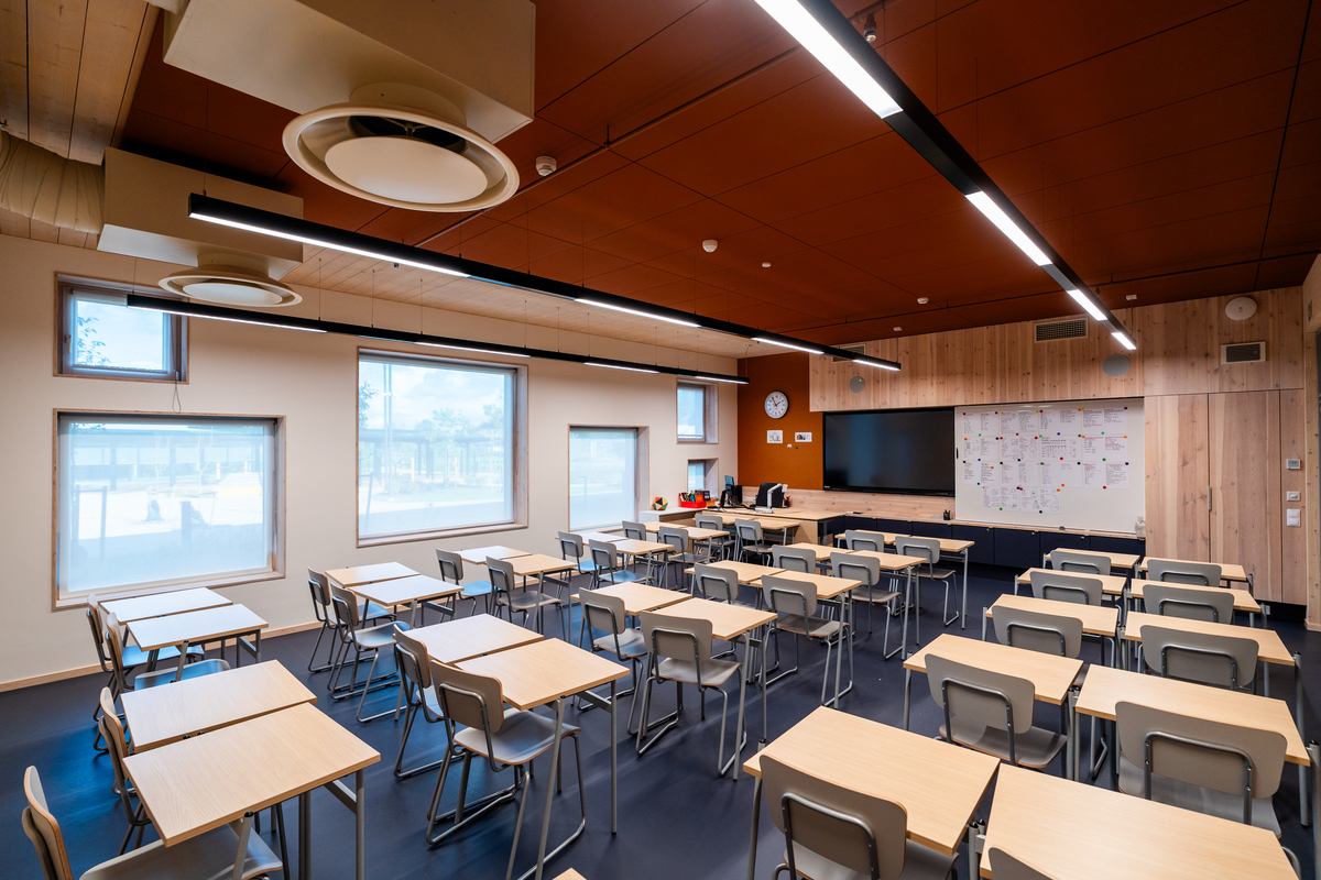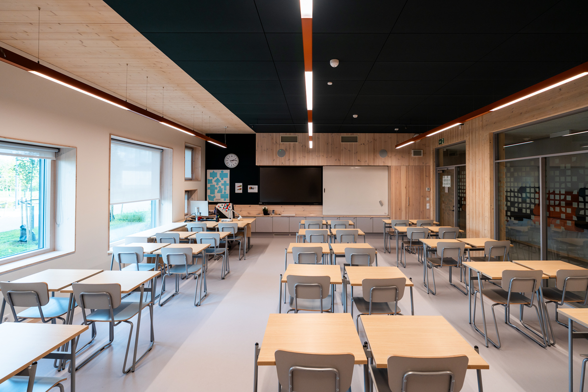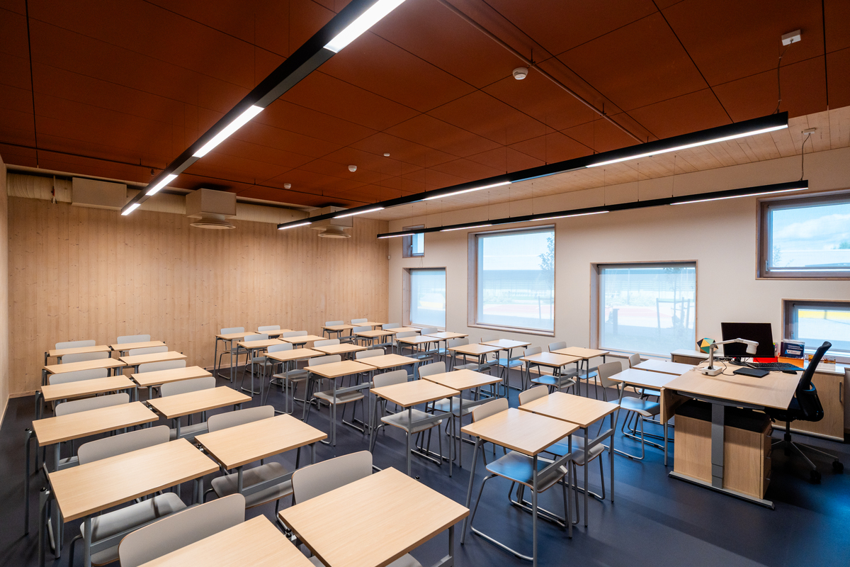 I klassrummen finns undertaksplattor av typen Ecophon Focus™ Levels i utvalda accentkulörer, som kombinerar effektiv ljudabsorption med ett livfullt visuellt uttryck. I biblioteket, trappområdena och entrézonerna används Ecophon Focus™ Ds för hög akustisk prestanda och ett rent, diskret uttryck som harmoniserar med arkitekturen.