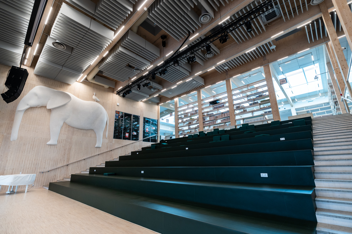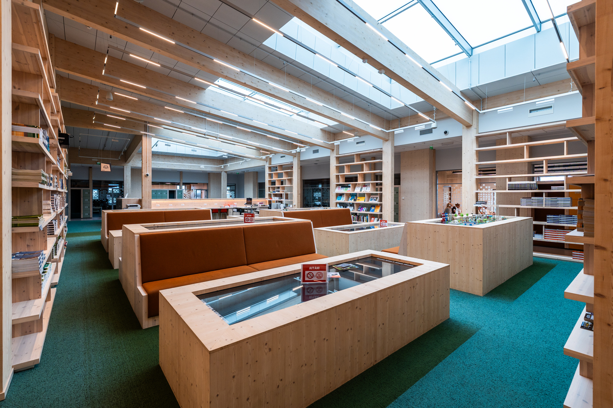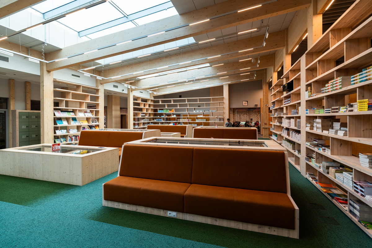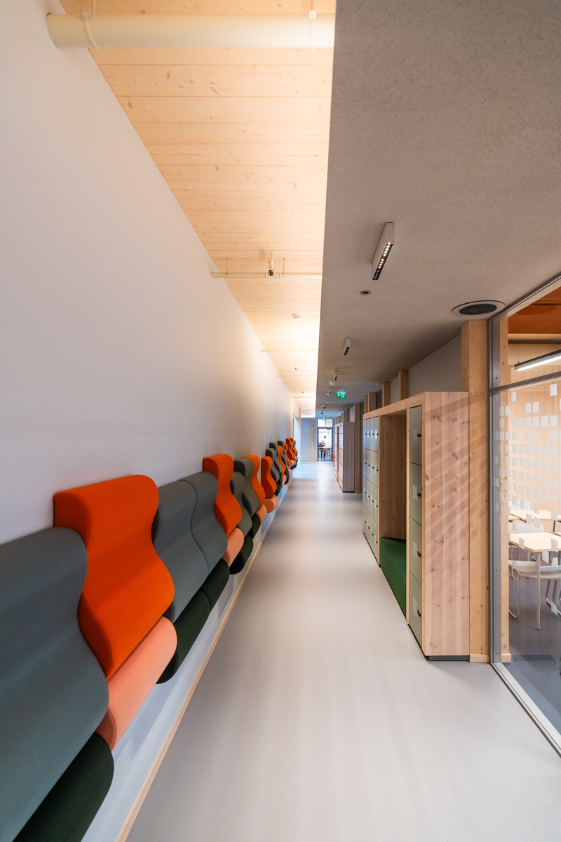 I klassrummen finns undertaksplattor av typen Ecophon Focus™ Levels i utvalda accentkulörer, som kombinerar effektiv ljudabsorption med ett livfullt visuellt uttryck. I biblioteket, trappområdena och entrézonerna används Ecophon Focus™ Ds för hög akustisk prestanda och ett rent, diskret uttryck som harmoniserar med arkitekturen.