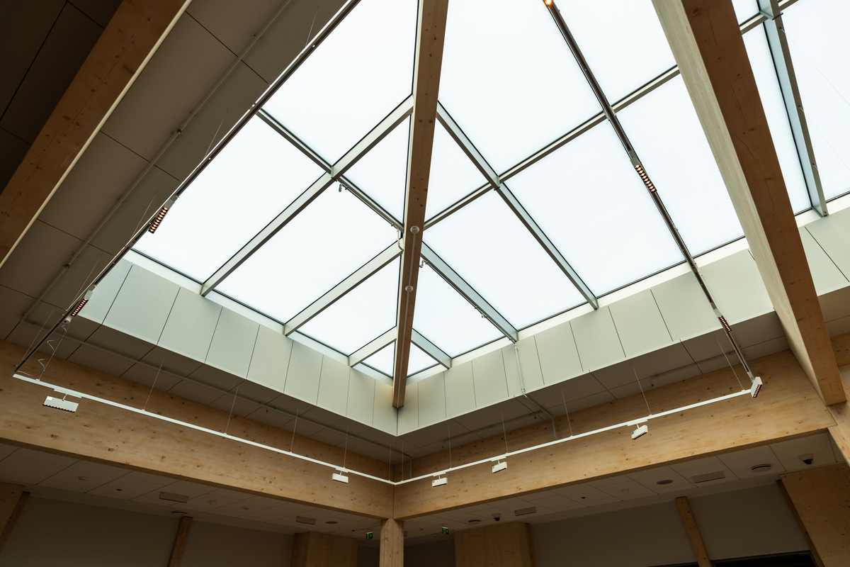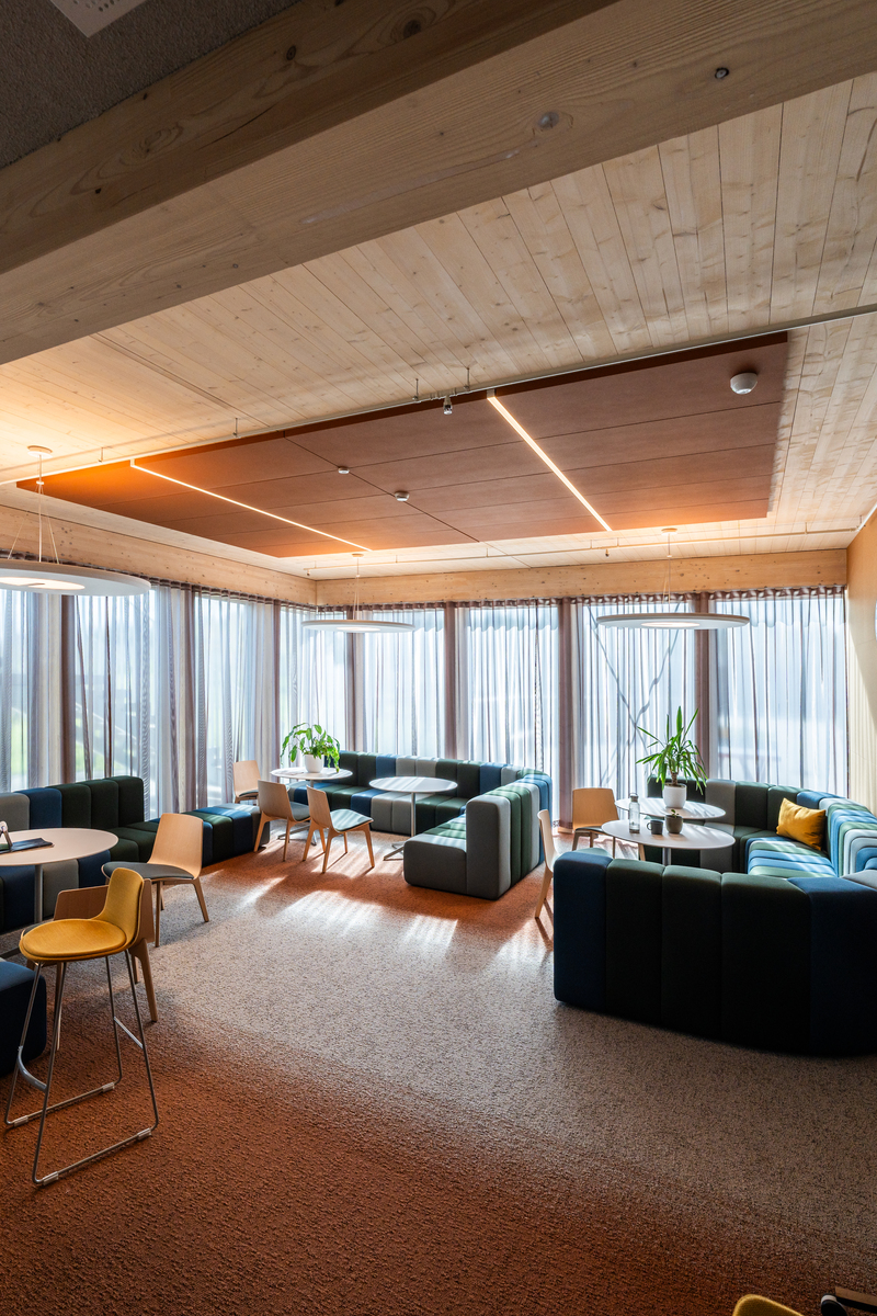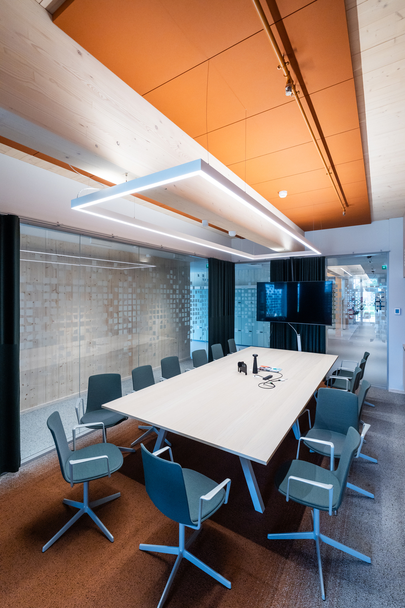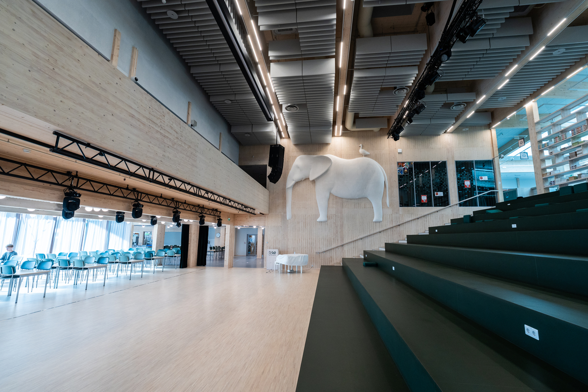 Särskild omsorg har lagts på akustiken för att stödja både lärande och social interaktion. I den multifunktionella samlingsytan används Ecophon Solo™ Baffle frihängande enheter som integreras i taket för att minska efterklangstiden och samtidigt bevara rummets öppna karaktär.